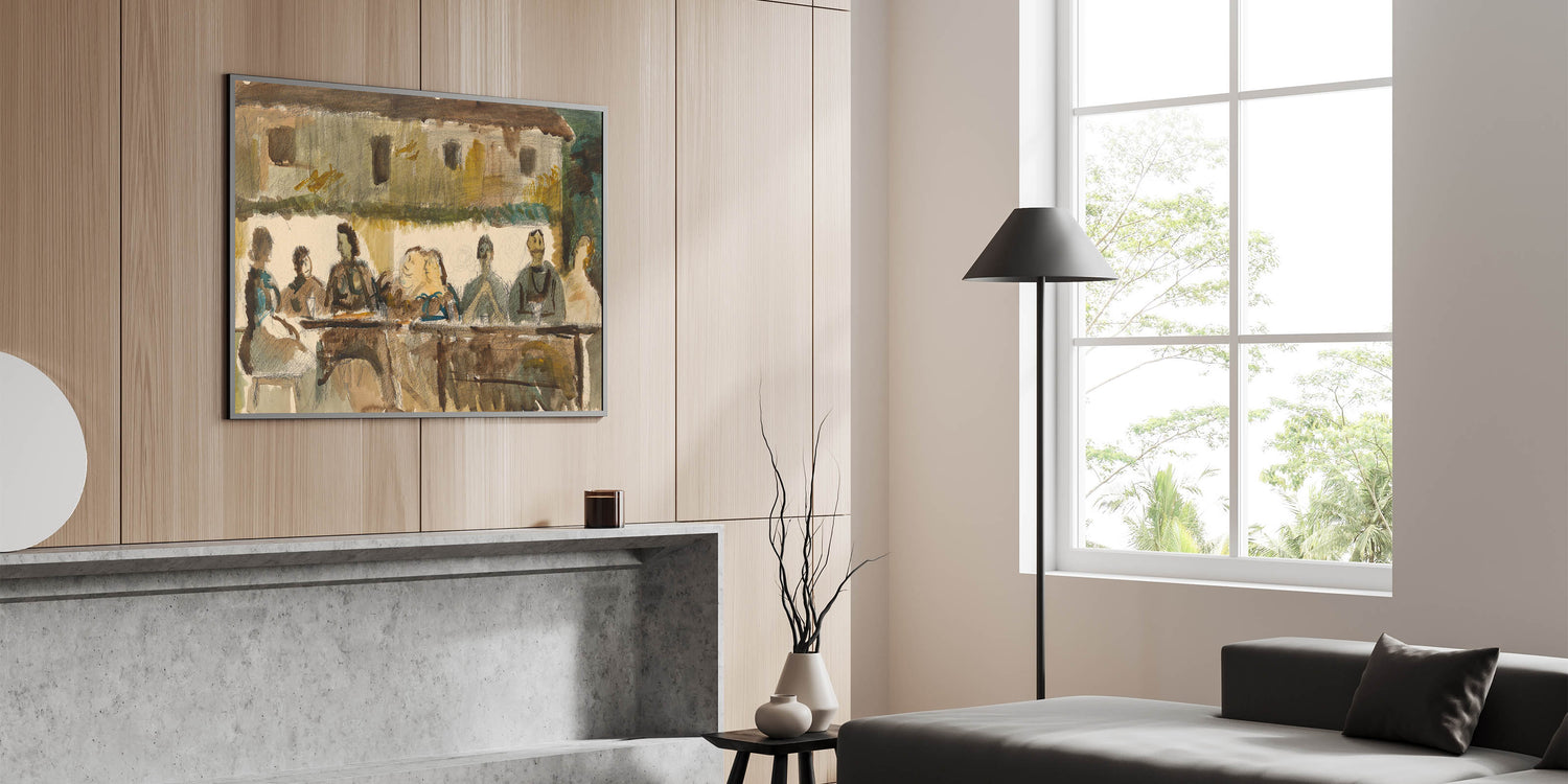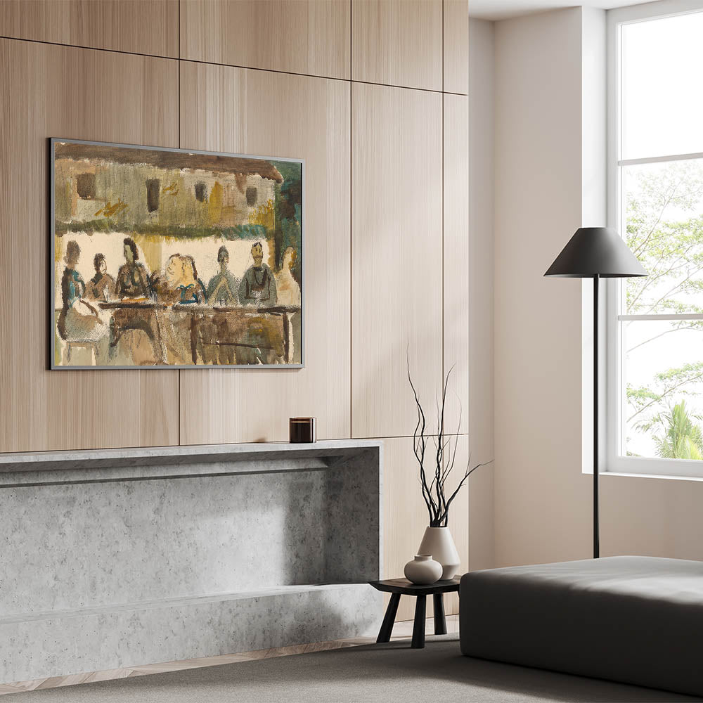 This modern art print brings an authentic, cozy feel to your decor. Its unique portrayal of people gathered in a relaxed setting makes it a great choice for spaces that need a touch of warmth and human connection.