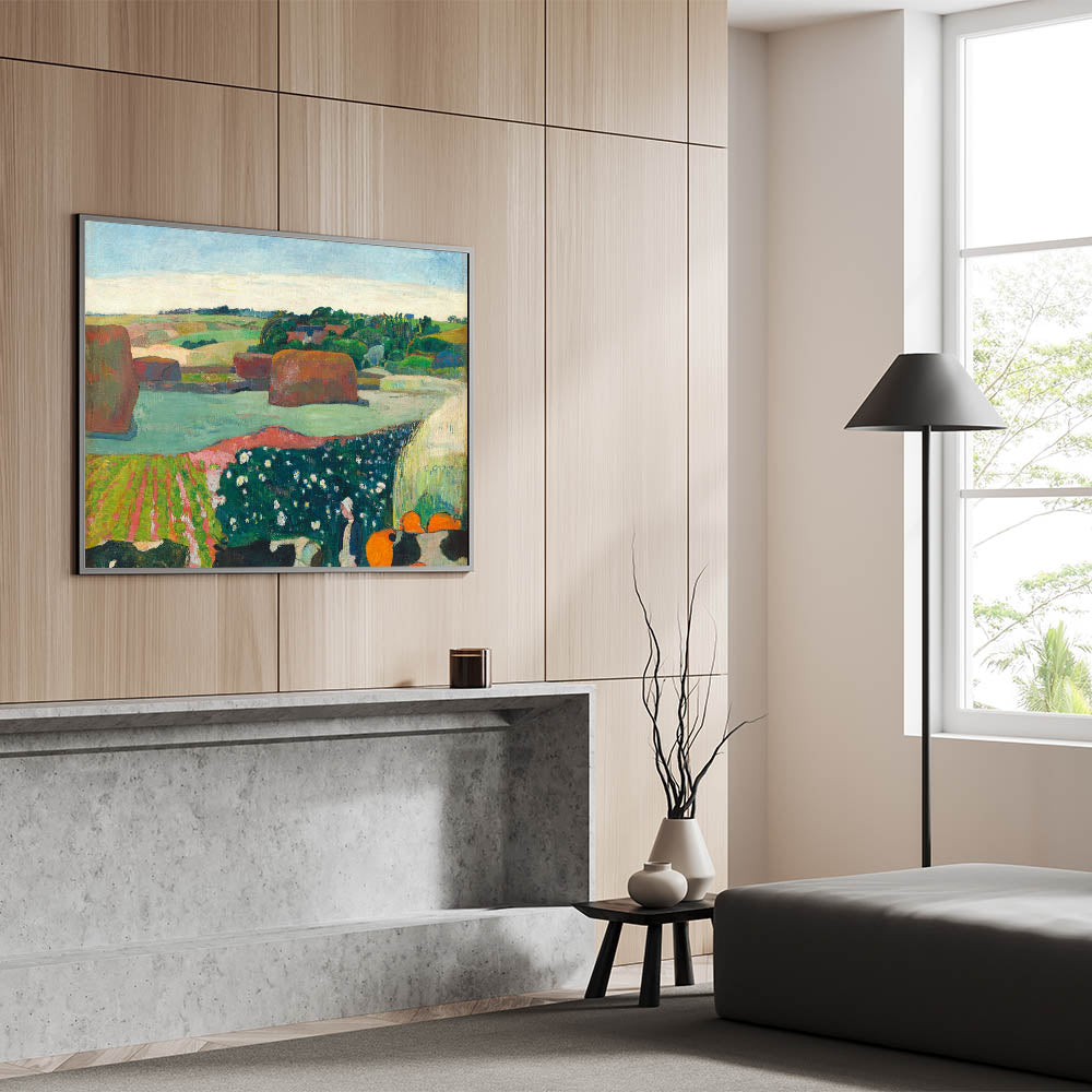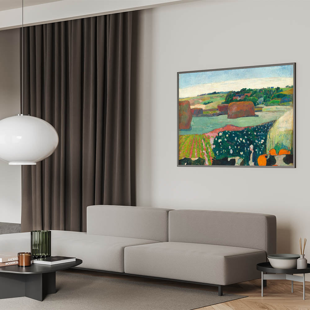 Bring the serene beauty of the countryside into your home with Paul Gauguin's "Haystacks in Brittany." This modern wall art print captures the peaceful rural landscape of Brittany, featuring haystacks, grazing cows, and a farmer at work. The vibrant color palette of greens, blues, and earthy tones reflects the richness of nature, making it an ideal piece for those who love pastoral scenes and classic art.