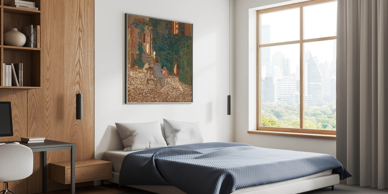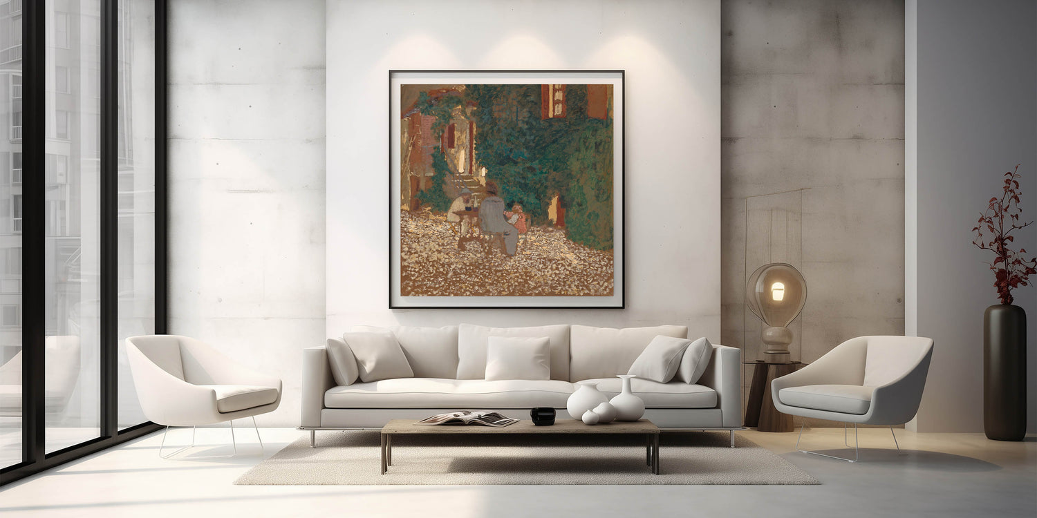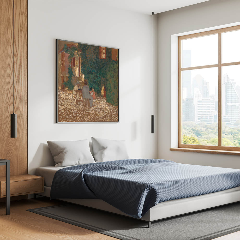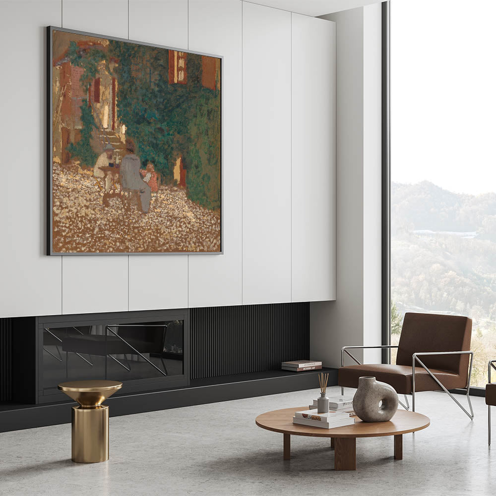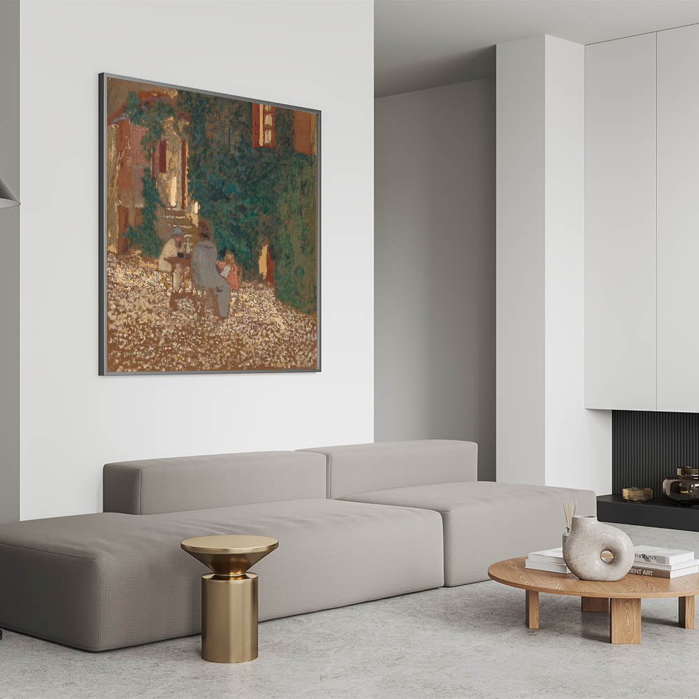 Invite a sense of warmth and nostalgia into your home with this charming modern wall art piece, depicting a quiet garden gathering. The soft, rustic color palette of greens, browns, and subtle hints of red captures the essence of a peaceful, intimate outdoor moment. This artwork’s textured details and earthy tones make it an ideal addition to cozy and contemporary spaces, adding a timeless elegance to your decor.