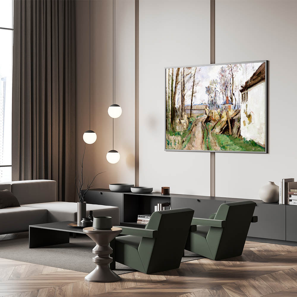Bring the charm of the countryside into your home with this Modern Wall Art, depicting a serene village road framed by lush greenery and rustic buildings. The soft brushstrokes and warm tones capture the simplicity and beauty of rural life, making it a perfect addition to Trendy Home Décor. The harmonious blend of greens, browns, and blues adds a natural elegance to any space.