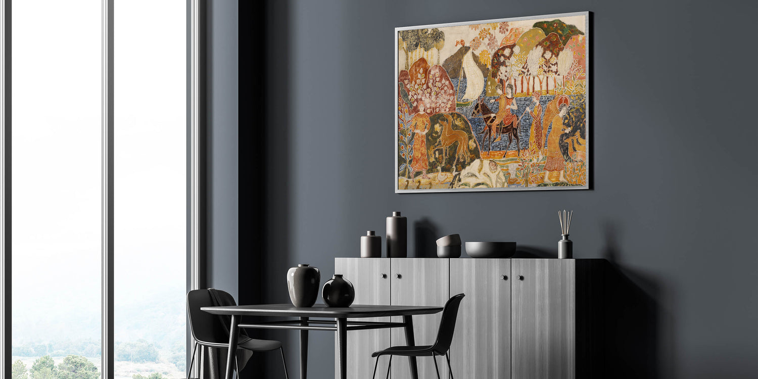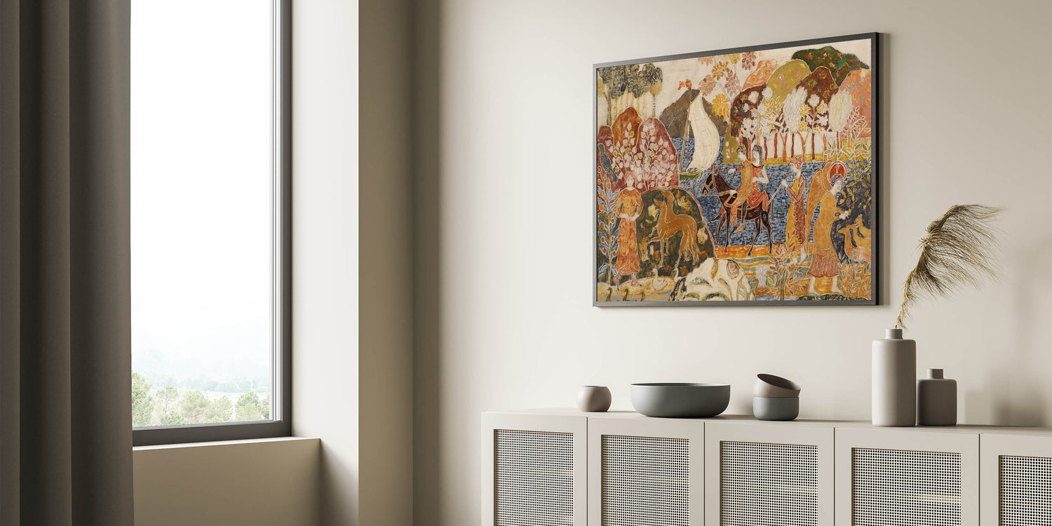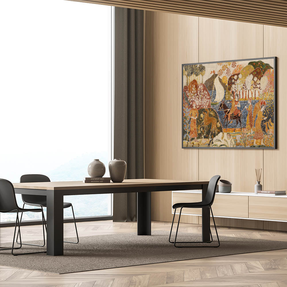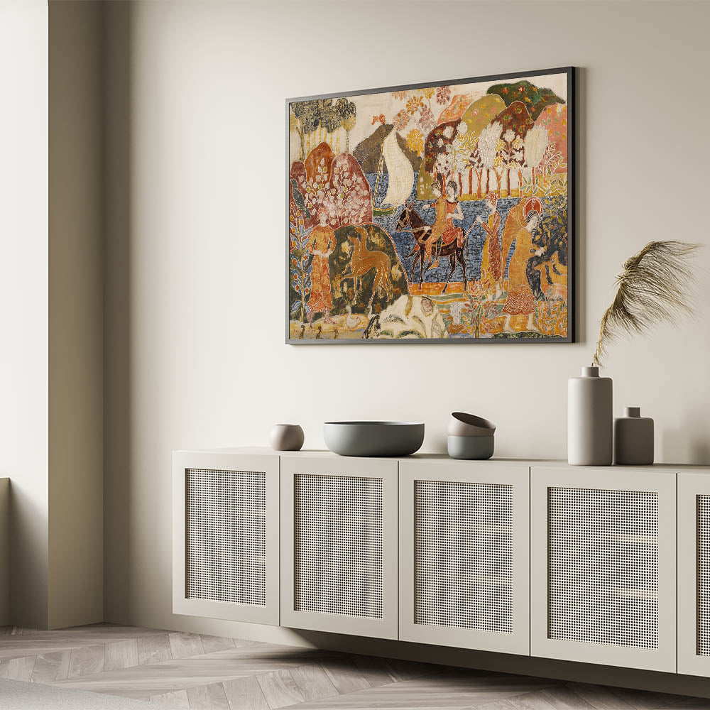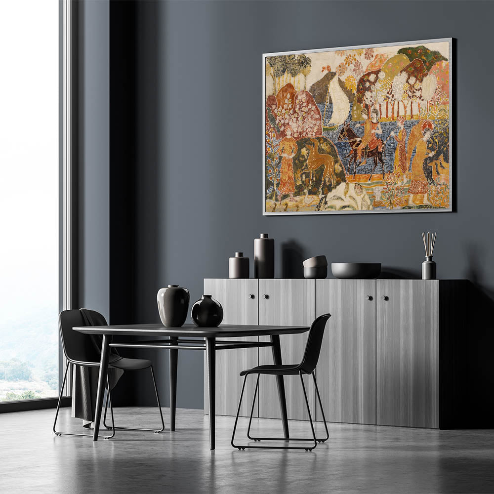 Capture the beauty of storytelling and vibrant artistry with this stunning Modern Wall Art piece. Featuring a serene landscape with two figures on a mule amidst lush foliage, this artwork radiates charm and elegance. The intricate details and warm tones make it a perfect addition to trendy home decor and modern design elements, bringing life and creativity to your space.