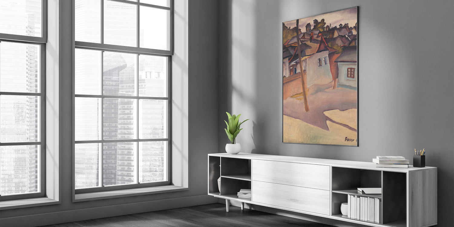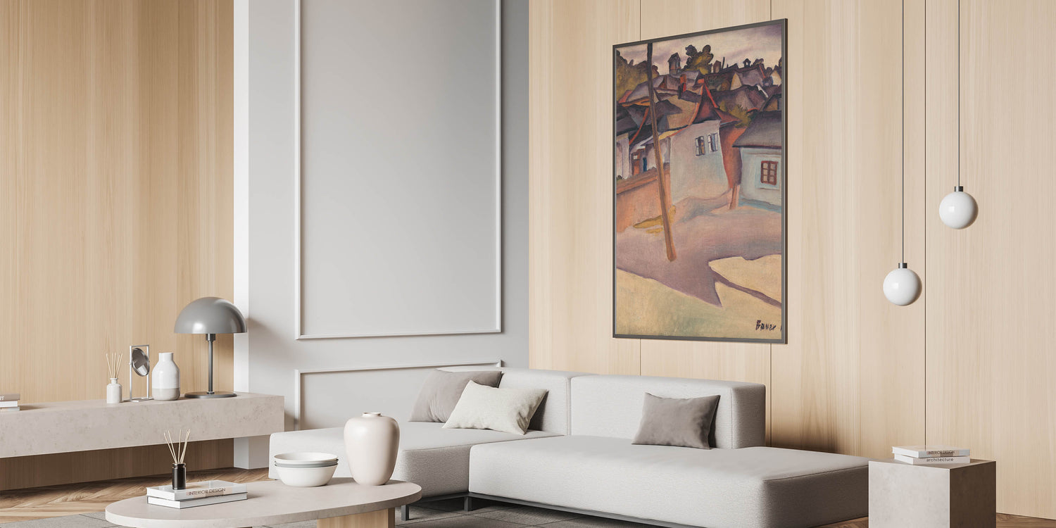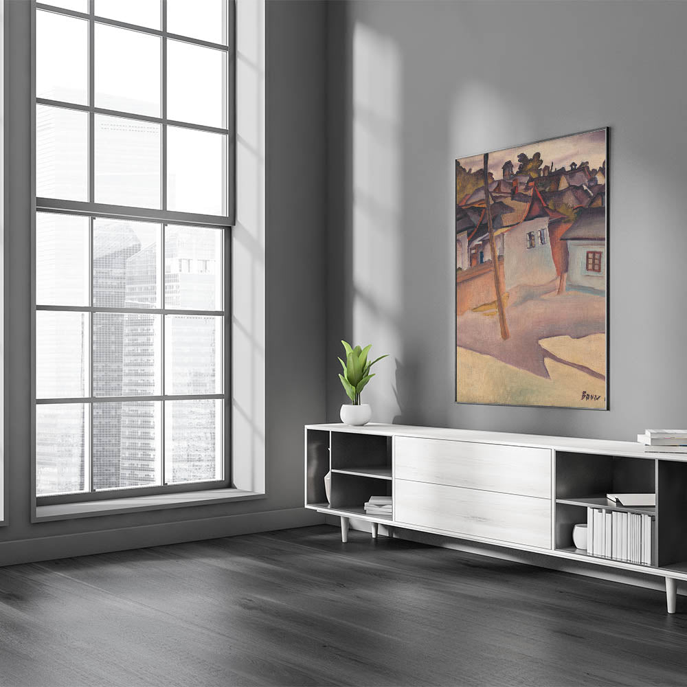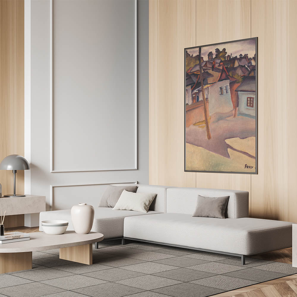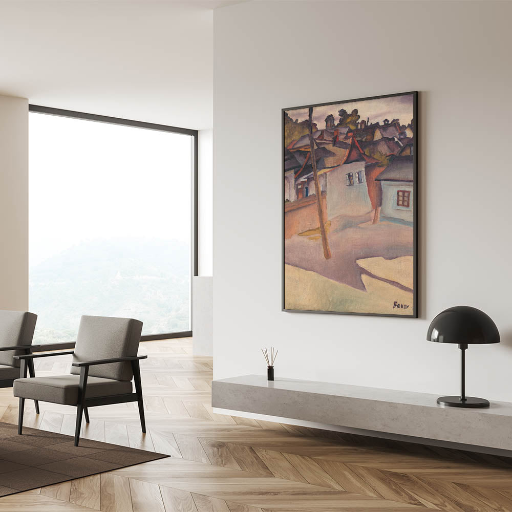 This charming modern wall art print, titled Gypsy Camp, by Konštantín Bauer, presents a unique depiction of a quiet village scene. The earthy colors and flowing shapes lend a dreamy, nostalgic quality to the artwork, transporting viewers to a simpler, rustic setting. Perfect for lovers of scenic and architectural art, this piece makes an ideal addition to living rooms, hallways, or cozy nooks. With its harmonious blend of light and shadow, this print evokes warmth and calm, making it a beautiful complement to both modern and classic decor styles.