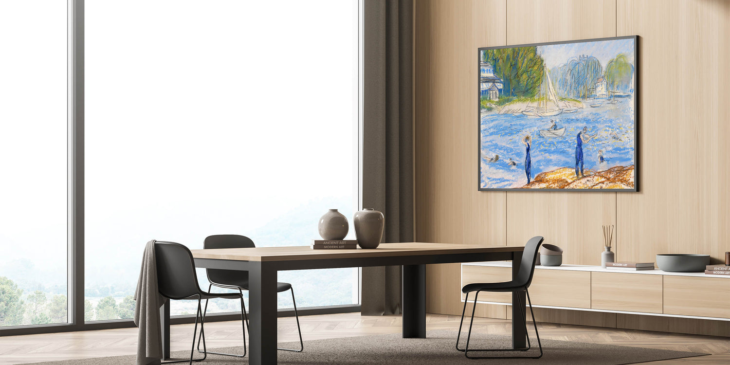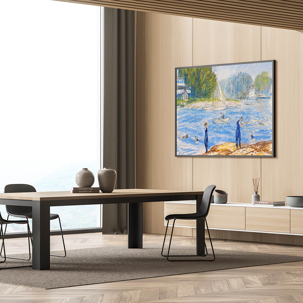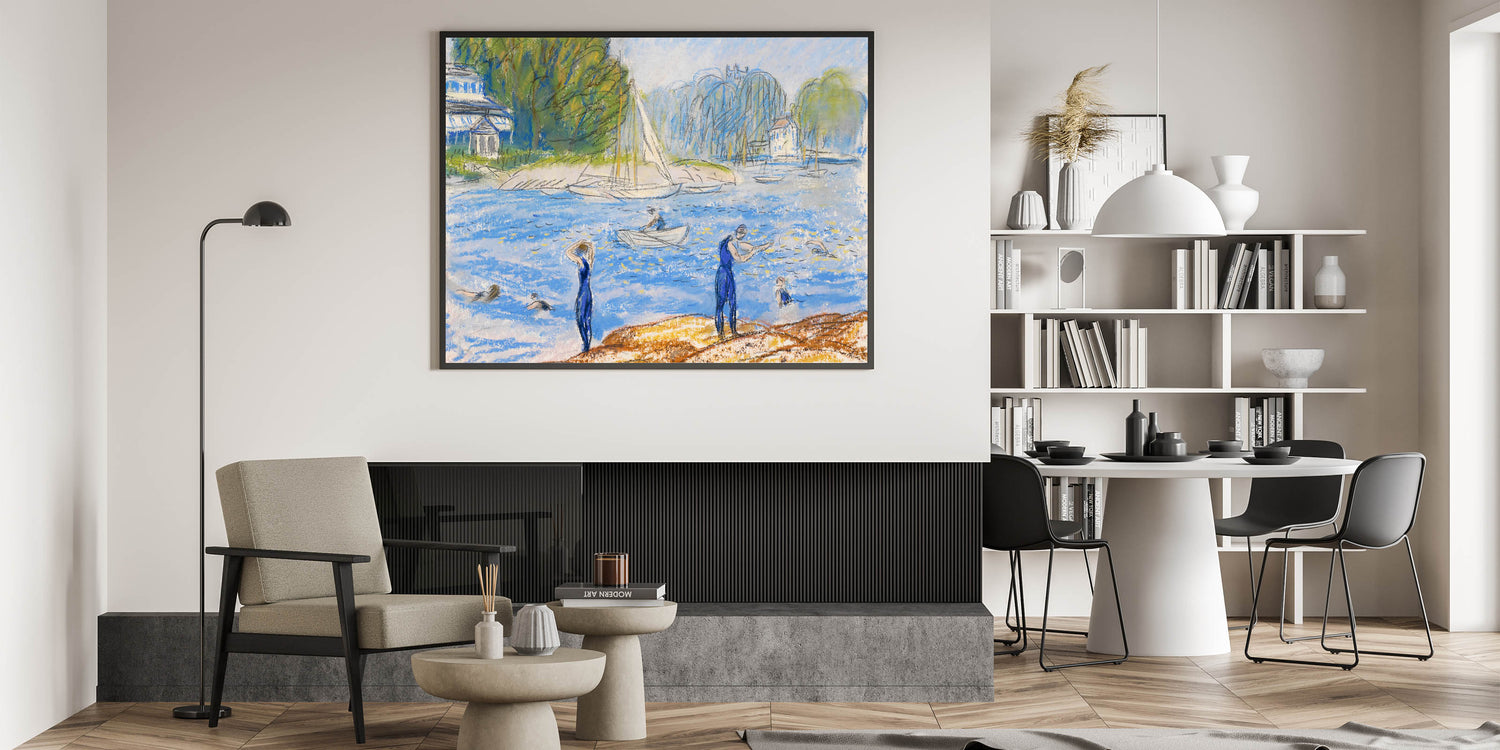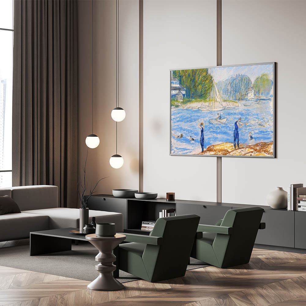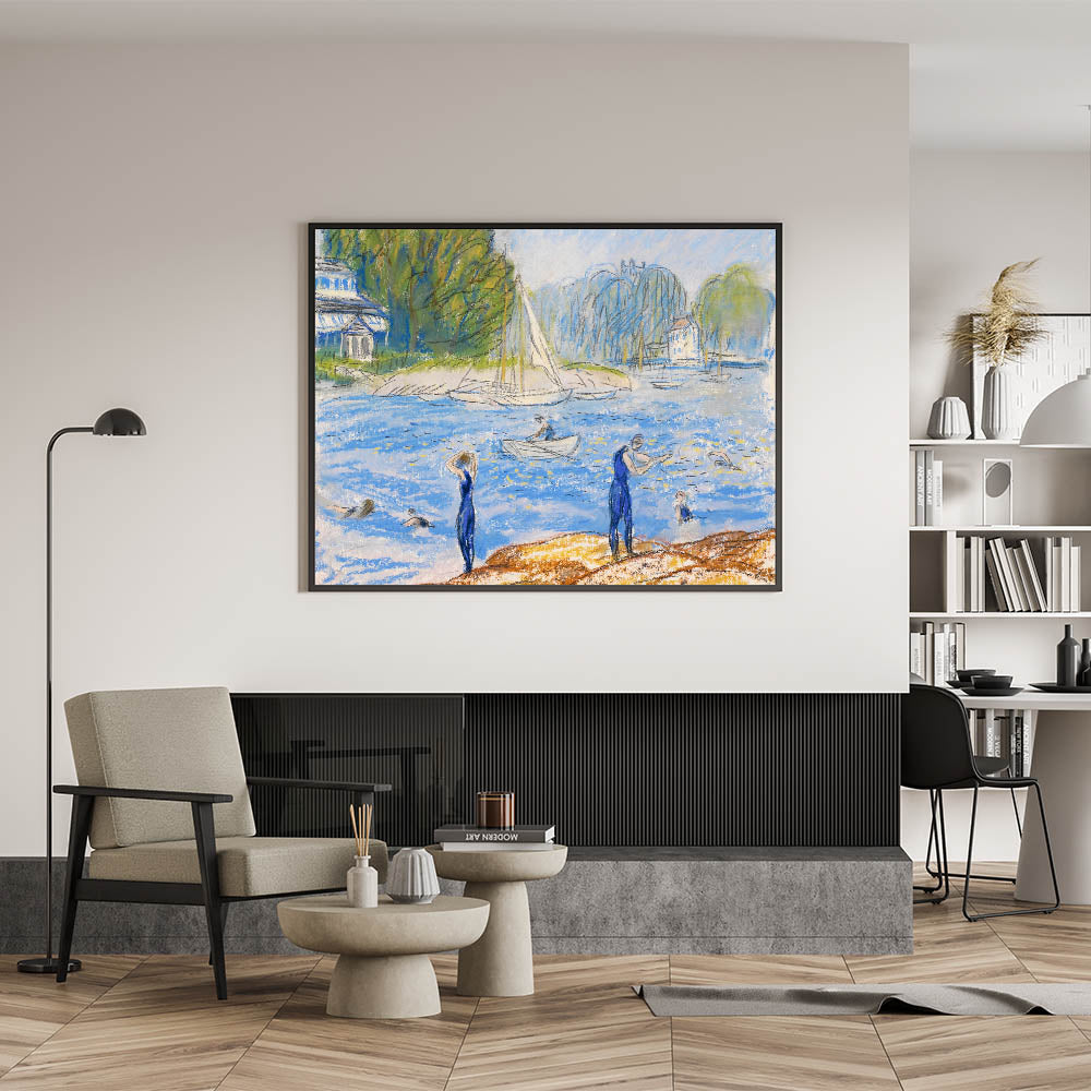 Brighten up your space with this Modern Wall Art piece, capturing a lively riverside scene with bathers enjoying a warm, sunny day. The vibrant blues, greens, and soft yellows create a refreshing atmosphere, making this Contemporary Art piece ideal for those who appreciate Stylish Wall Art inspired by the beauty of nature and joyful summer moments.
