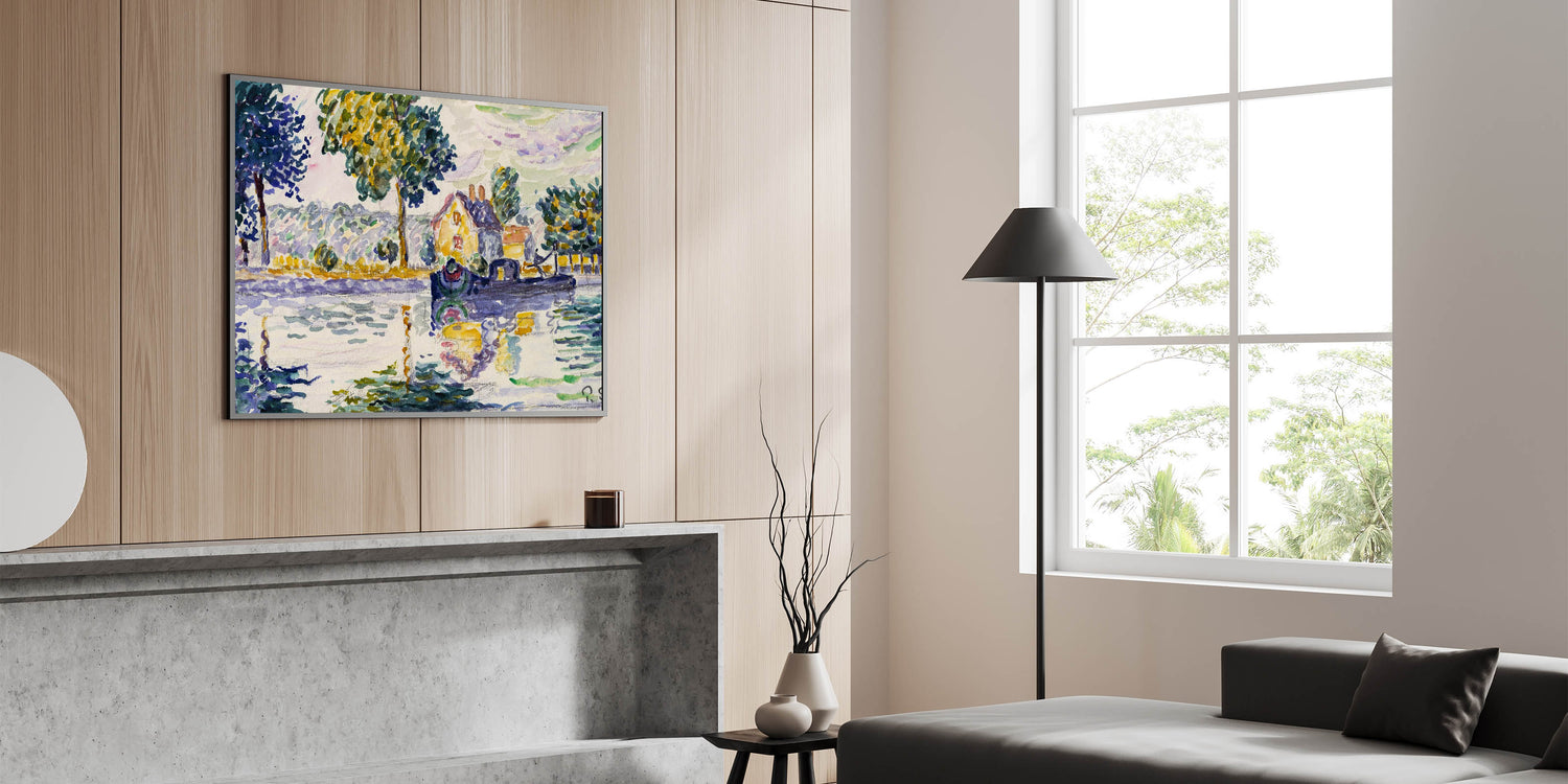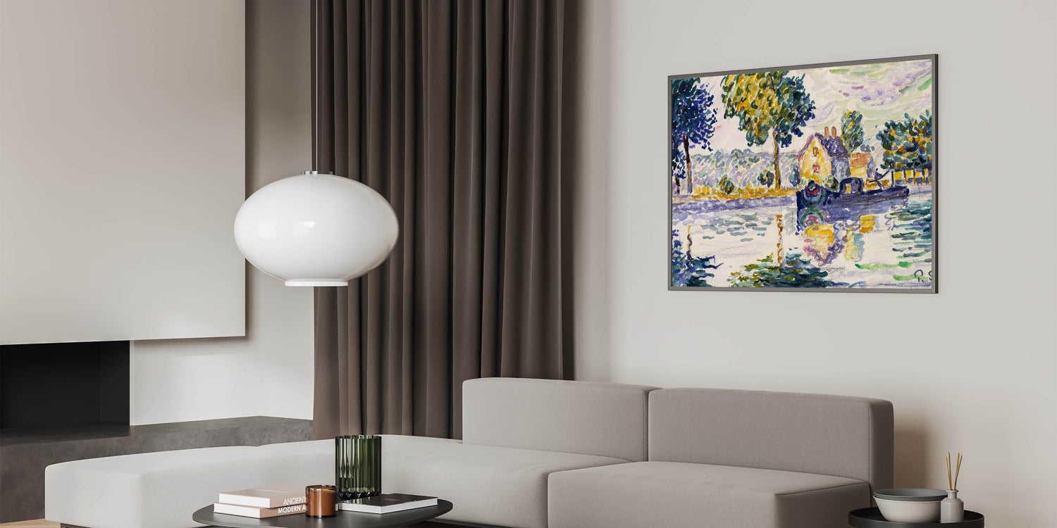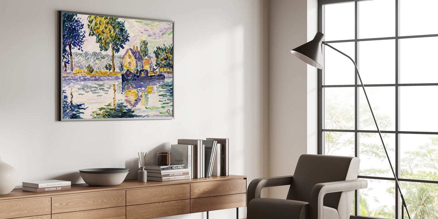 Bring the serene beauty of nature into your home with View of the Seine, Samois by Paul Signac. This piece of Modern Wall Art is a captivating interpretation of the Seine riverbank, rendered in Signac's signature pointillist style. Vibrant greens, calming blues, and golden yellows combine to create a tranquil riverside atmosphere. The charming house and reflection in the water add depth and balance to this peaceful composition.