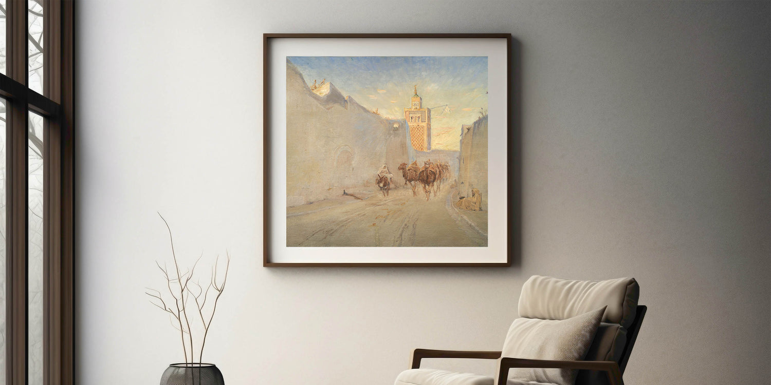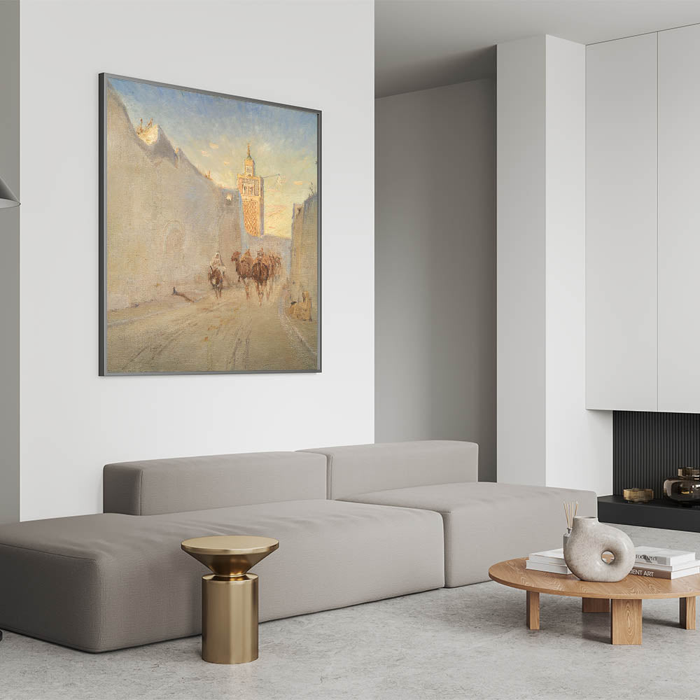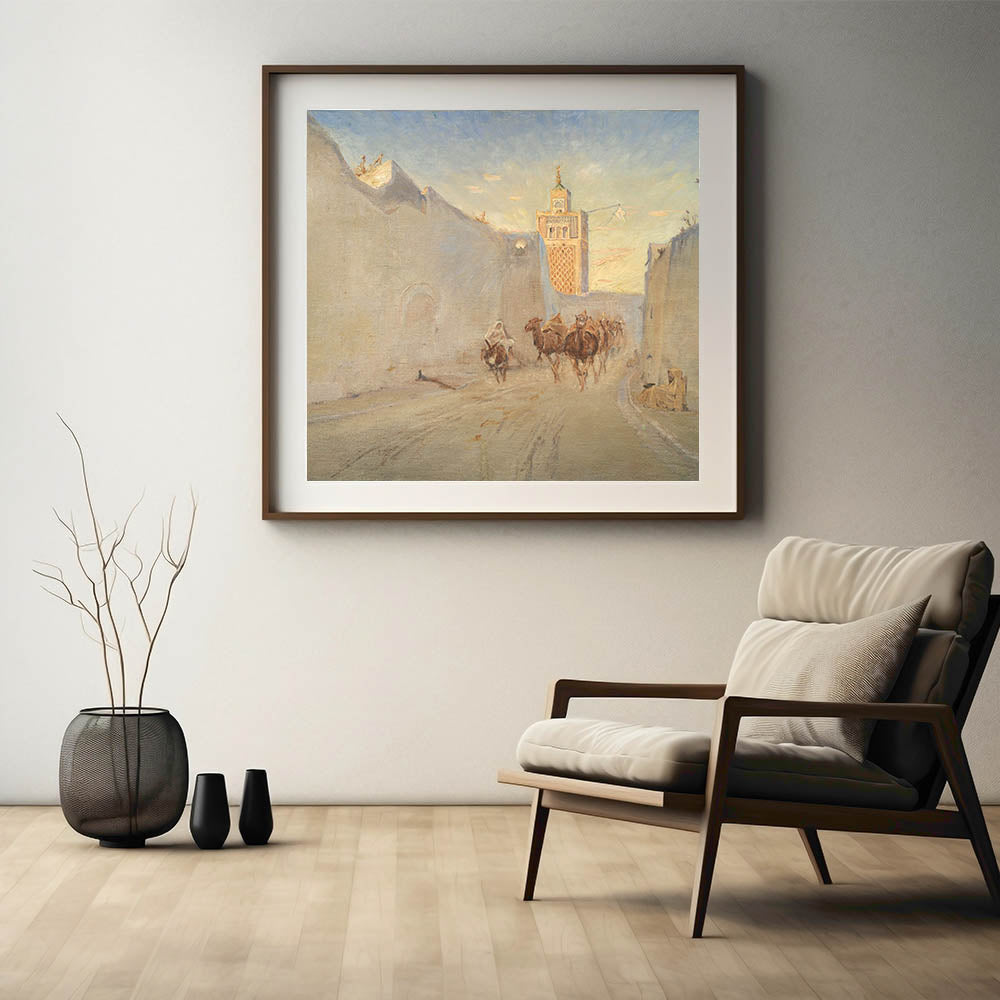 Add an exotic touch to your home with this serene modern wall art featuring a tranquil street scene in Tunis. Capturing a timeless moment with camels and soft pastel tones, this artwork exudes elegance and charm. The intricate details of the ancient walls and the warm hues of the setting sun create a harmonious blend of history and modern design elements.