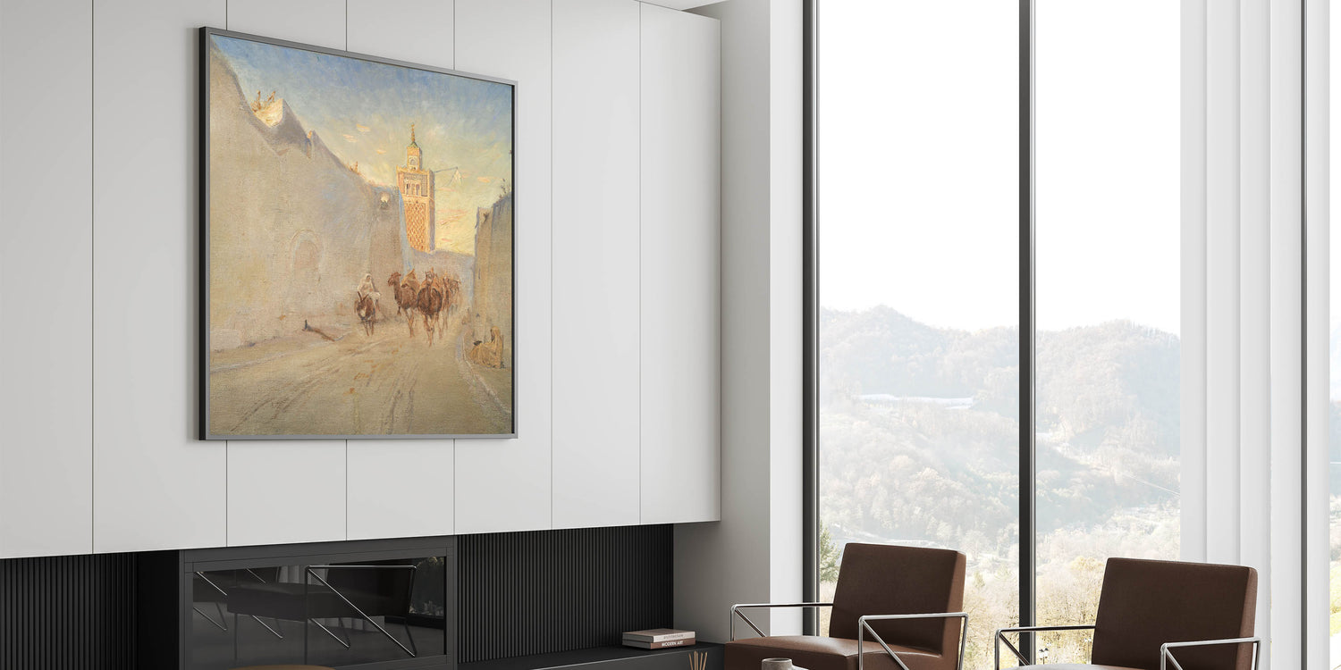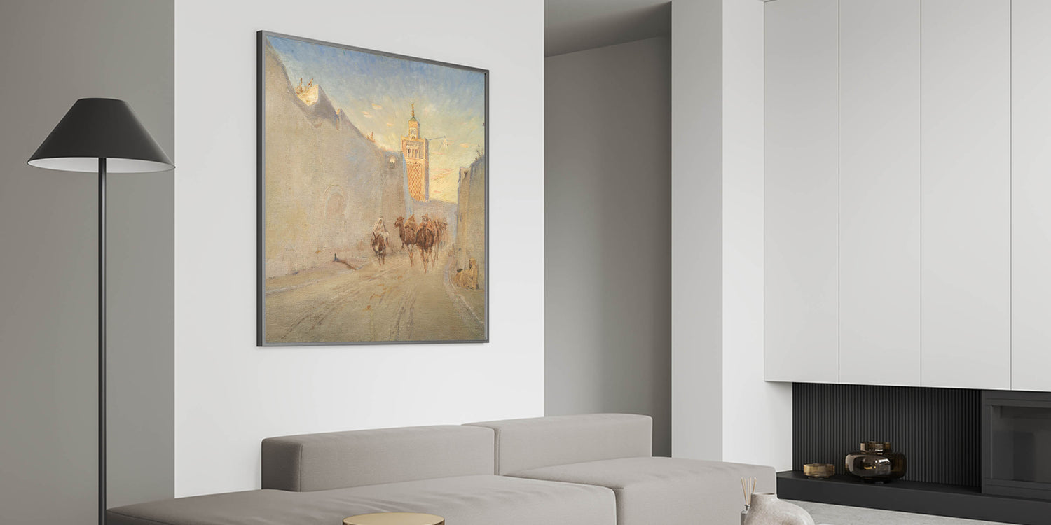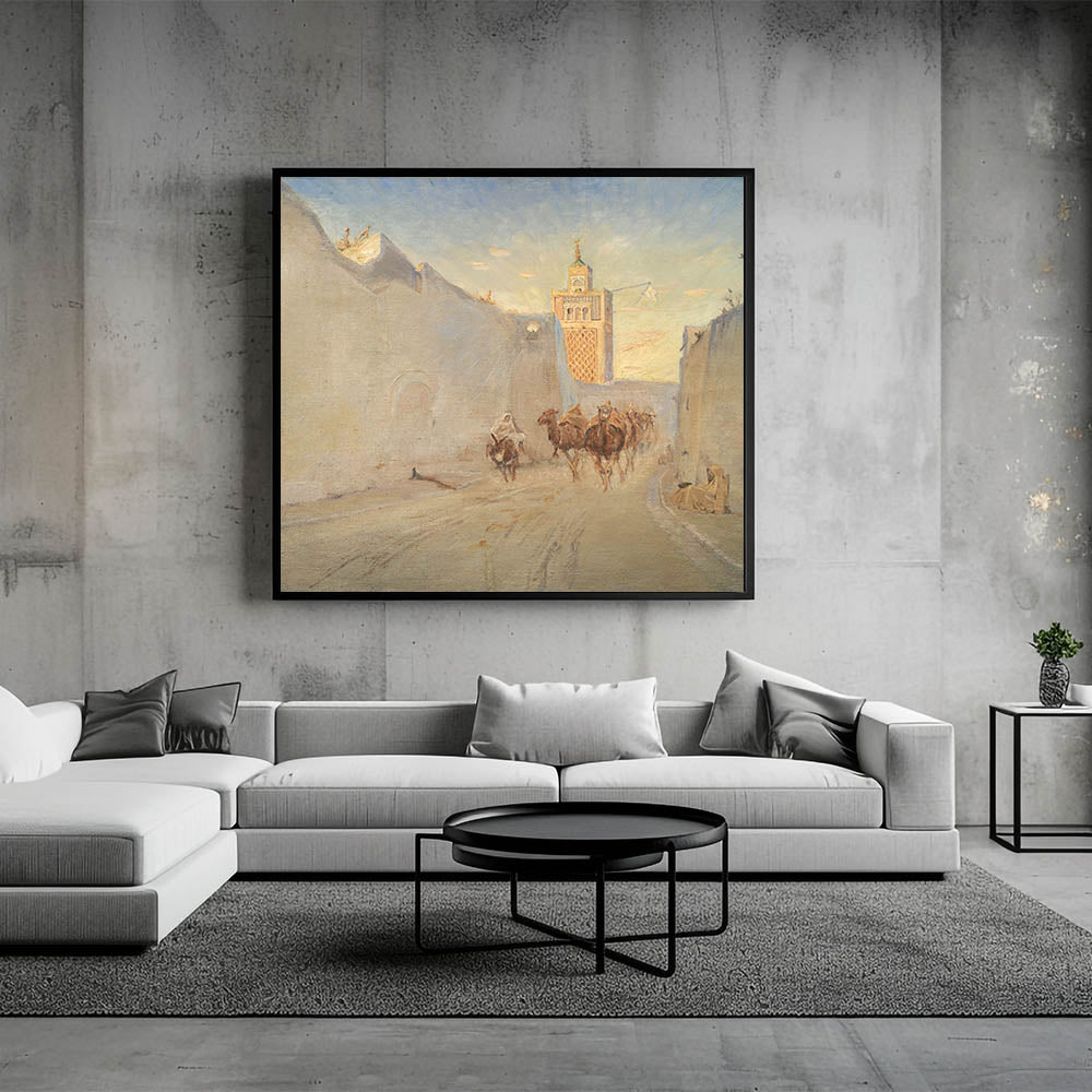 Add an exotic touch to your home with this serene modern wall art featuring a tranquil street scene in Tunis. Capturing a timeless moment with camels and soft pastel tones, this artwork exudes elegance and charm. The intricate details of the ancient walls and the warm hues of the setting sun create a harmonious blend of history and modern design elements.