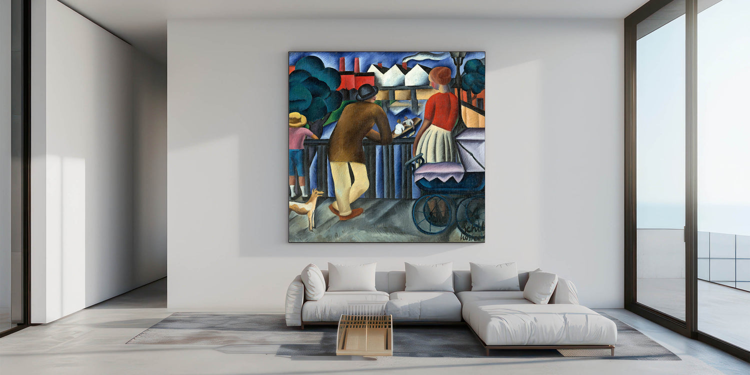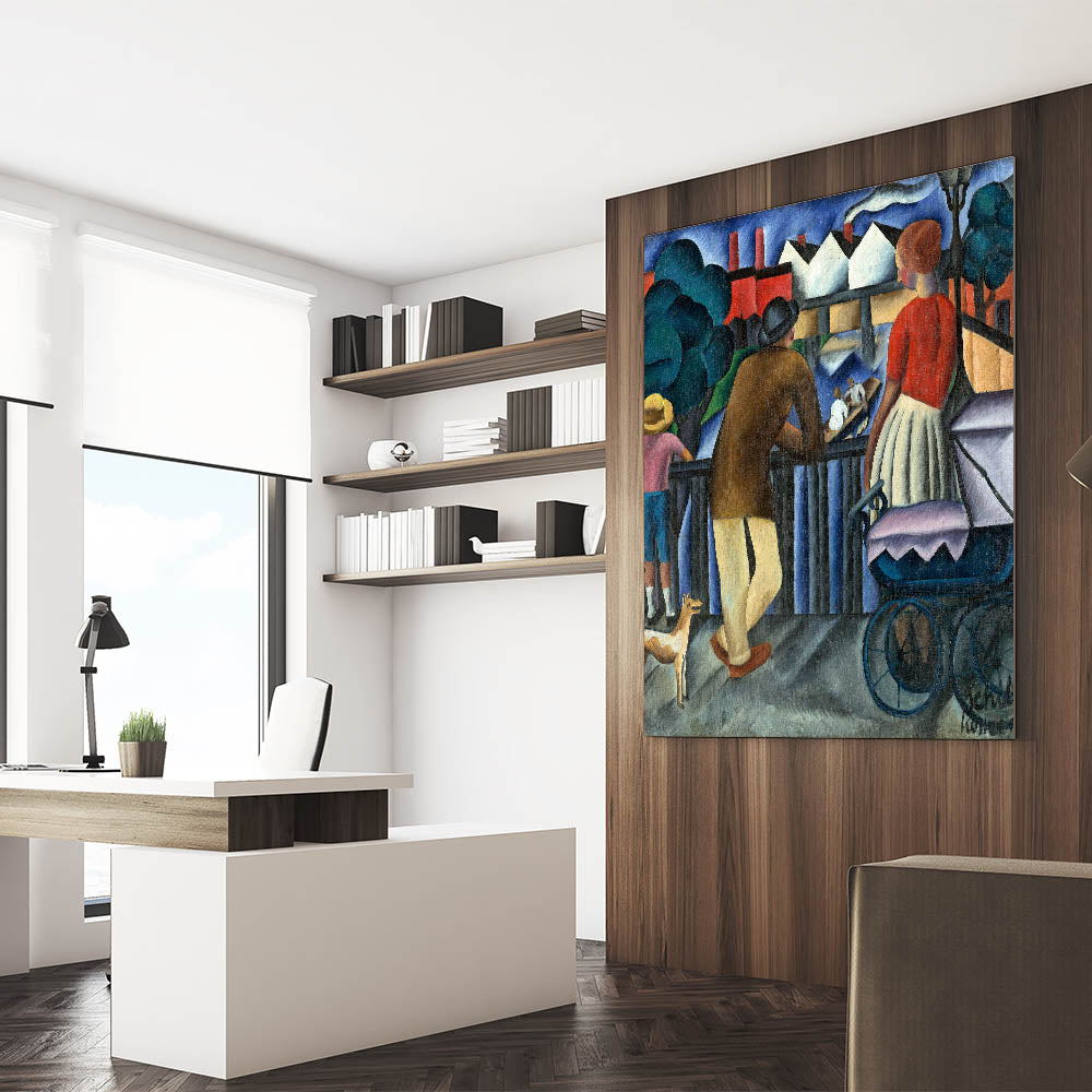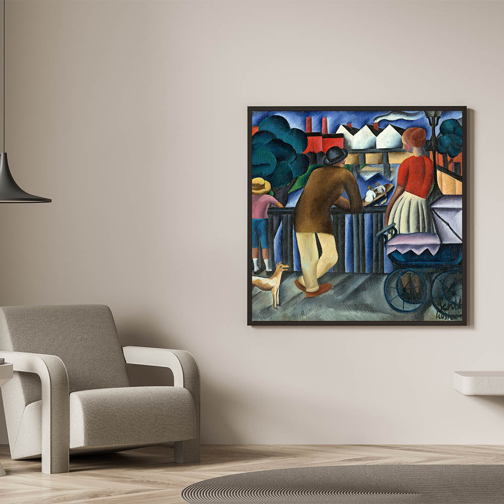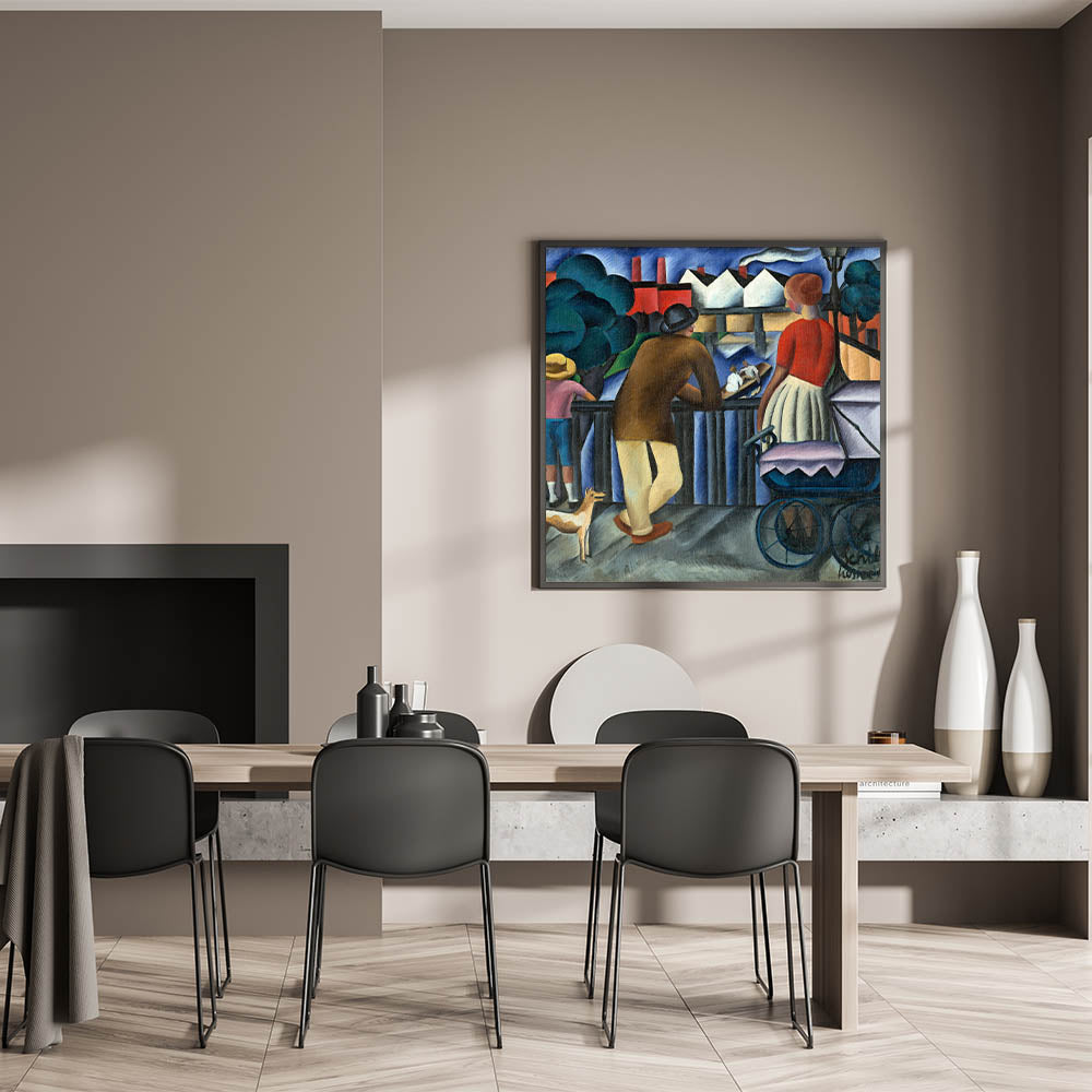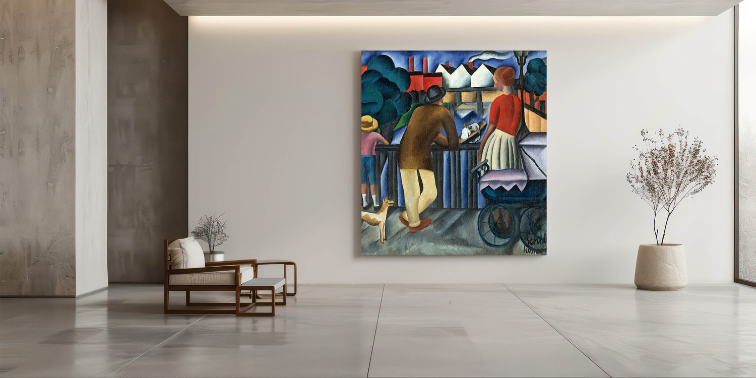 Add a touch of retro charm to your home with this captivating piece of Modern Wall Art. This artwork, featuring an urban scene with abstract figures, blends elements of modern and vintage design to create a unique and stylish look. With bold colors and geometric forms, this piece is perfect for anyone who loves trendy home decor that makes a statement.