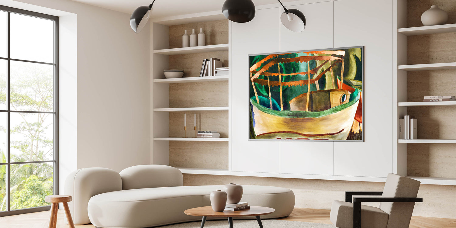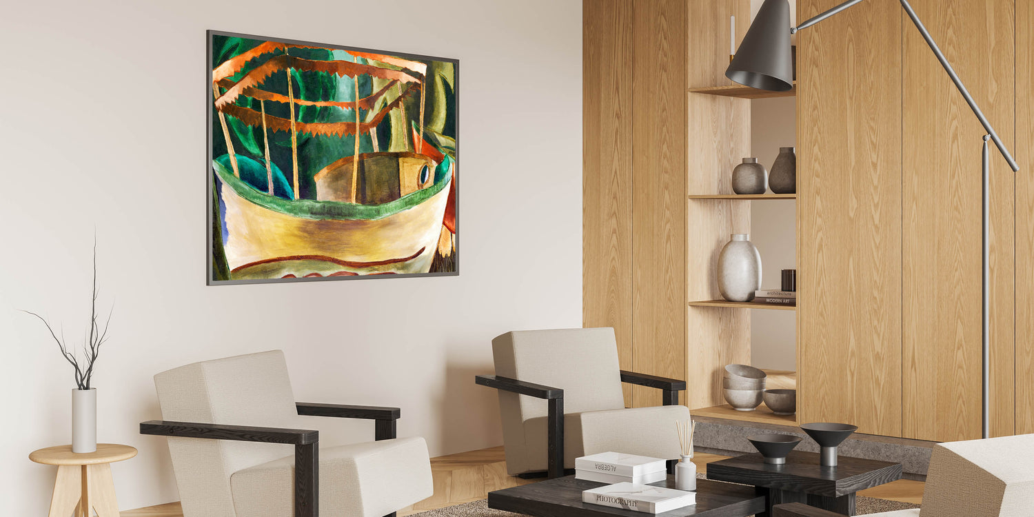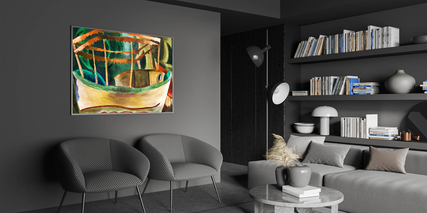 Immerse your space in the charm of Modern Wall Art with Arthur Dove's Fishboat. This captivating piece showcases a stylized boat with a vibrant palette of earthy greens, golden yellows, and rich oranges. The bold geometric lines and dynamic composition embody Dove’s mastery of abstraction, blending natural elements with modernist expression.