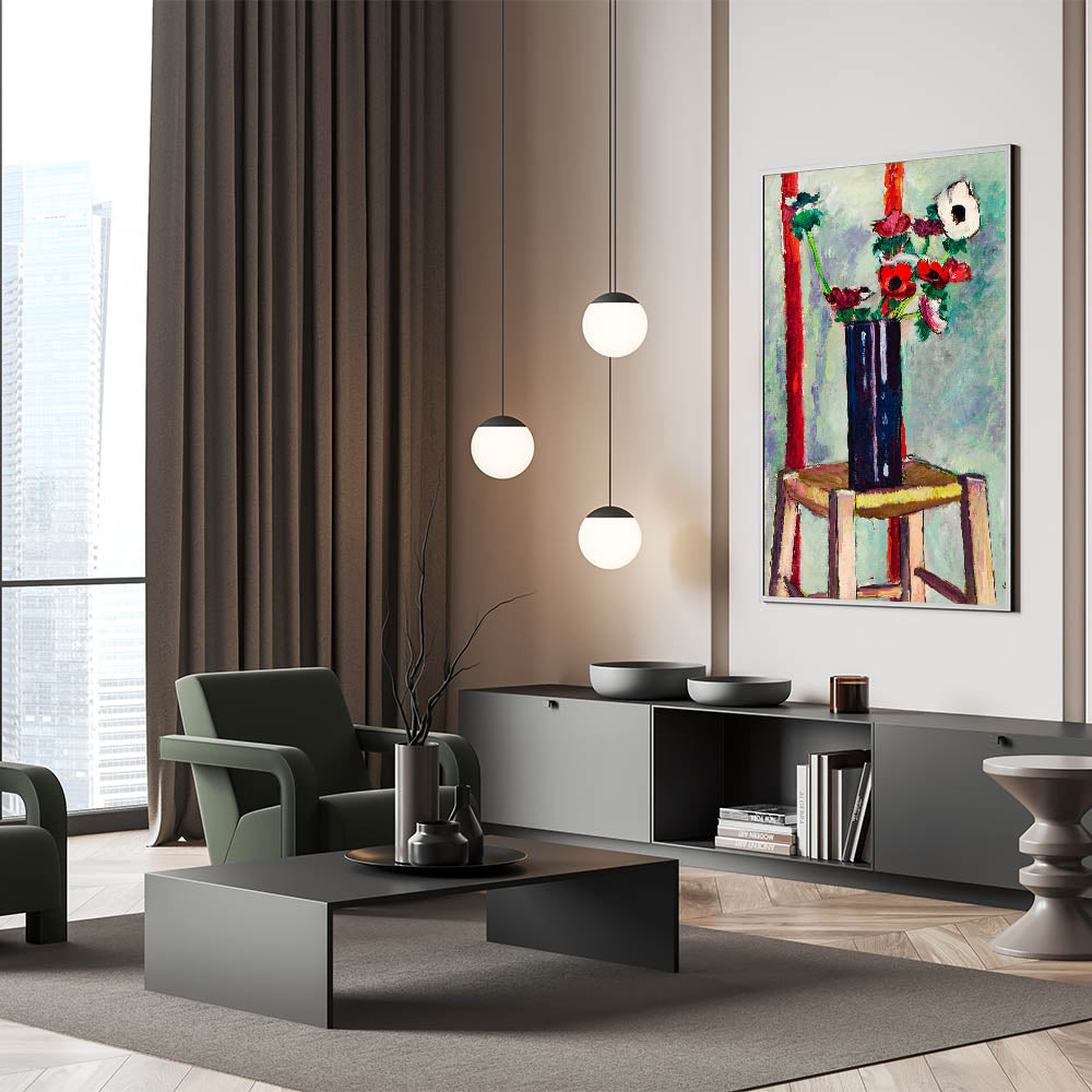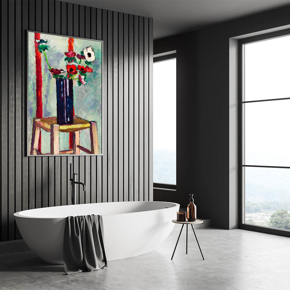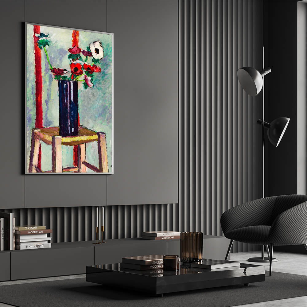 Brighten your space with this Modern Wall Art piece, showcasing a vibrant arrangement of anemones in a sleek, dark vase. This Abstract Modern Art combines striking reds, greens, and blues, making it a bold addition to any contemporary interior. Ideal for those who appreciate Trendy Home Decor, this piece adds a splash of color and a touch of sophistication to your walls.