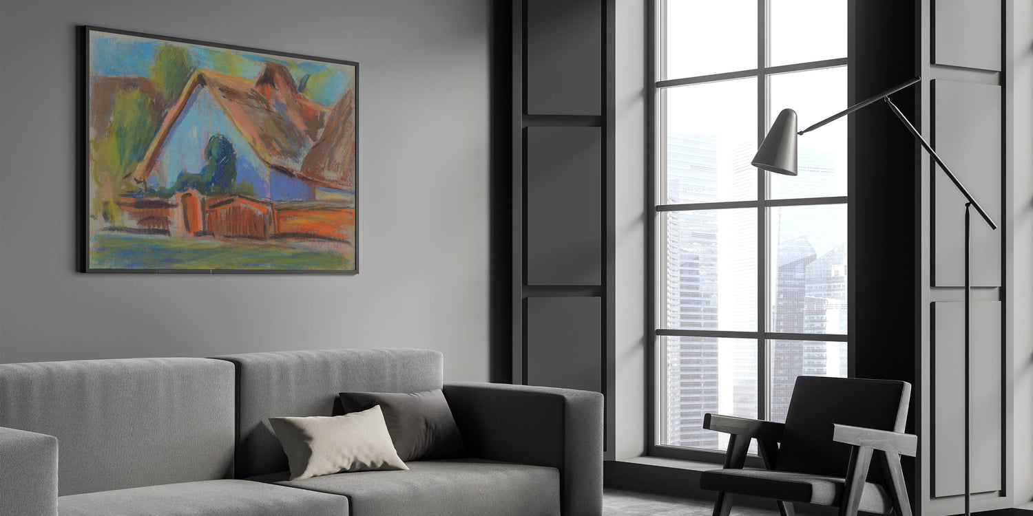 Add a pop of color and rustic charm to your decor with this Modern Wall Art piece, "Blue Village Cottage" by Zolo Palugyay. This artwork portrays a vibrant rural cottage surrounded by lush greenery and bold, colorful rooftops. The expressive brushstrokes and striking palette of blues, oranges, and greens create a lively yet serene atmosphere, perfect for Trendy Home Decor.