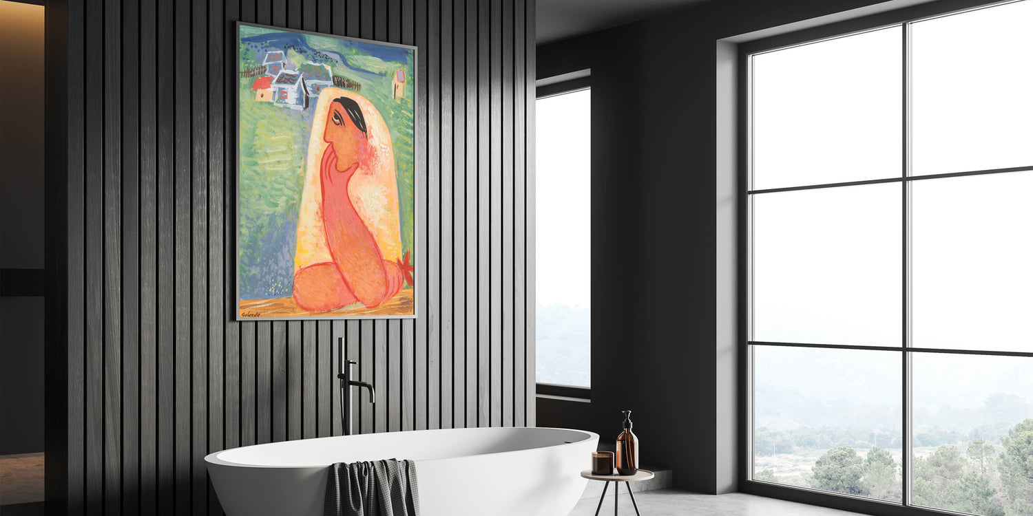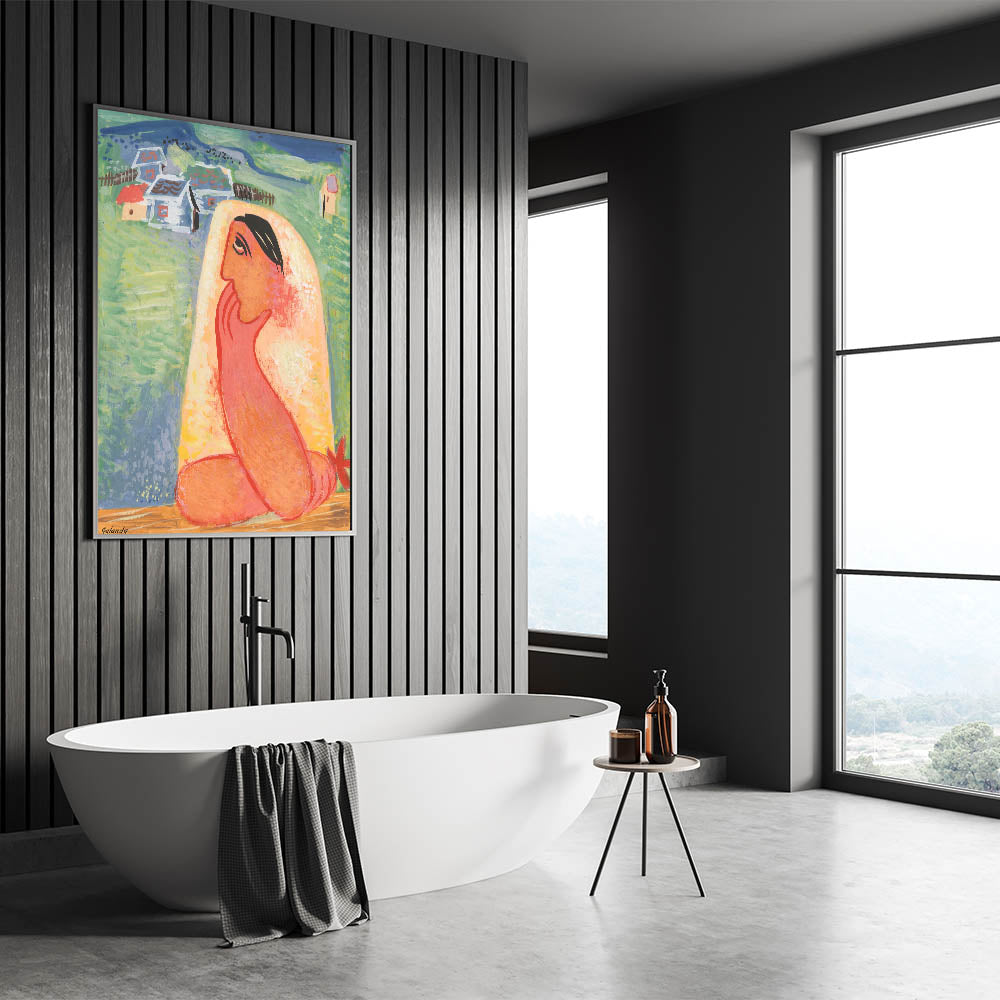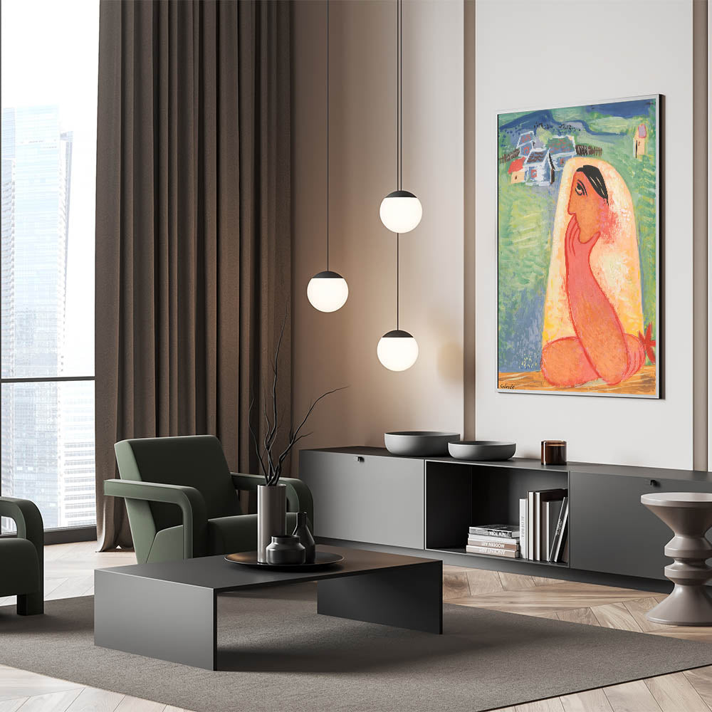 This unique modern art piece is perfect for adding a touch of culture and storytelling to your space. Its bold color palette and folk-inspired subject matter make it a lively and memorable addition to modern interiors.