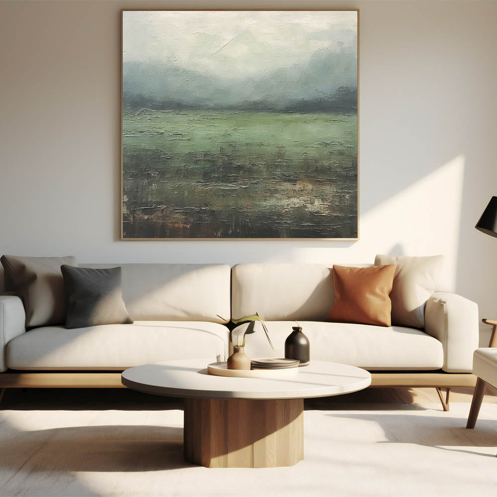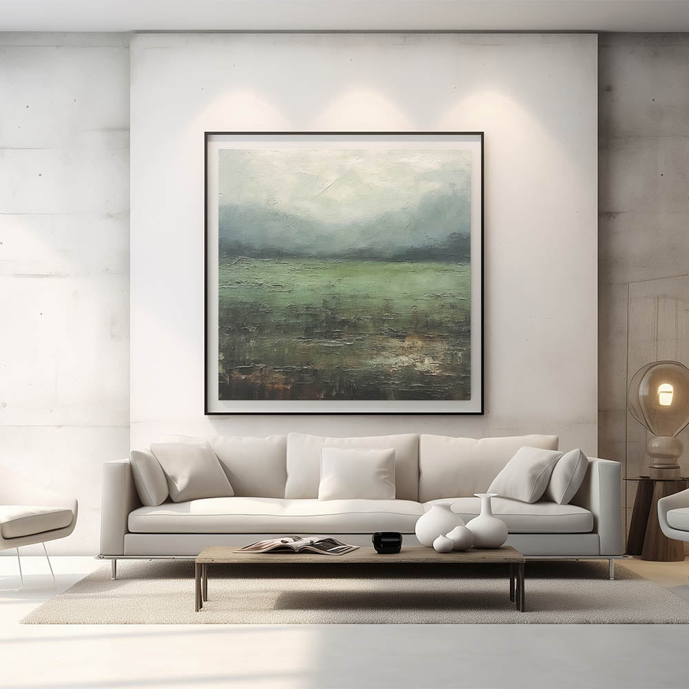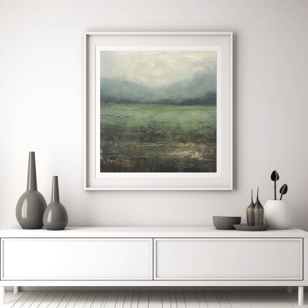 This moody abstract landscape captures the misty essence of a quiet green field with deep, earthy tones and a textured surface. The soft blending of greens and browns evokes a peaceful, rustic atmosphere, perfect for adding depth and intrigue to any space. With its misty, organic look, this artwork brings the tranquility of nature into your home, making it a great fit for modern, farmhouse, and nature-inspired decor styles.