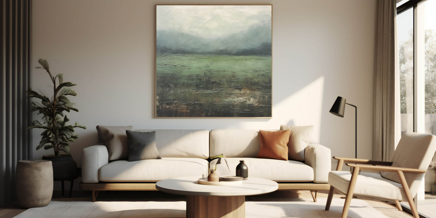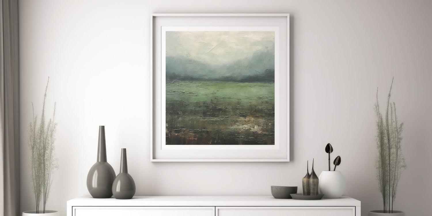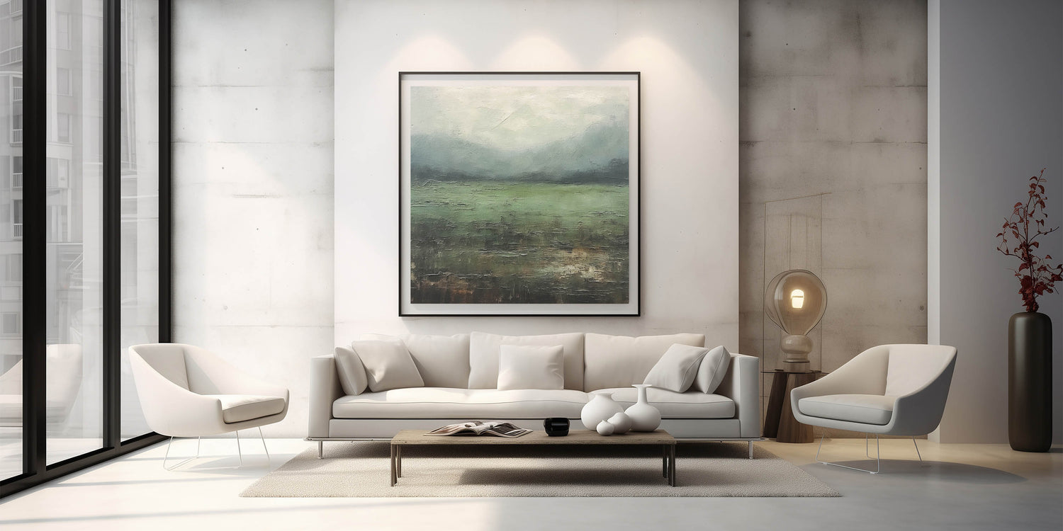 This moody abstract landscape captures the misty essence of a quiet green field with deep, earthy tones and a textured surface. The soft blending of greens and browns evokes a peaceful, rustic atmosphere, perfect for adding depth and intrigue to any space. With its misty, organic look, this artwork brings the tranquility of nature into your home, making it a great fit for modern, farmhouse, and nature-inspired decor styles.