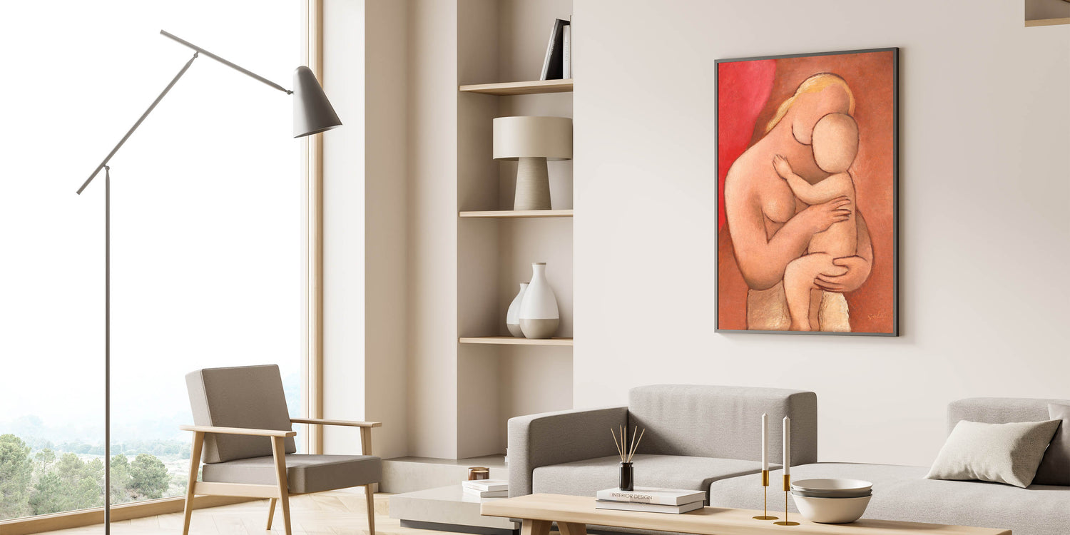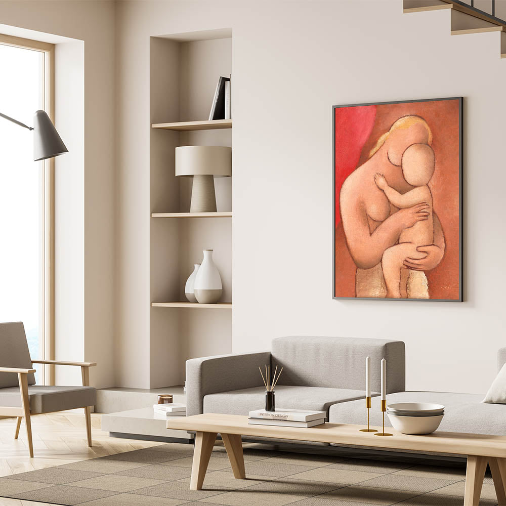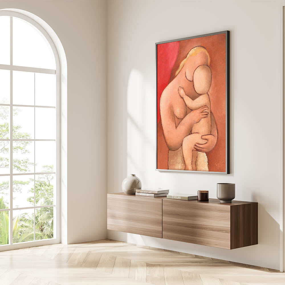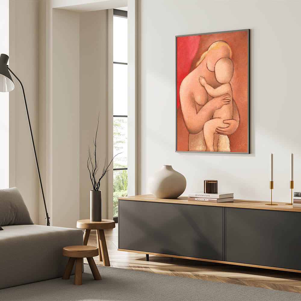 Celebrate the tender bond between mother and child with this warm and evocative piece by Mikuláš Galanda. Created with soft, earthy tones and minimalist forms, this artwork captures the intimate embrace of motherhood in a way that is both timeless and modern. Its gentle palette and organic shapes make it an ideal piece for those seeking a calm, emotional presence in their home decor.