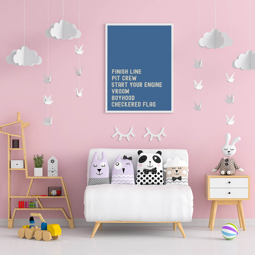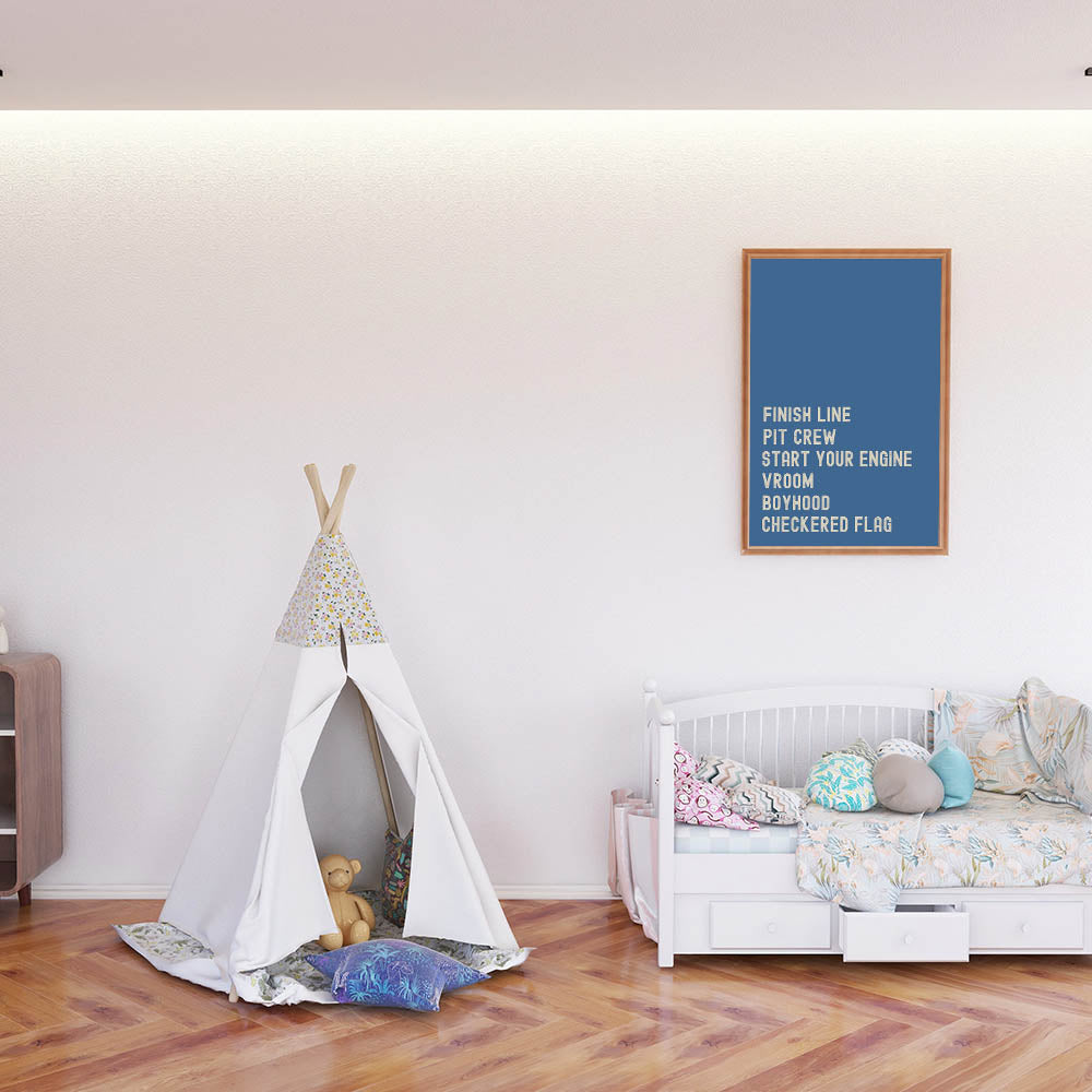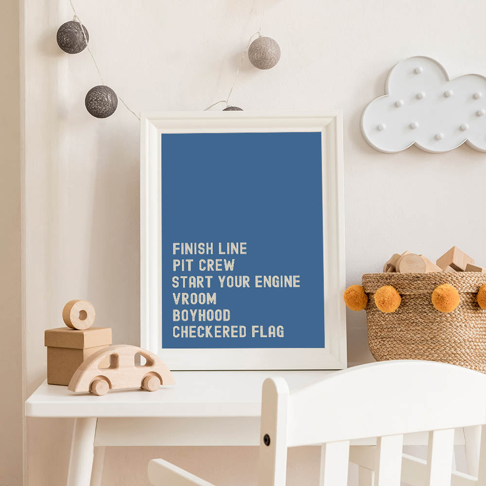 This Motivational Typography Racing Poster brings the thrill of the race track right into your home. Featuring bold, inspiring words like "Finish Line," "Pit Crew," and "Start Your Engine," this design is a perfect statement piece for any car lover or racing enthusiast. With a vibrant blue background, the artwork brings a sense of energy, competition, and motivation, making it ideal for your living room, office, or bedroom.