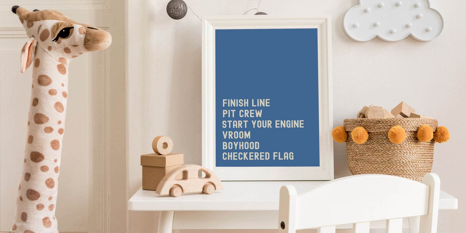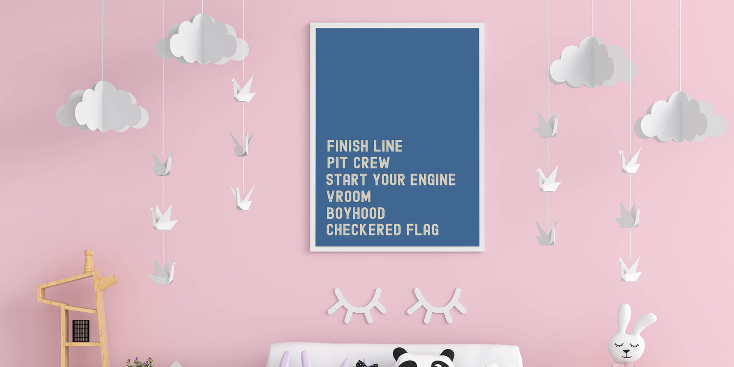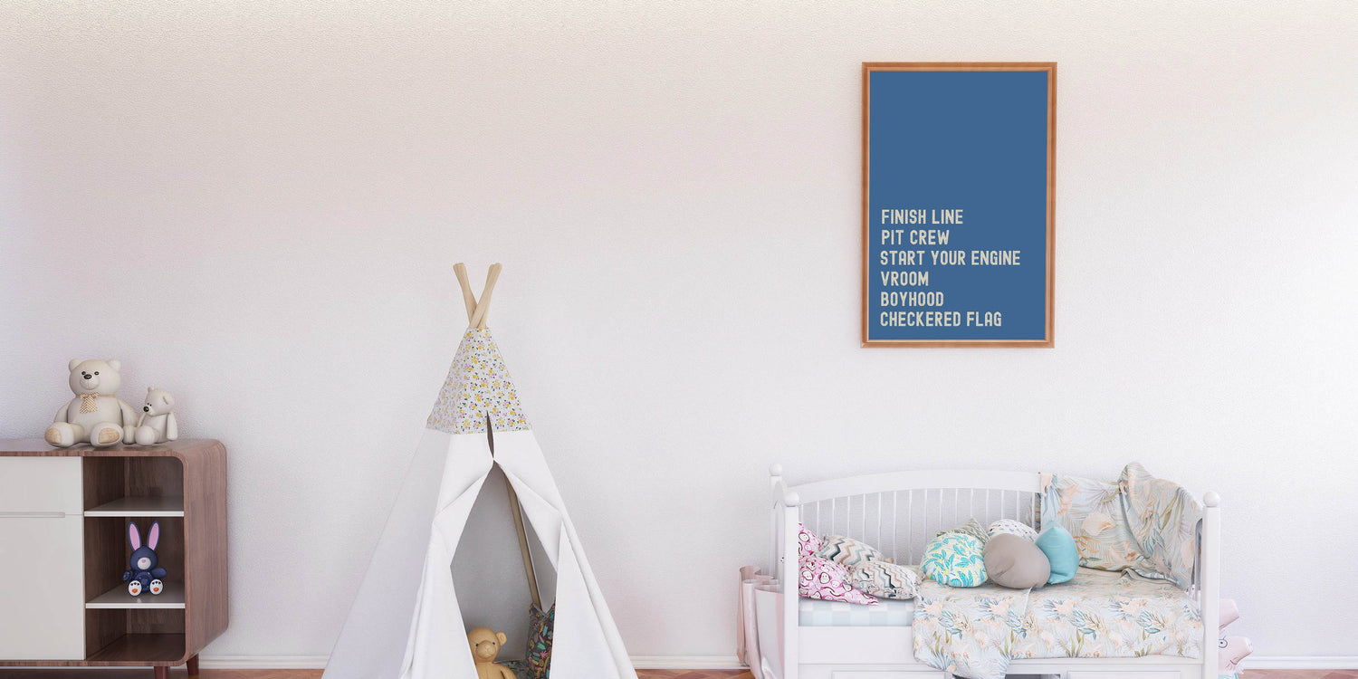 This Motivational Typography Racing Poster brings the thrill of the race track right into your home. Featuring bold, inspiring words like "Finish Line," "Pit Crew," and "Start Your Engine," this design is a perfect statement piece for any car lover or racing enthusiast. With a vibrant blue background, the artwork brings a sense of energy, competition, and motivation, making it ideal for your living room, office, or bedroom.