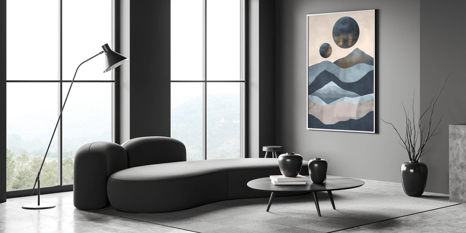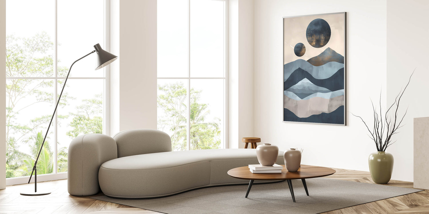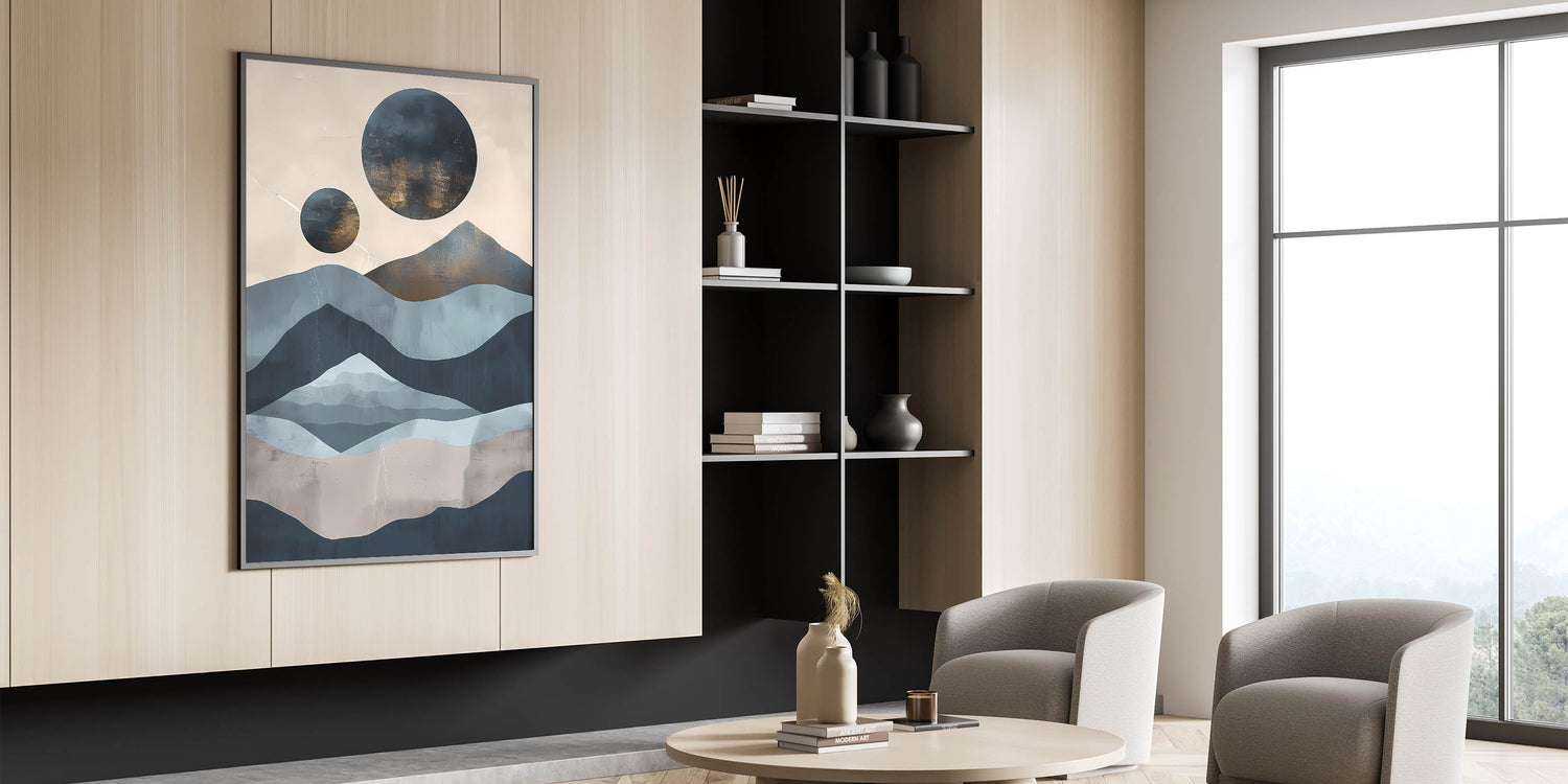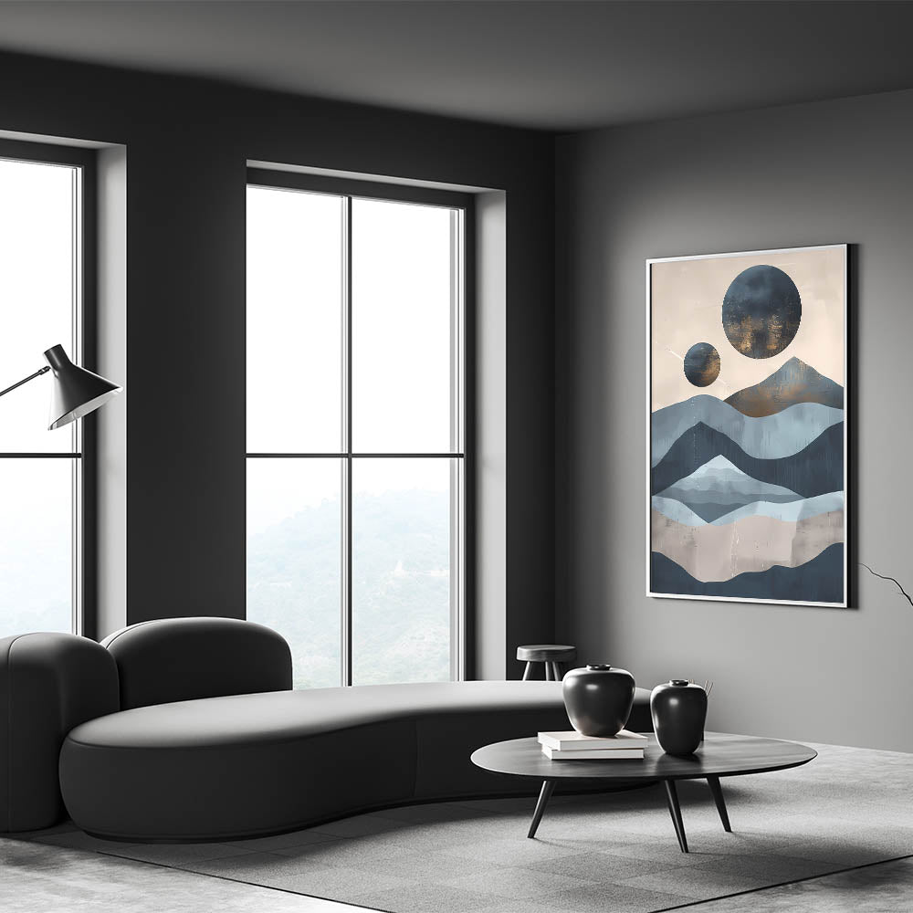 Embrace the serene beauty of nature with this abstract mountain and moon landscape art. Featuring layered mountain shapes in calming shades of blue and beige, contrasted with celestial moon forms, this piece evokes a sense of tranquility and natural elegance. Perfect for modern spaces, this artwork offers a unique blend of landscape and abstraction, adding a contemplative touch to any room. Available in multiple formats, including stretched canvas, framed canvas, and acrylic glass, this versatile piece complements a range of interior styles.