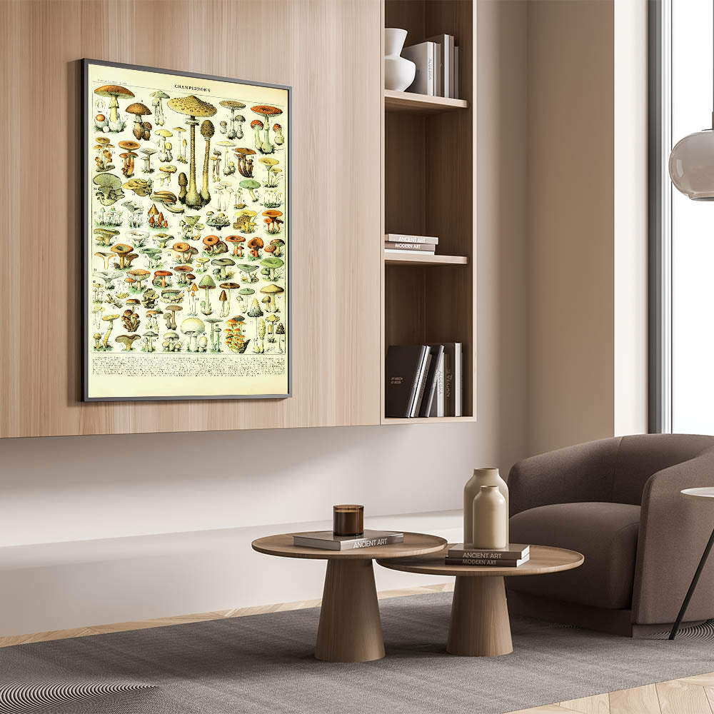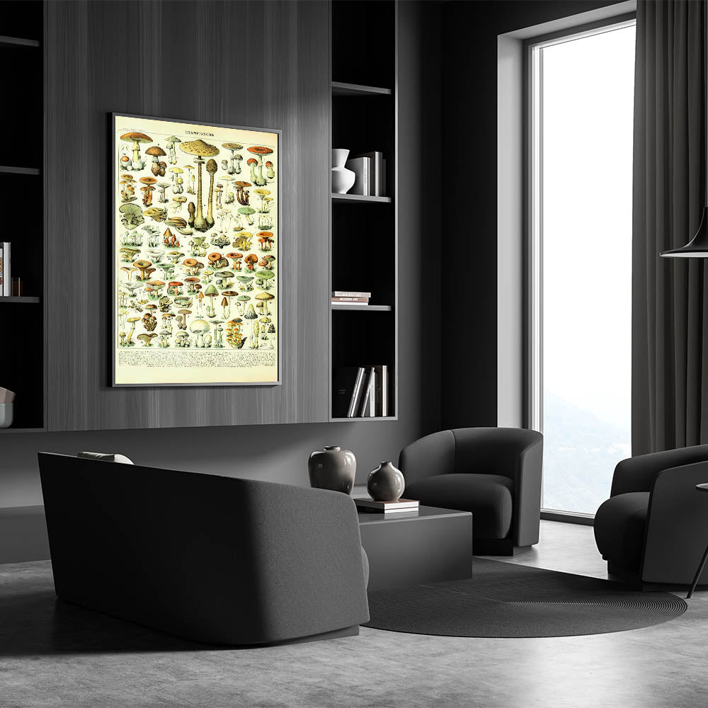 Explore the fascinating world of fungi with this vintage Champignons (Mushrooms) illustration. Featuring a detailed collection of various mushroom species, this print beautifully captures the intricate forms and vibrant colors of these unique organisms. From delicate to bold, each mushroom is meticulously rendered, showcasing their diverse shapes and textures.