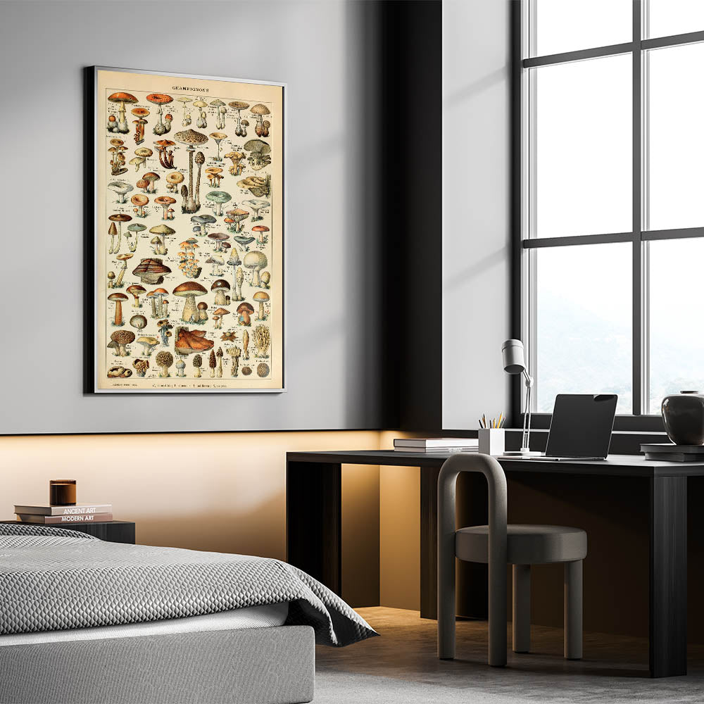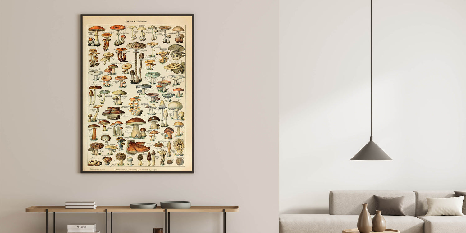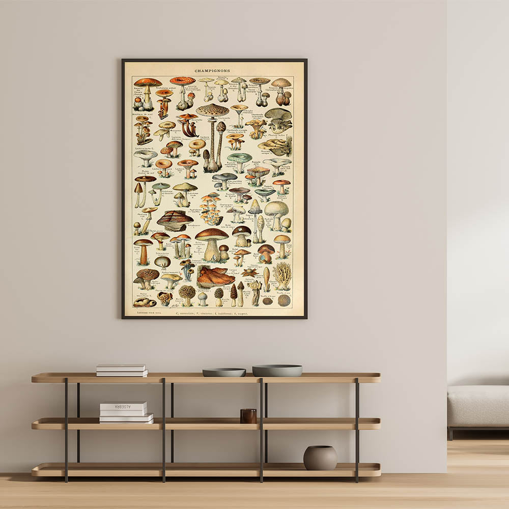 Explore the rich diversity of fungi with this vintage Champignons (Mushrooms) illustration. Featuring a variety of mushroom species, from the well-known Amanita to the elusive Boletus, this print captures the unique and intricate beauty of mushrooms in vivid color. Whether you're a mycology enthusiast or a collector of vintage botanical prints, this illustration offers a fascinating look at the world of mushrooms.
