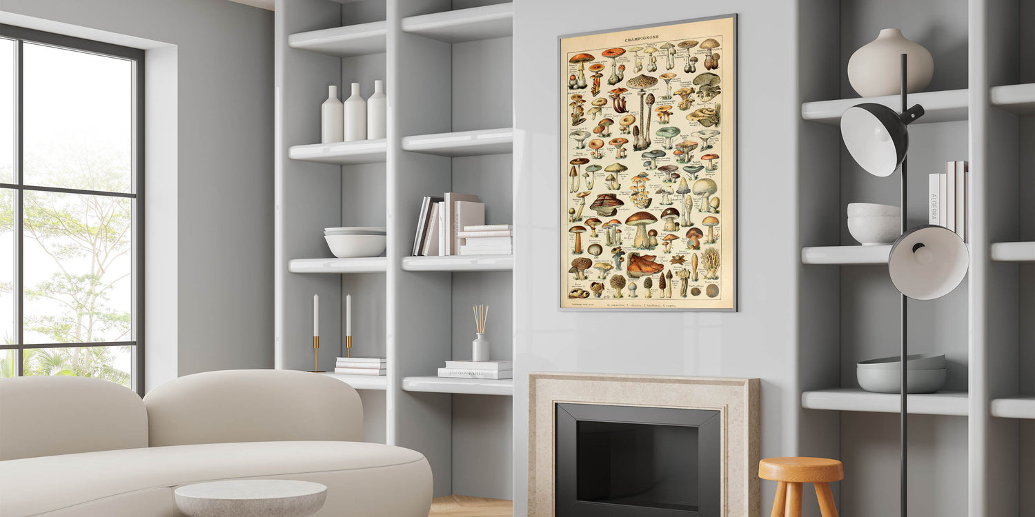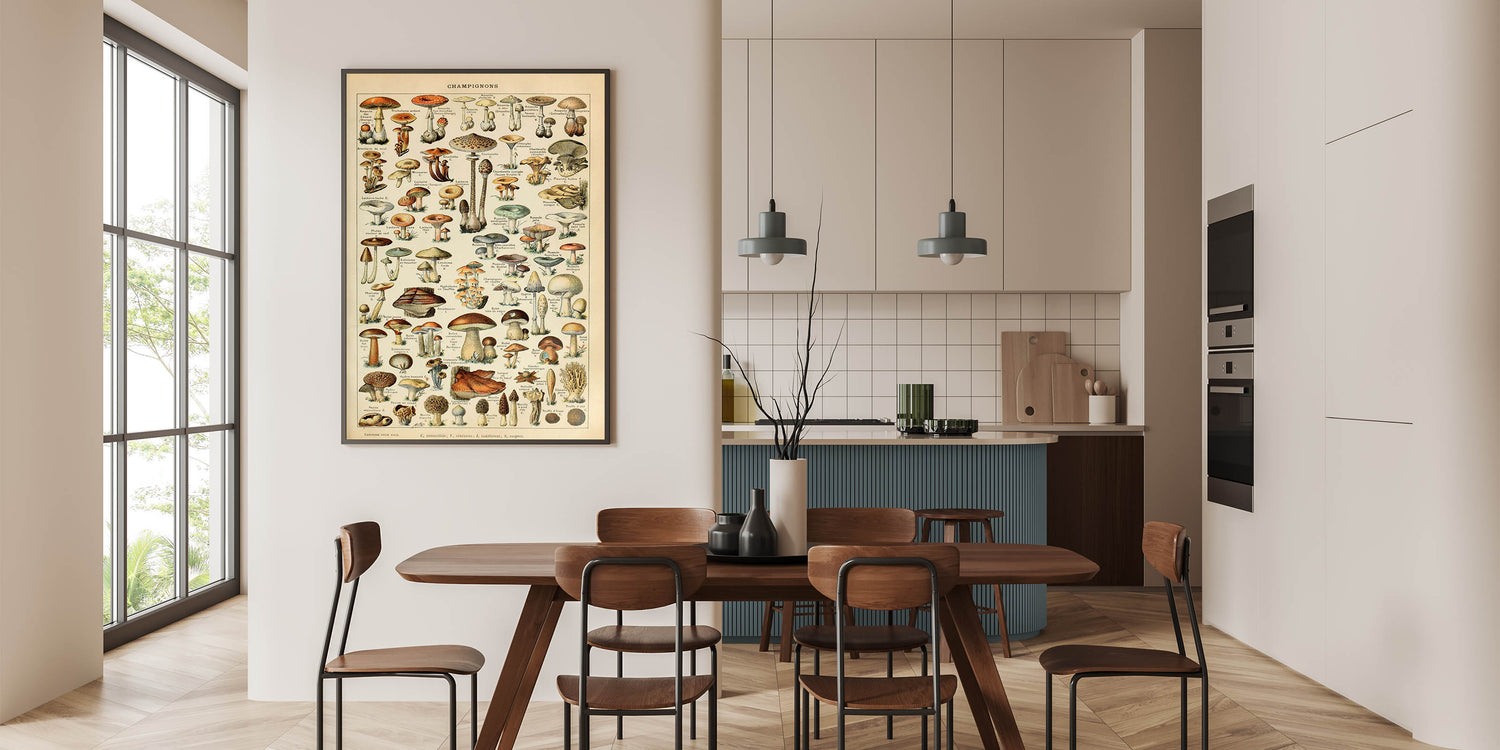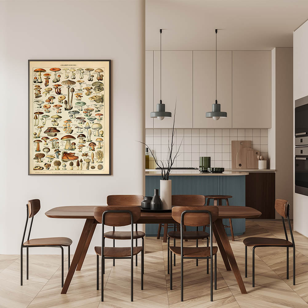 Explore the rich diversity of fungi with this vintage Champignons (Mushrooms) illustration. Featuring a variety of mushroom species, from the well-known Amanita to the elusive Boletus, this print captures the unique and intricate beauty of mushrooms in vivid color. Whether you're a mycology enthusiast or a collector of vintage botanical prints, this illustration offers a fascinating look at the world of mushrooms.