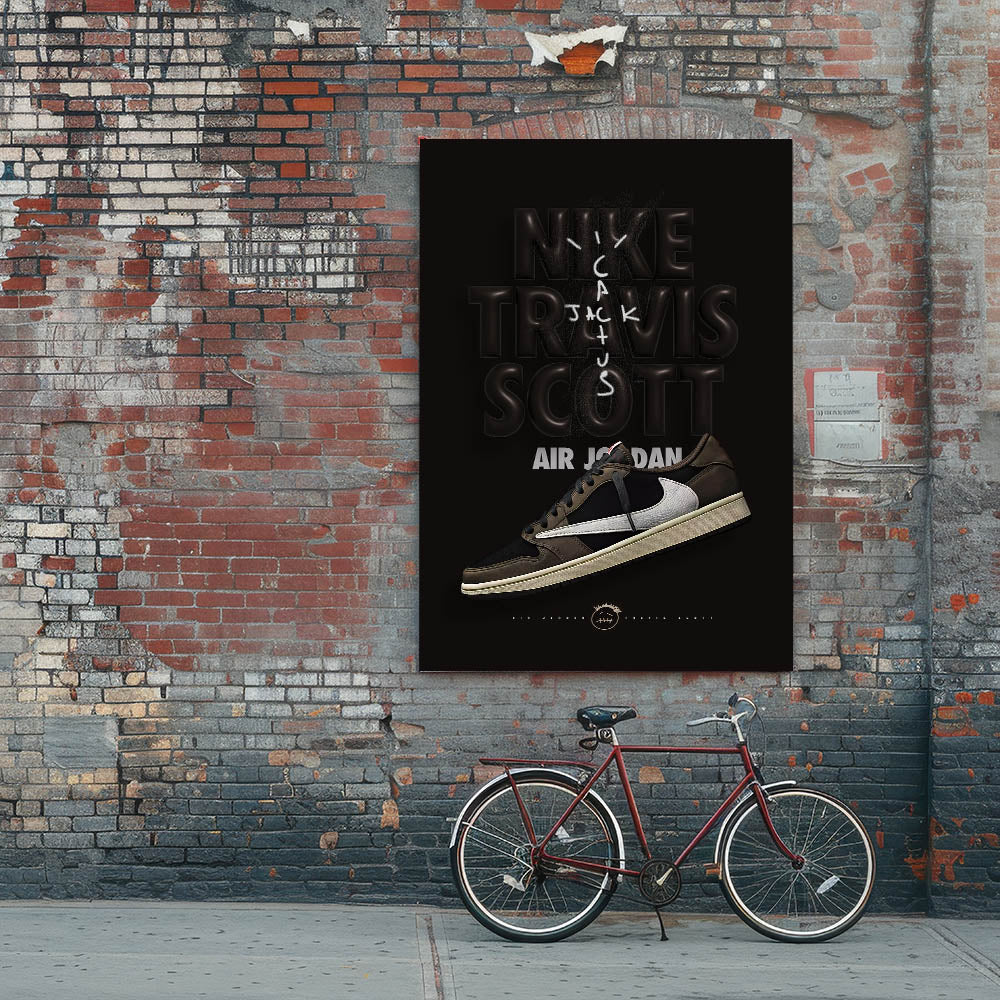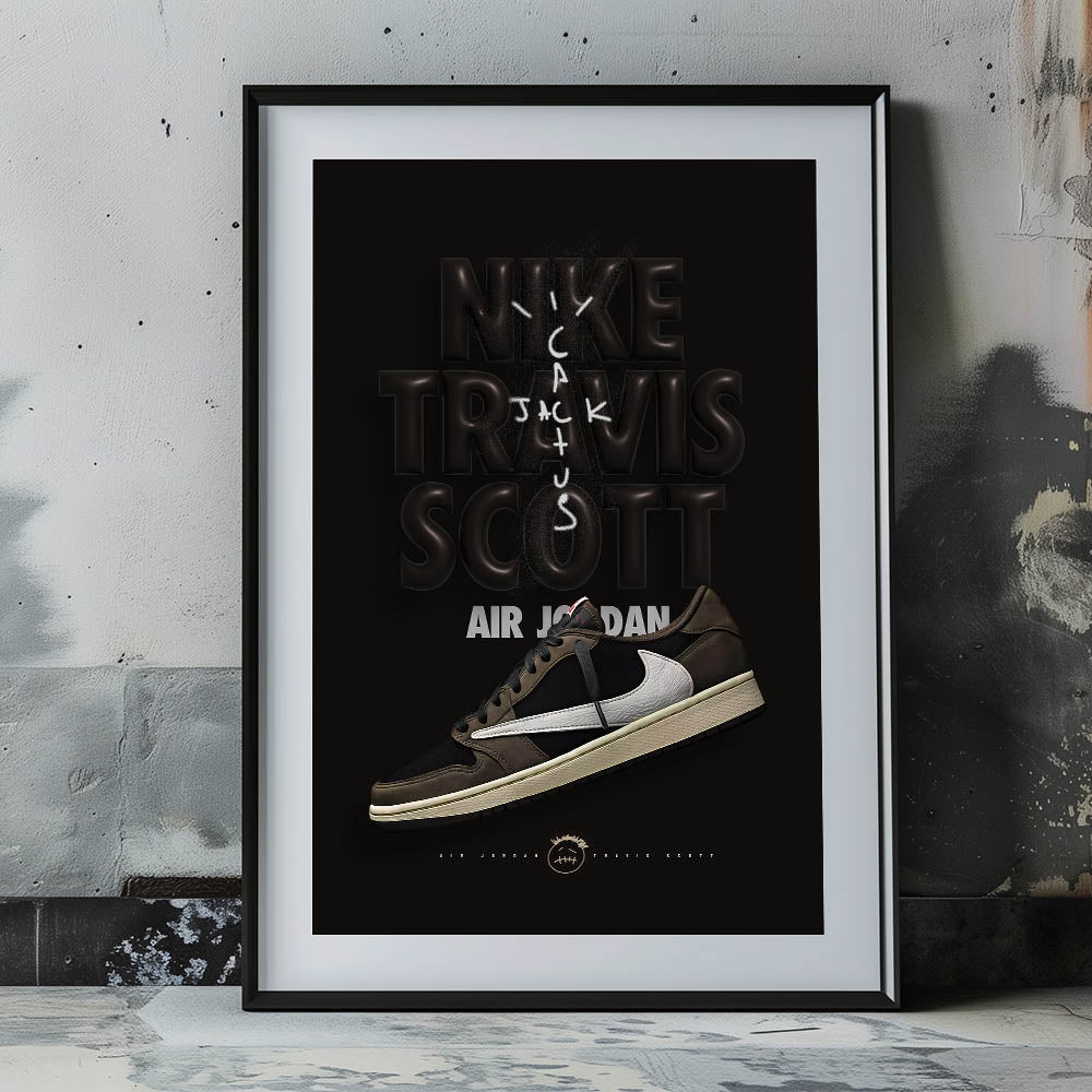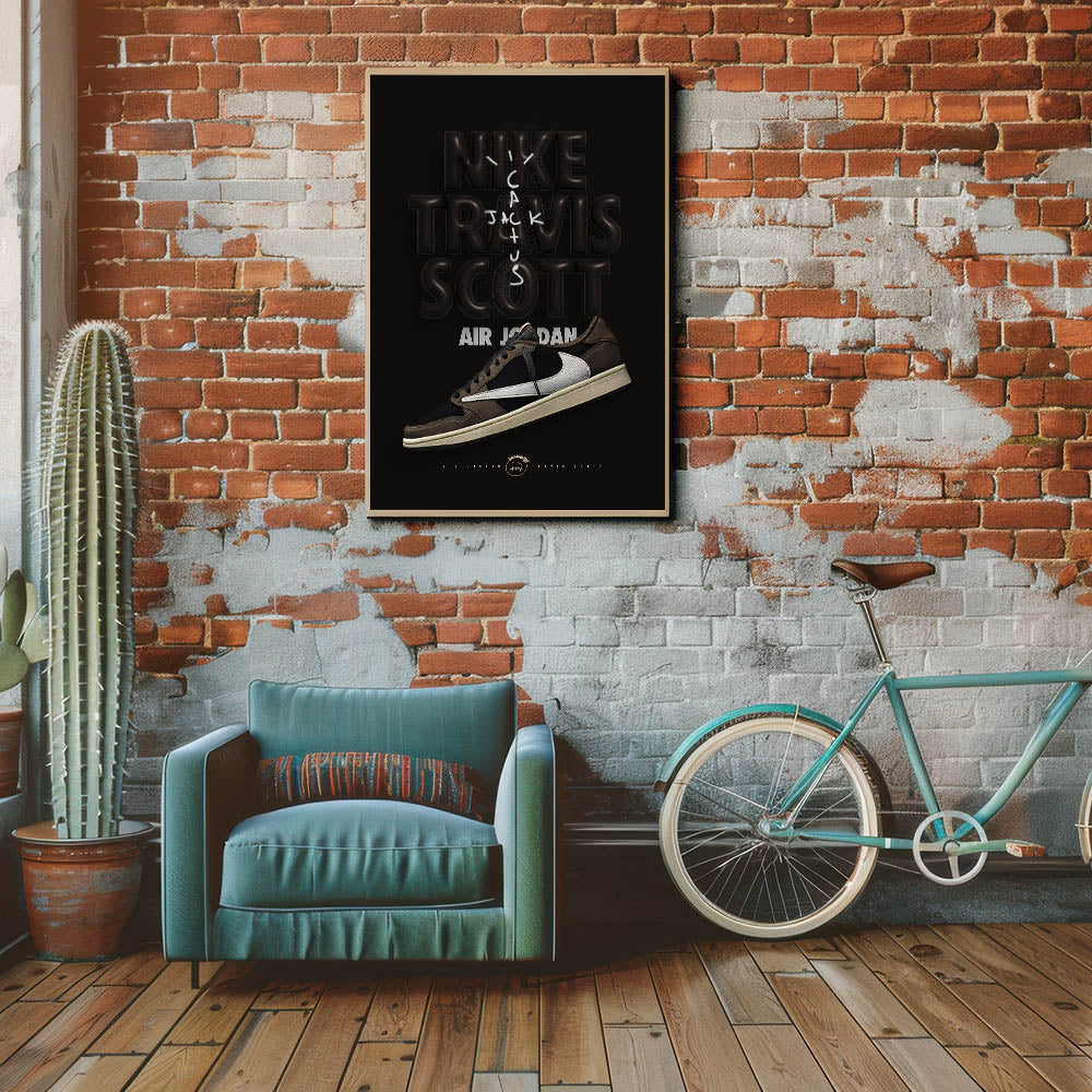 Celebrate the Nike x Travis Scott Air Jordan collaboration with this bold pop art wall decor featuring the iconic Cactus Jack sneakers. Showcasing a dynamic blend of black, white, and brown, this artwork brings the Air Jordan 1 design to life with a graphic, urban twist. The striking contrasts and bold typography make it a must-have for sneakerheads, pop art fans, and sneaker culture enthusiasts alike.