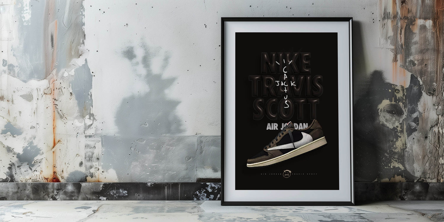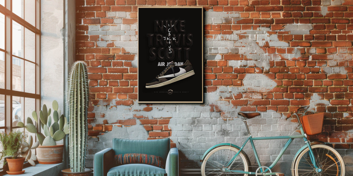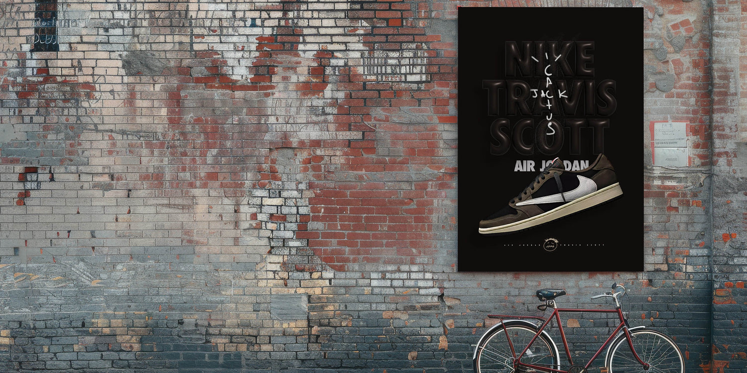 Celebrate the Nike x Travis Scott Air Jordan collaboration with this bold pop art wall decor featuring the iconic Cactus Jack sneakers. Showcasing a dynamic blend of black, white, and brown, this artwork brings the Air Jordan 1 design to life with a graphic, urban twist. The striking contrasts and bold typography make it a must-have for sneakerheads, pop art fans, and sneaker culture enthusiasts alike.