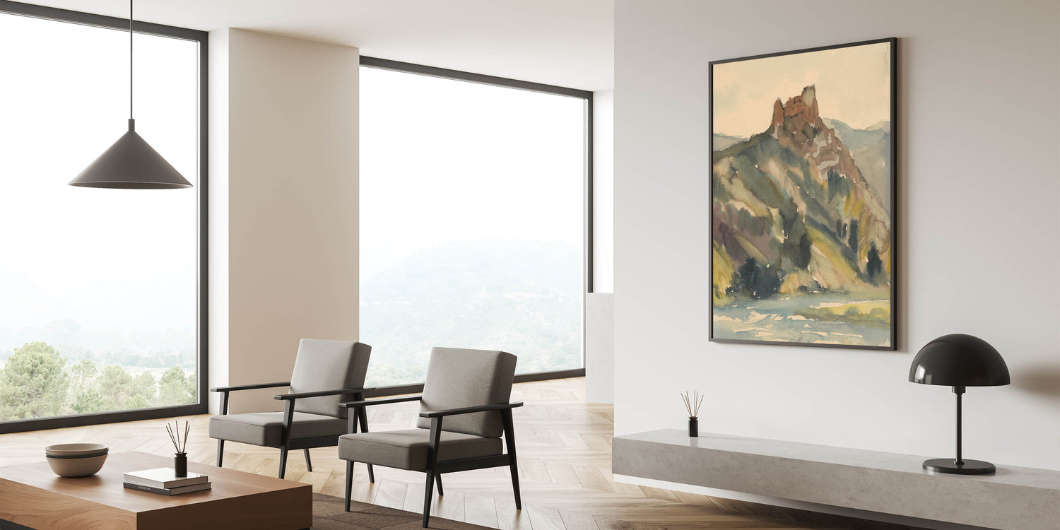 Bring the peaceful allure of nature into your home with the "Old Castle Modern Wall Art" by Zolo Palugyay. This delicate watercolor painting features an enchanting castle perched on a hill, surrounded by soft washes of earthy greens, browns, and blues. The subtle, atmospheric composition evokes a sense of calm and timeless beauty, making it perfect for minimalist modern decor and nature-inspired interiors.