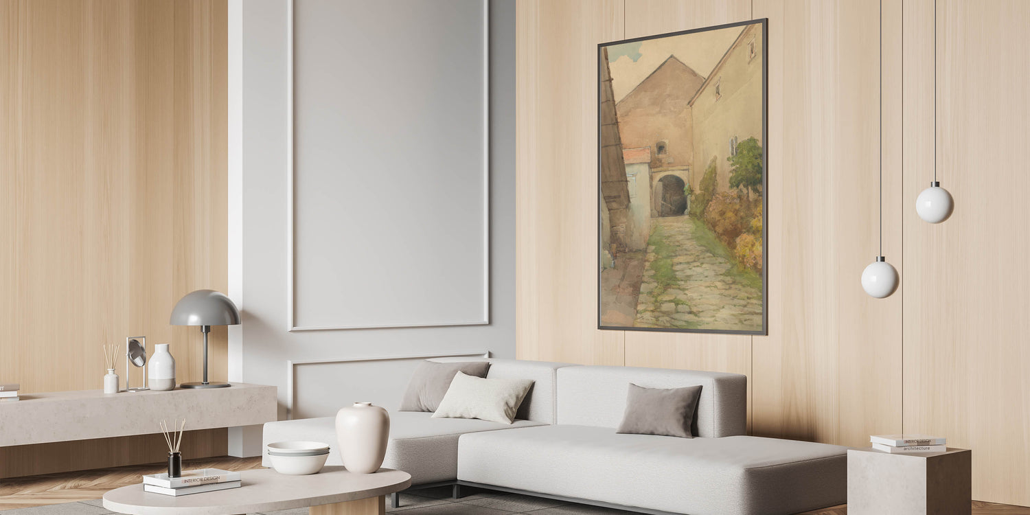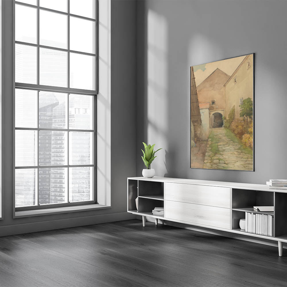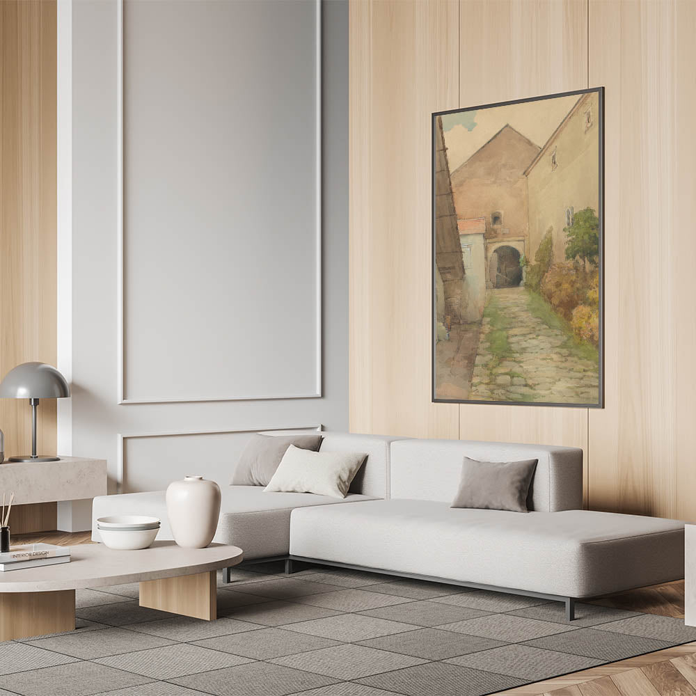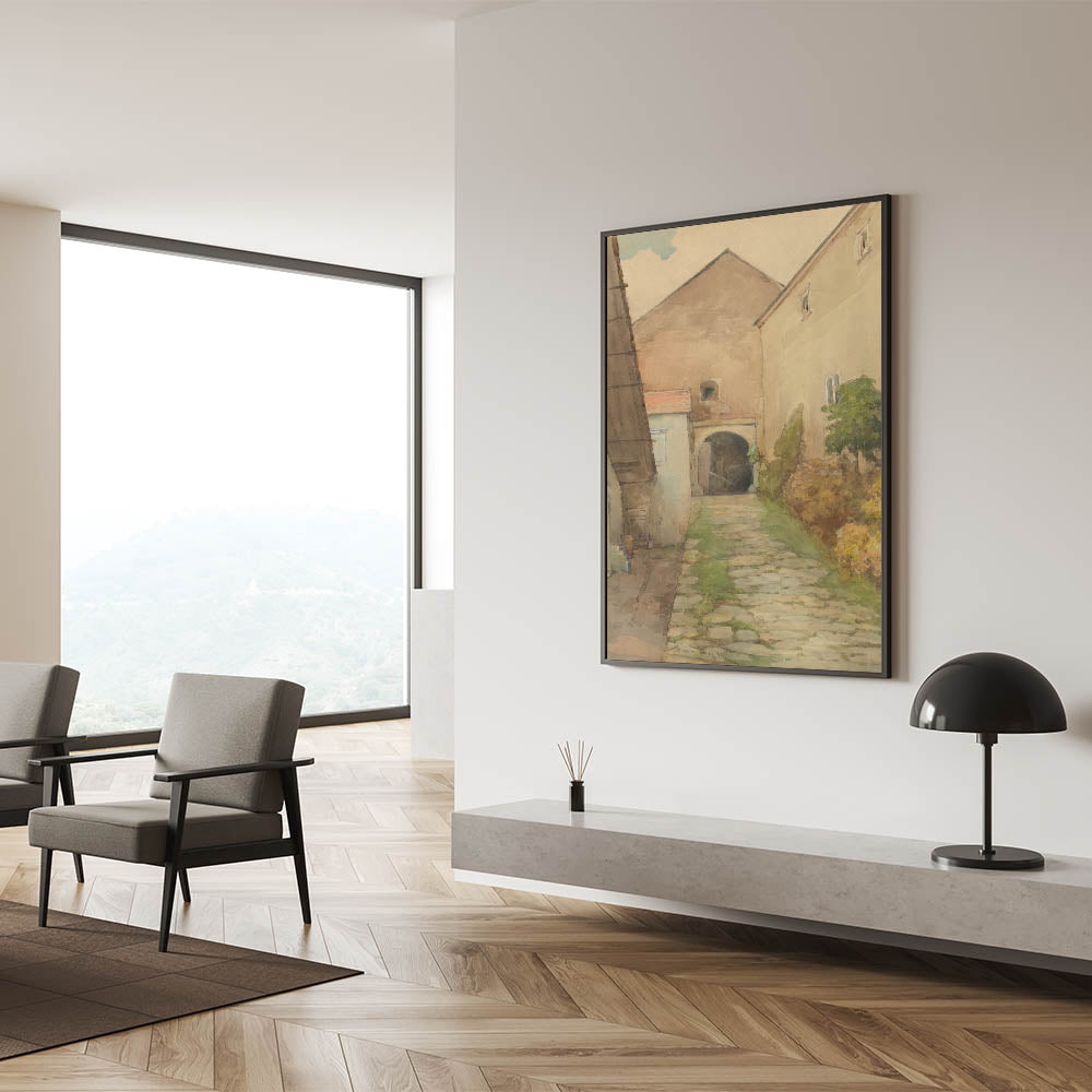 Step into the charm of "Old Yard," a serene Impressionist landscape by Lajos Csordák. This beautiful watercolor painting captures a quiet courtyard with its weathered stone path, soft beige walls, and lush greenery. The gentle, earthy tones and delicate brushwork evoke a sense of nostalgia, transporting viewers to a peaceful, timeless setting.