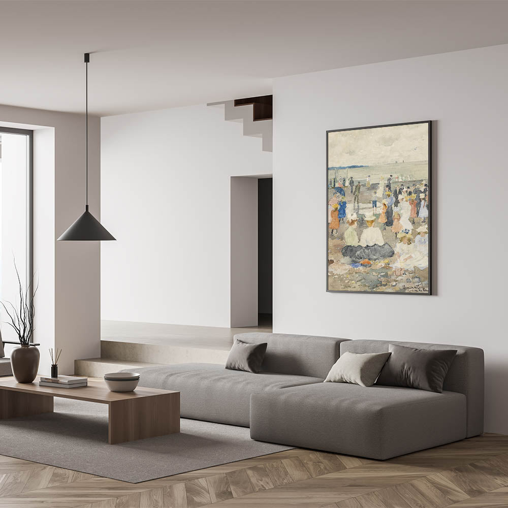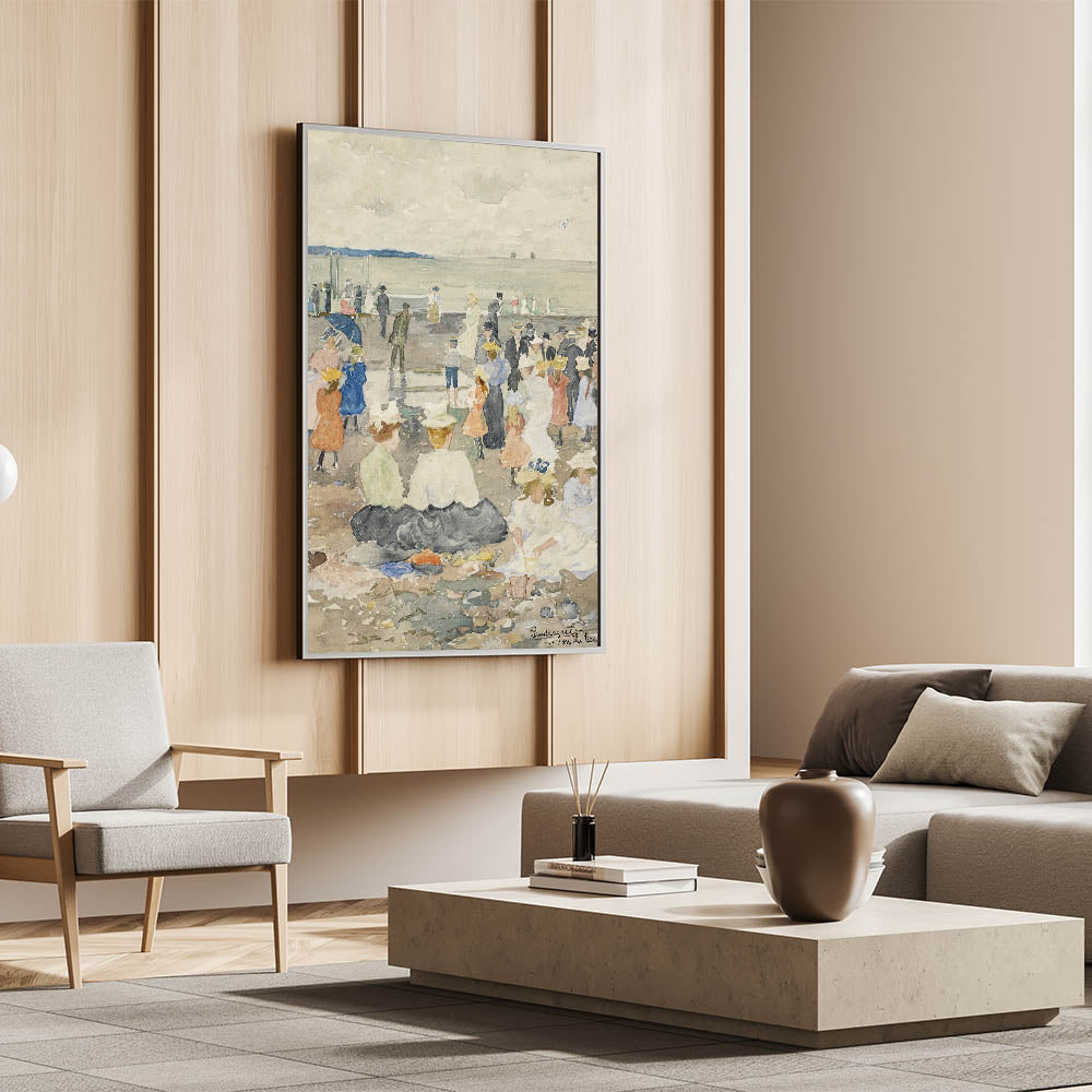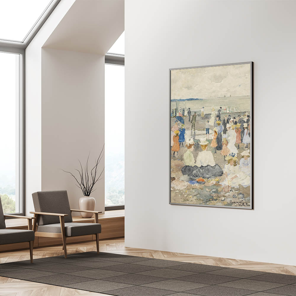Step into a lively seaside scene with "On the Beach," a vibrant Impressionist painting by Maurice Brazil Prendergast. This watercolor artwork captures a bustling beach filled with figures enjoying a leisurely day by the sea. Prendergast’s playful use of colors and intricate details evoke the charm of coastal life, making it a perfect addition to any art collection.