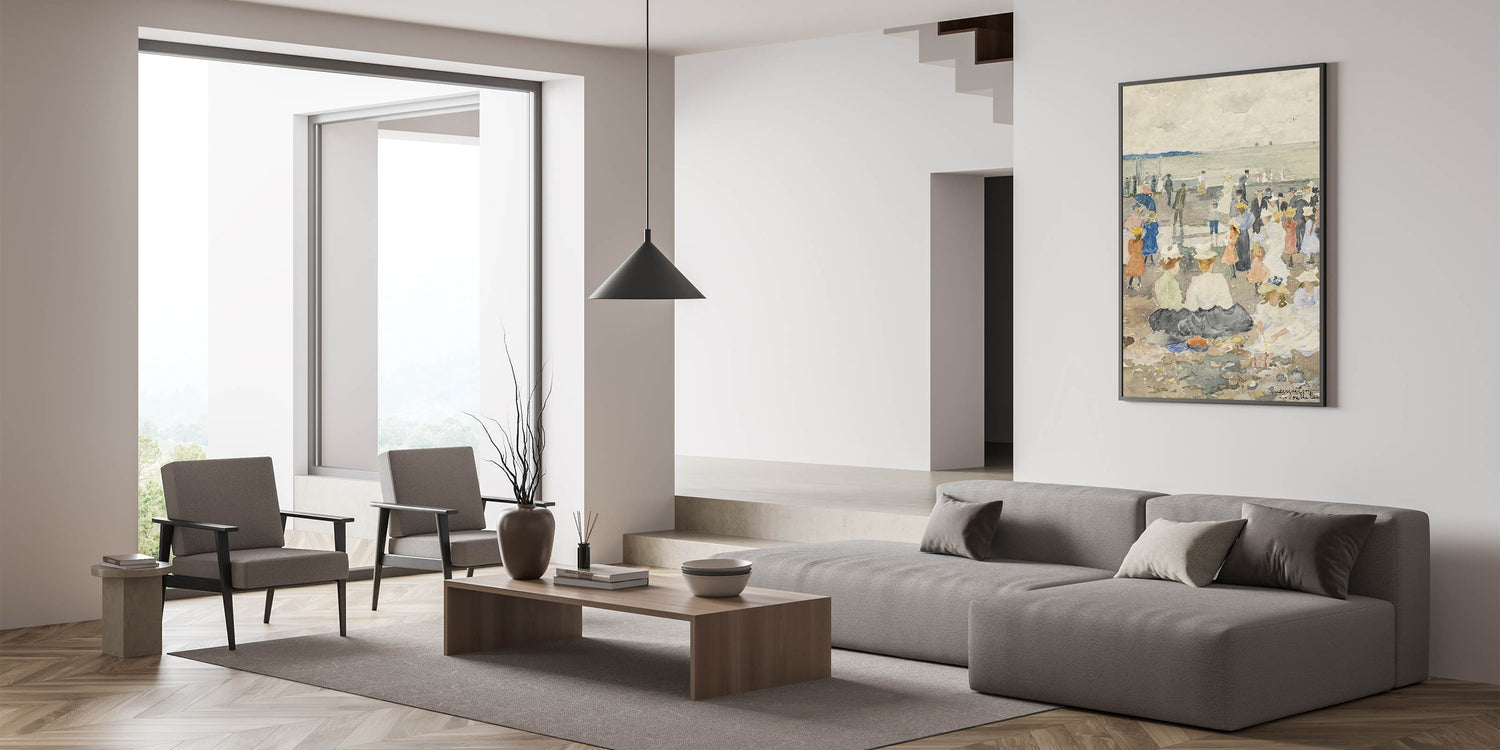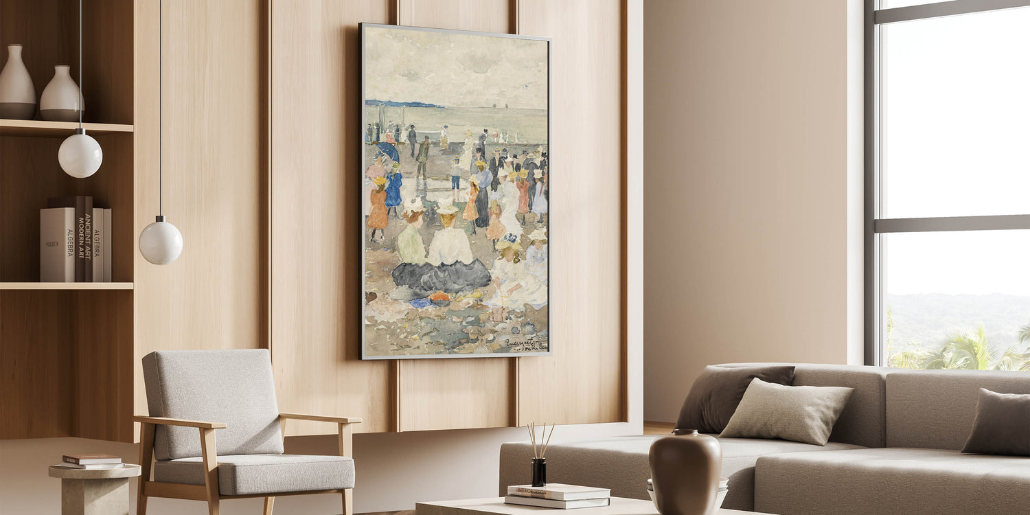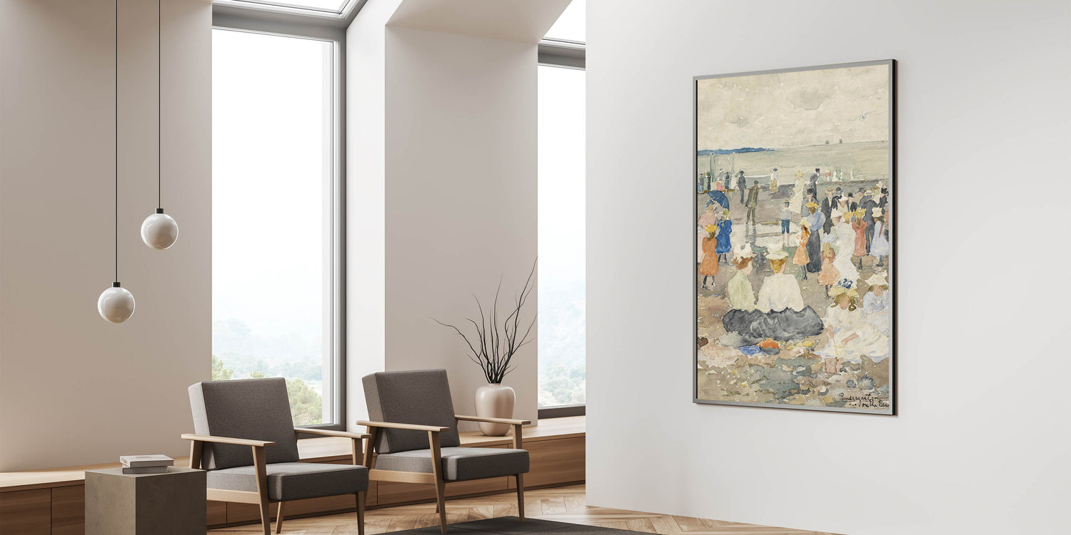 Step into a lively seaside scene with "On the Beach," a vibrant Impressionist painting by Maurice Brazil Prendergast. This watercolor artwork captures a bustling beach filled with figures enjoying a leisurely day by the sea. Prendergast’s playful use of colors and intricate details evoke the charm of coastal life, making it a perfect addition to any art collection.