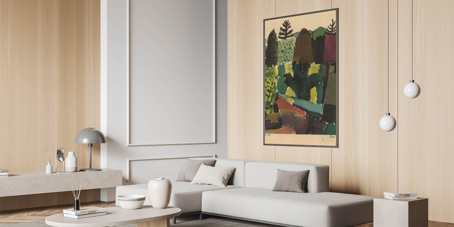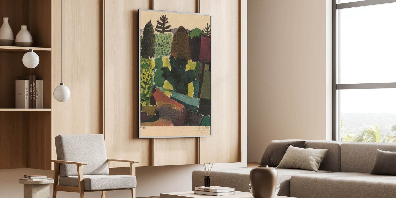 Elevate your home with the "Park Modern Wall Art" by Paul Klee, a captivating piece that combines abstract expression with vibrant natural hues. Featuring rich greens, deep purples, and warm earthy tones, this artwork reimagines a serene park landscape through bold shapes and textures. Its unique composition and vibrant palette make it a timeless choice for modern interiors, perfect for adding a touch of sophistication and creativity to your space.