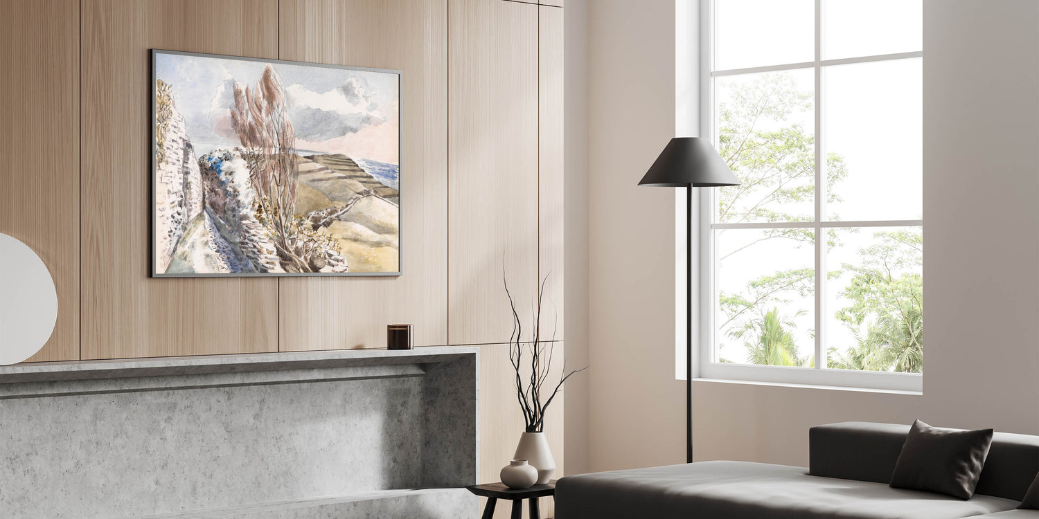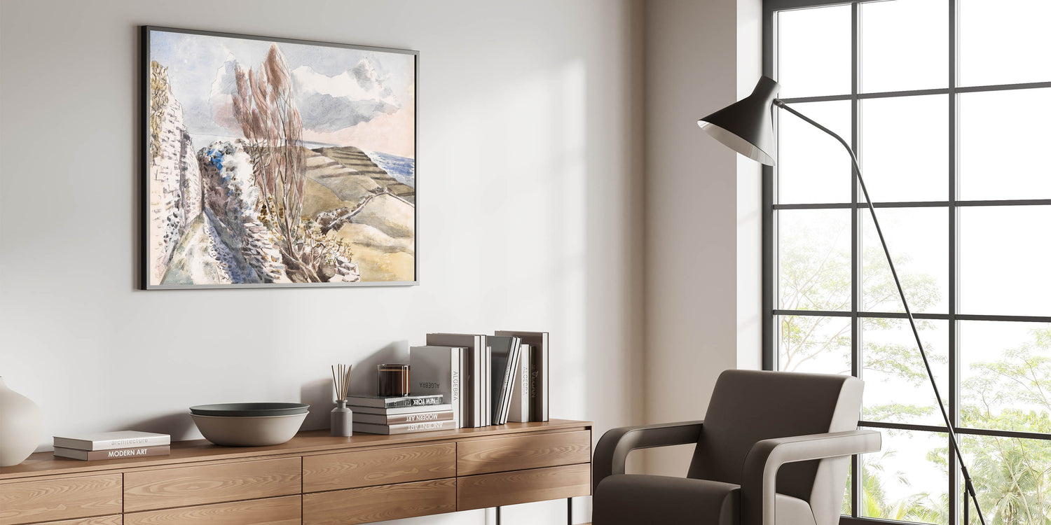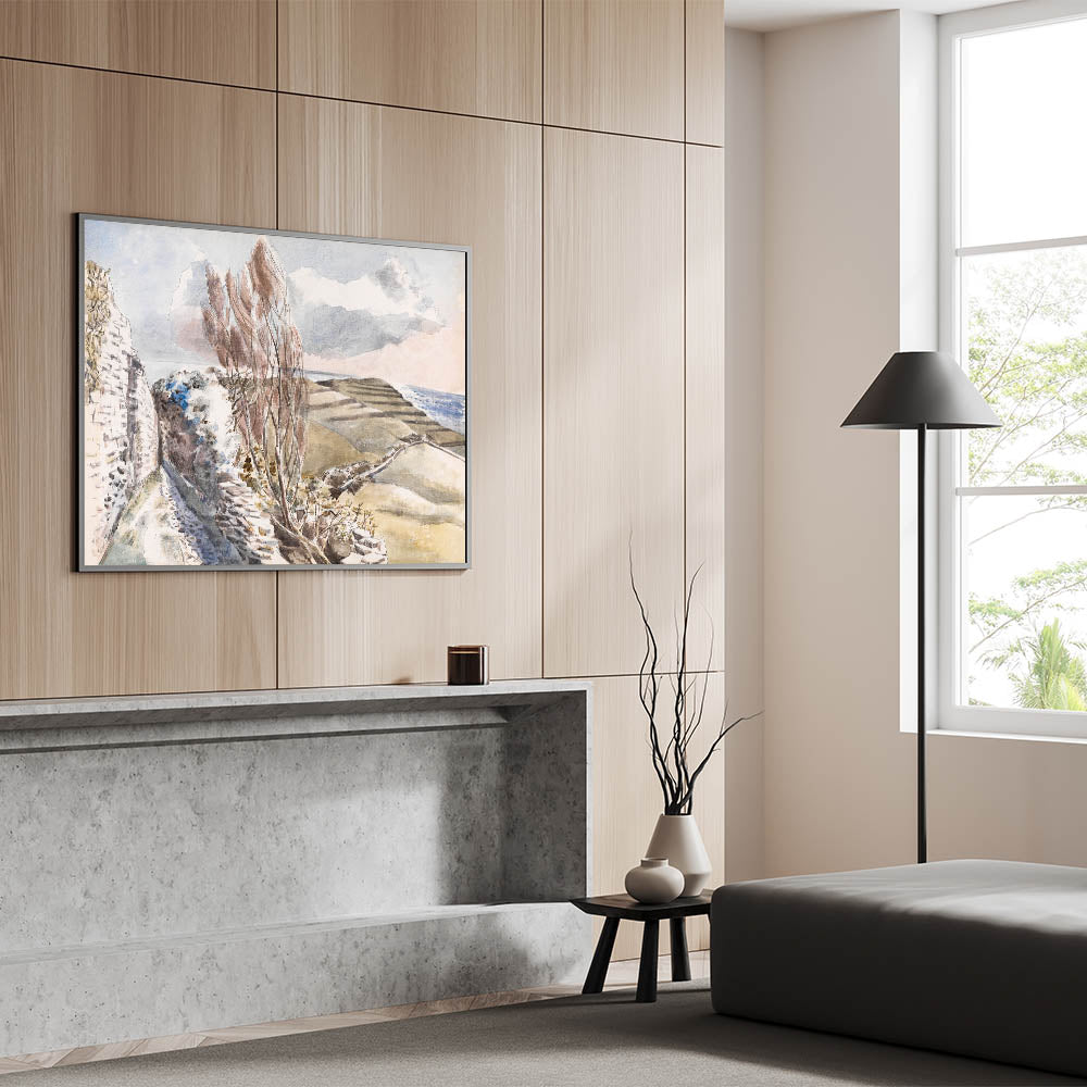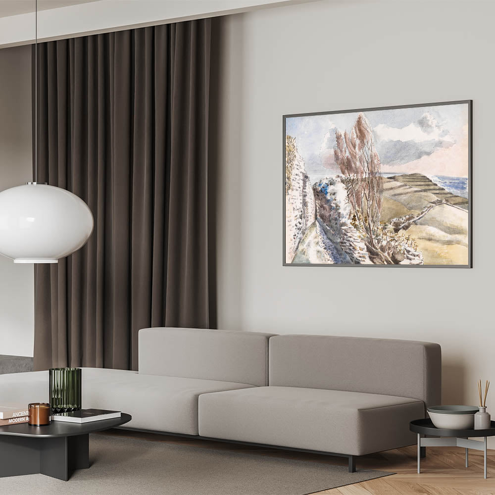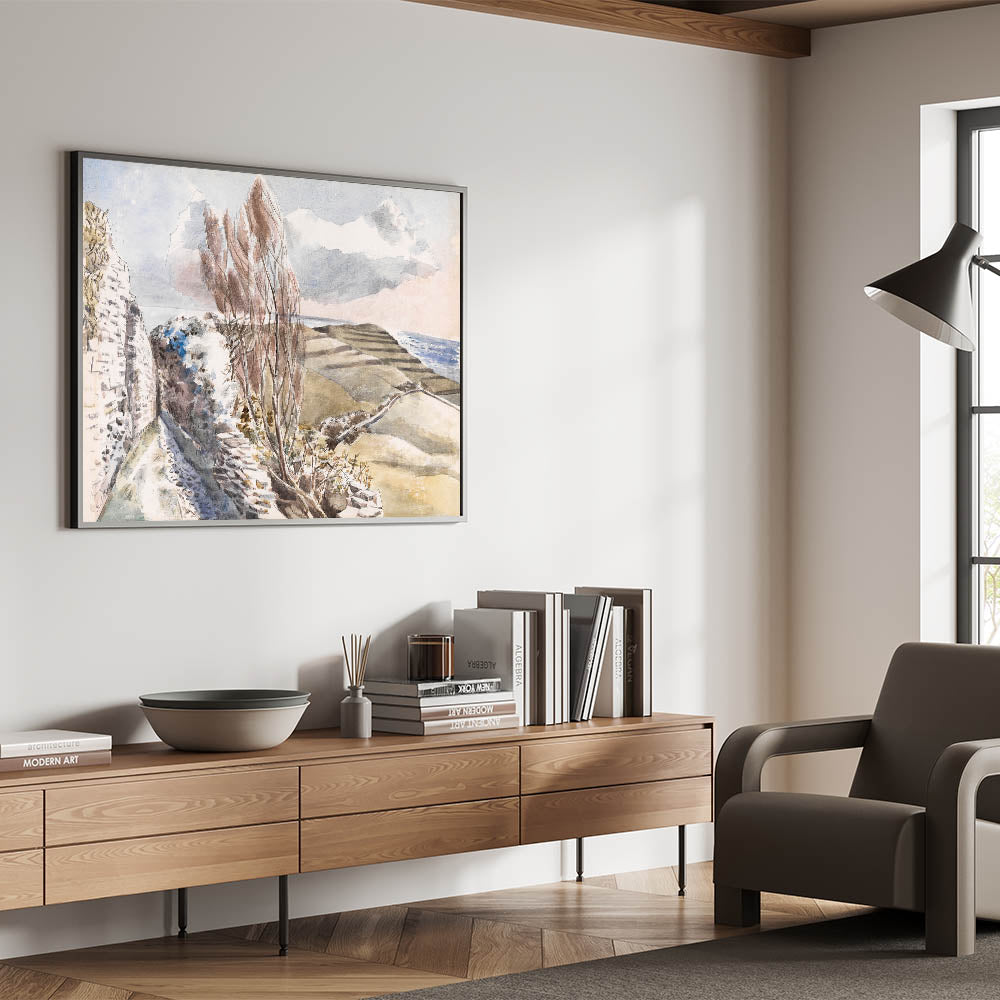 Add this modern pastoral landscape to your decor to evoke the peaceful beauty of rural coastal vistas. Its soft color palette and tranquil composition make it an inviting focal point, perfect for creating a relaxing and timeless atmosphere.