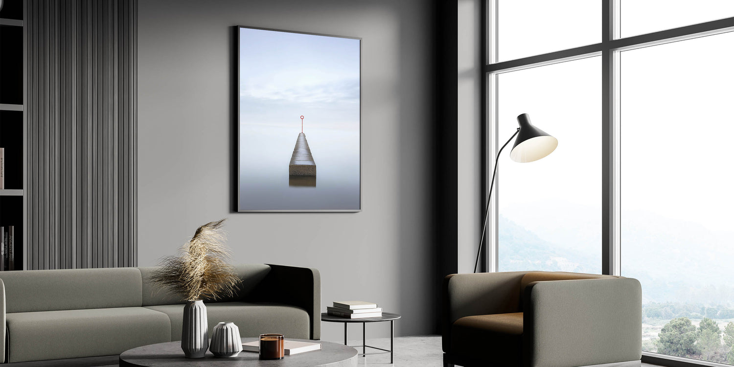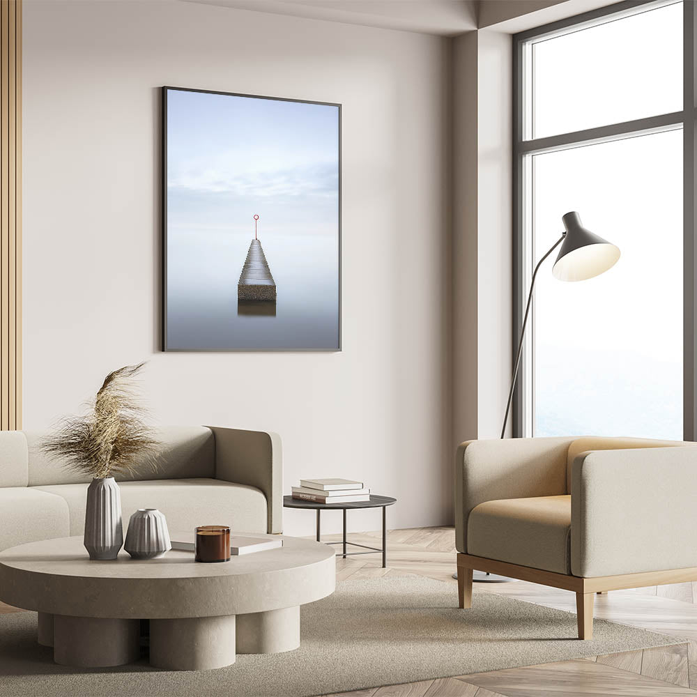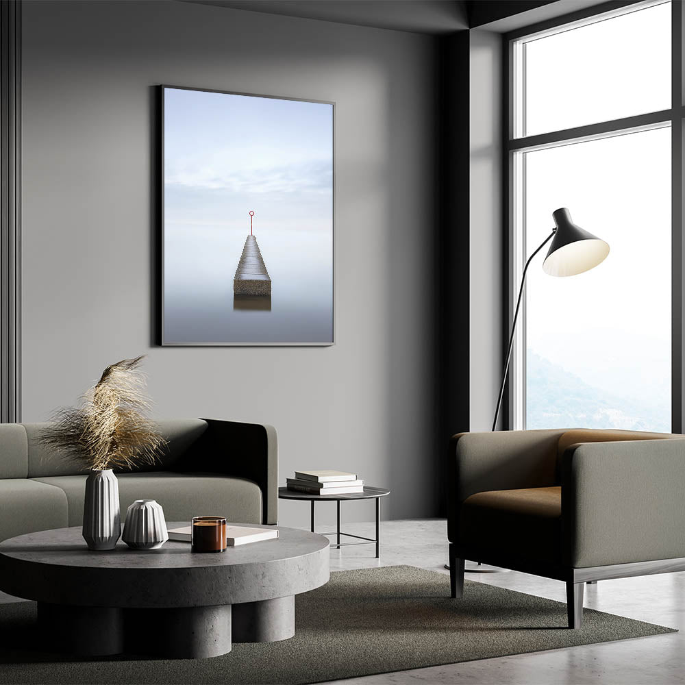 Discover the serene beauty of Pathway to Stillness, a minimalist abstract landscape that captures a quiet pier leading into an infinite horizon. The red focal point at the end of the pathway provides a striking contrast against the calming blues and grays of the surrounding sky and water. This artwork is perfect for creating a tranquil yet captivating centerpiece in modern, minimalist, or coastal-themed interiors.