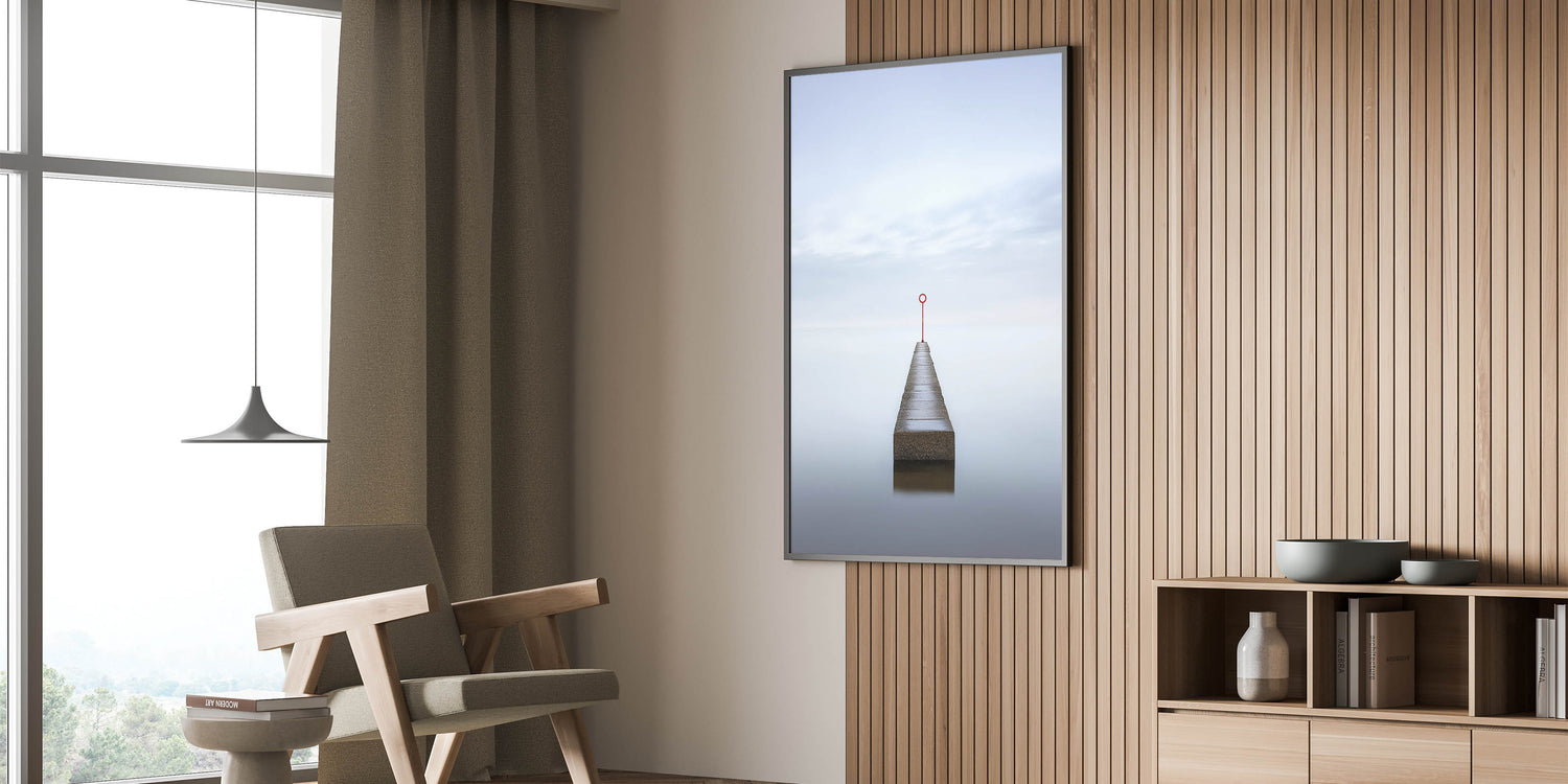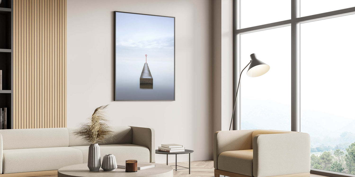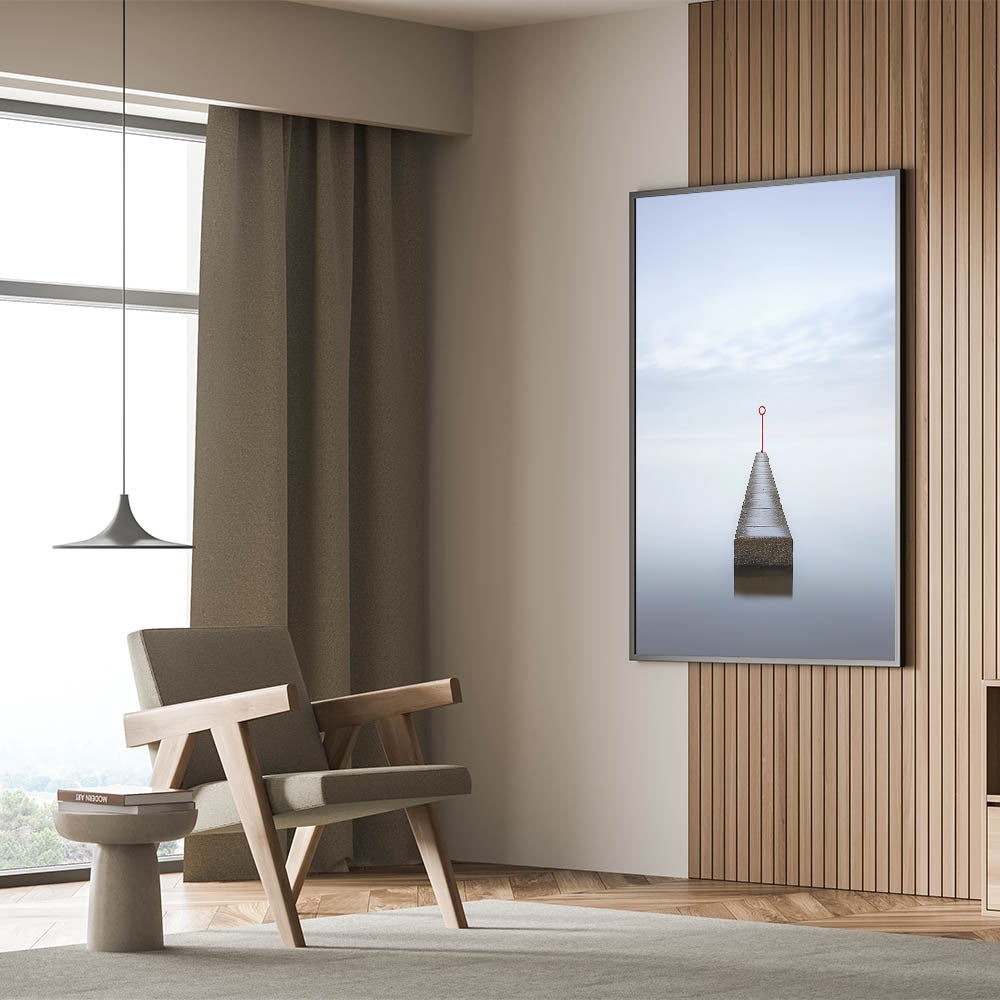 Discover the serene beauty of Pathway to Stillness, a minimalist abstract landscape that captures a quiet pier leading into an infinite horizon. The red focal point at the end of the pathway provides a striking contrast against the calming blues and grays of the surrounding sky and water. This artwork is perfect for creating a tranquil yet captivating centerpiece in modern, minimalist, or coastal-themed interiors.