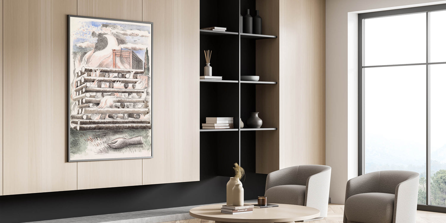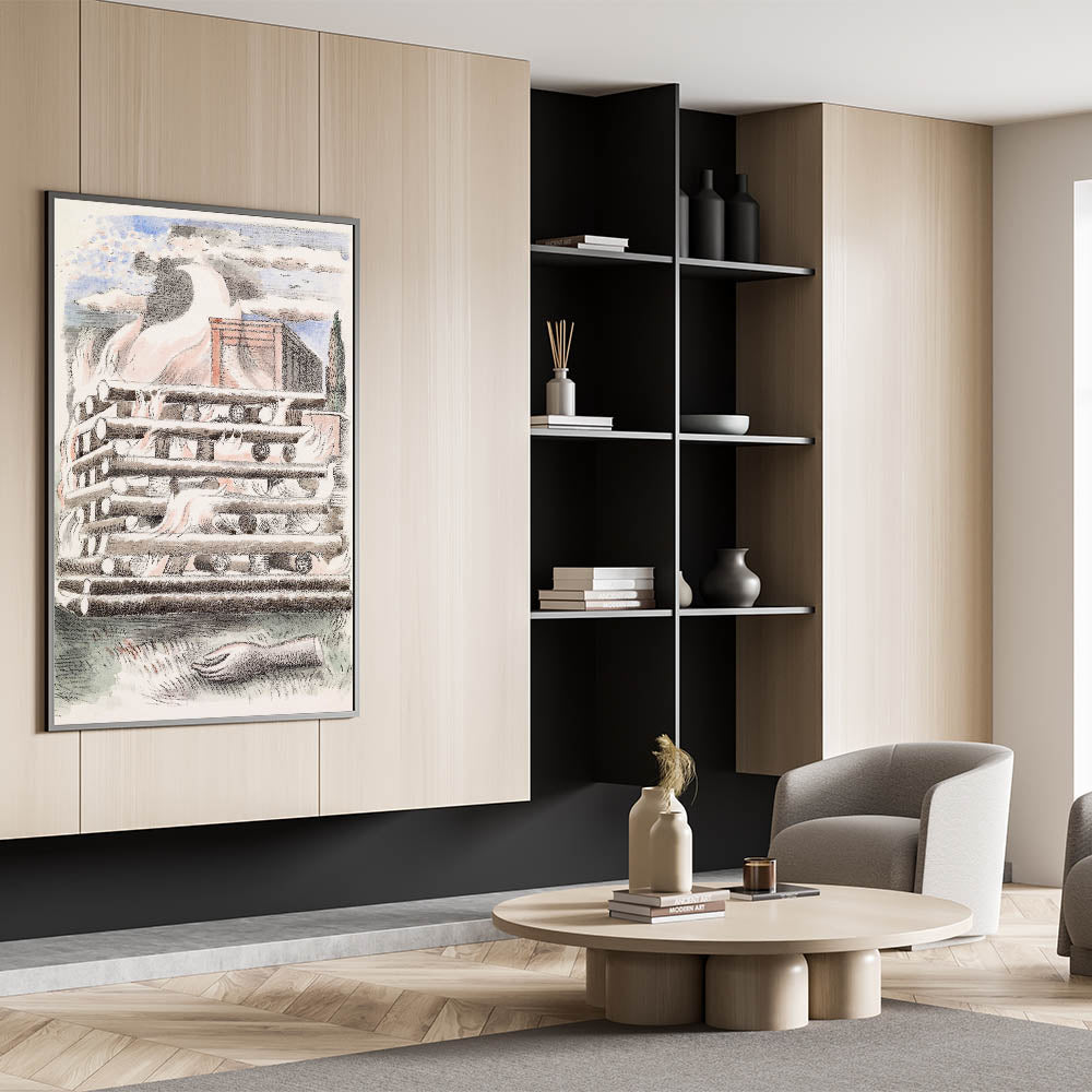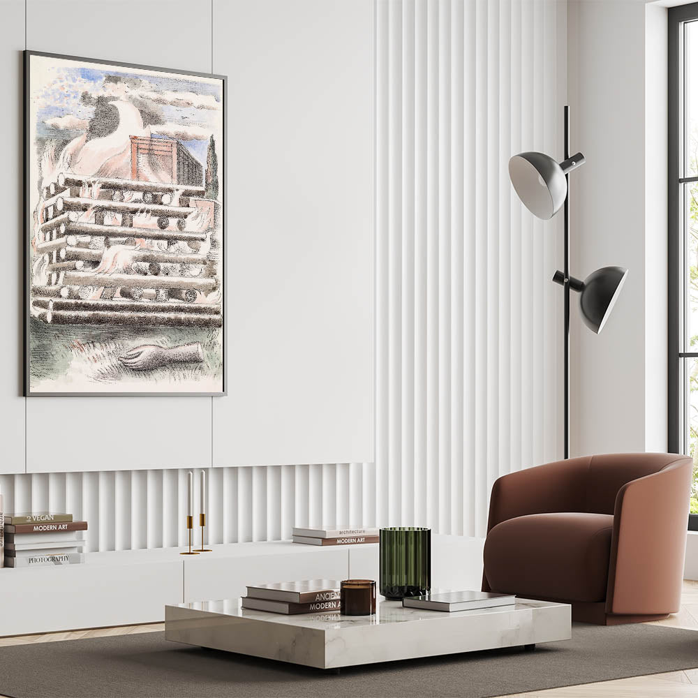 Experience the evocative artistry of Paul Nash with his 1932 illustration, Design for Urne Buriall: Funeral Pyre. This piece captures the ethereal and profound themes of life and transition, blending surrealist and modernist influences. Nash’s delicate use of pastel tones and intricate linework creates a dreamlike composition, making this artwork a contemplative addition to any space.