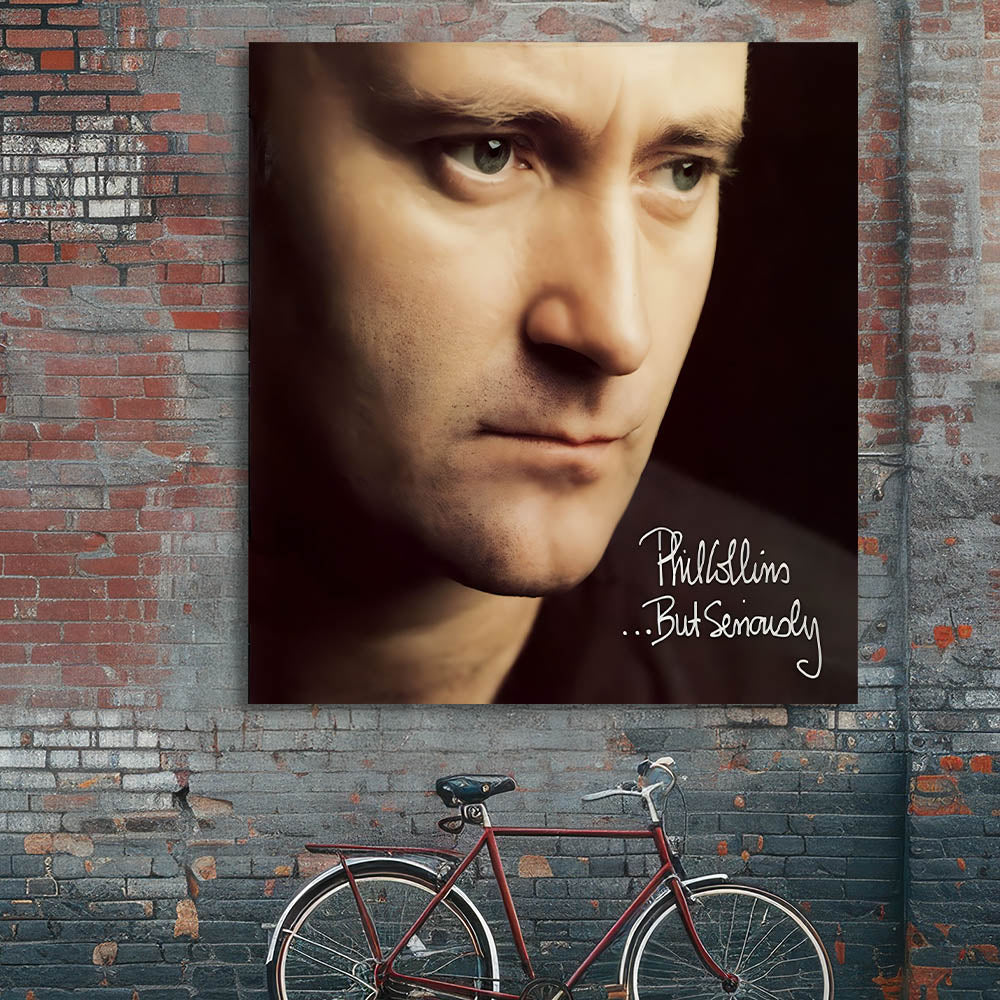Celebrate the timeless sound of Phil Collins with this ...But Seriously retro wall art featuring the iconic album cover. The close-up portrait captures the intensity and sincerity of the artist, making it a powerful addition to any music lover's collection. With its minimalist design and subtle tones, this piece brings a sense of elegance and nostalgia to any room.