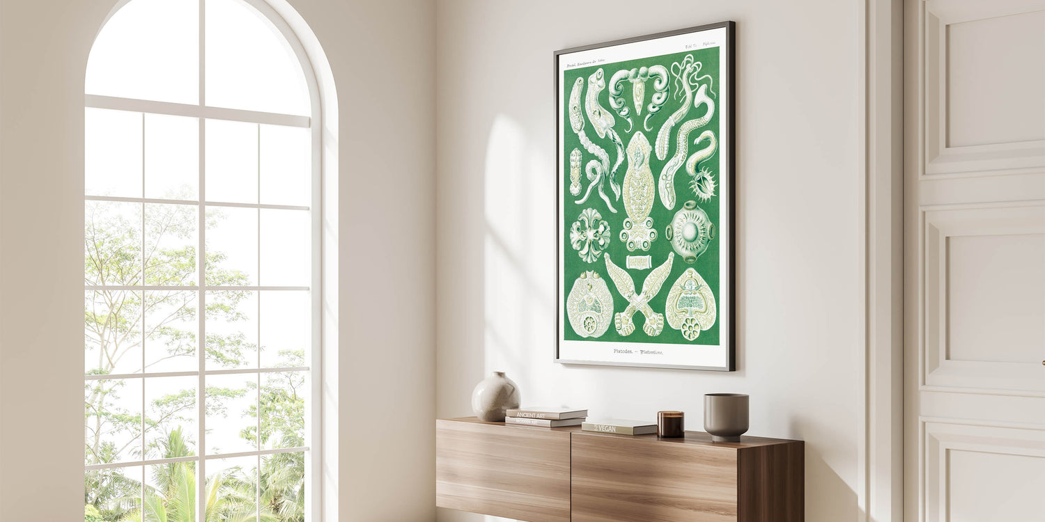 Transform your space with the intricate beauty of "Platodes Modern Wall Art" by Ernst Haeckel. This stunning illustration, taken from Kunstformen der Natur (Art Forms in Nature), showcases the mesmerizing structures of flatworms with a detailed and scientific aesthetic. The artwork's vibrant green backdrop and delicate white detailing create a timeless and elegant addition to modern decor, perfect for those inspired by natural history and unique design.