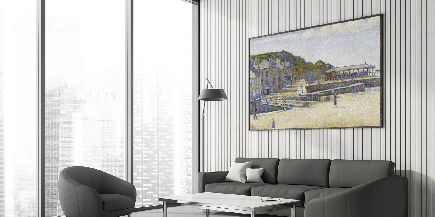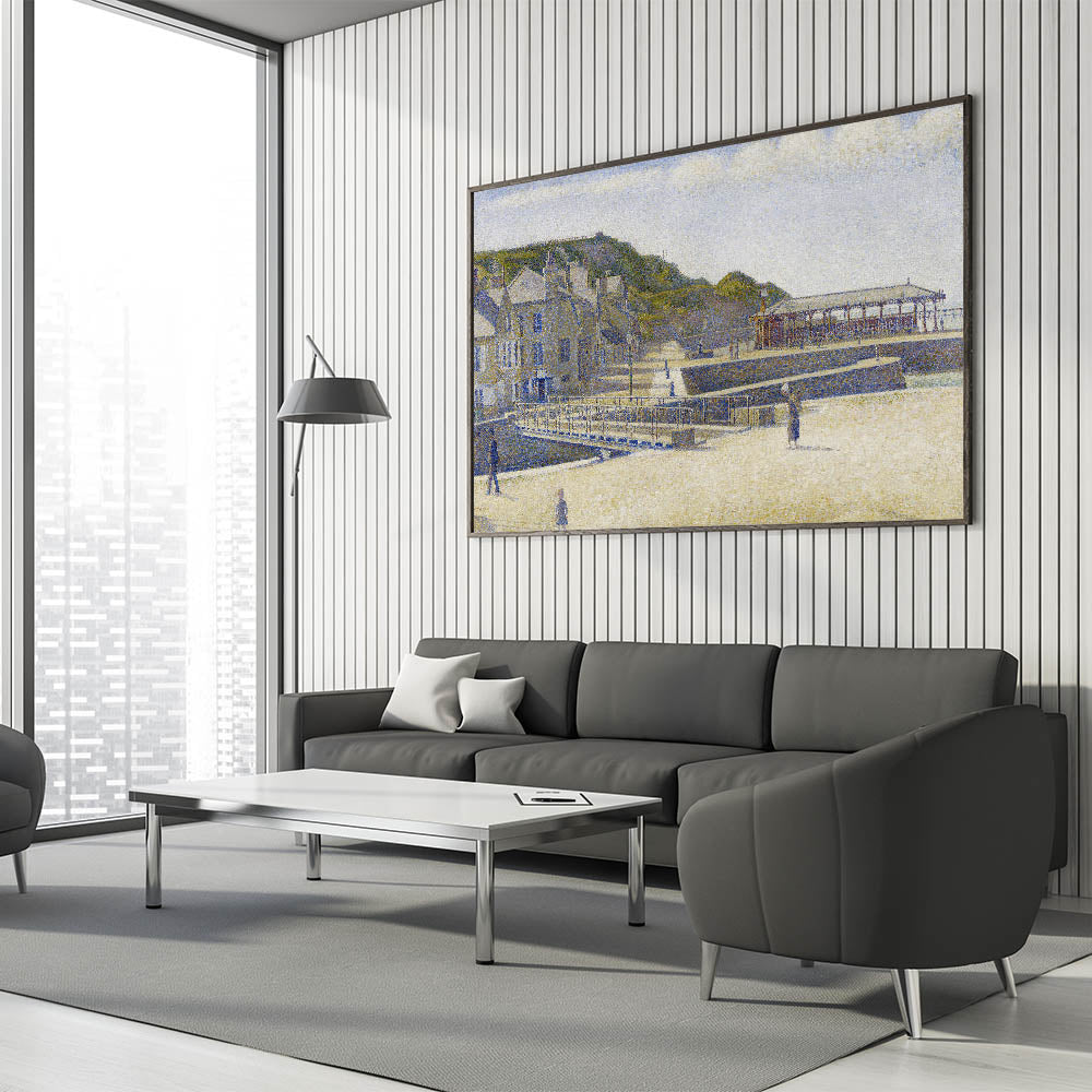 The artwork’s mix of light blues, soft whites, and earthy tones transports you to a tranquil seaside town. This piece beautifully combines Seurat’s Impressionist style with the essence of a quiet coastal day, making it a timeless and elegant choice for any home.