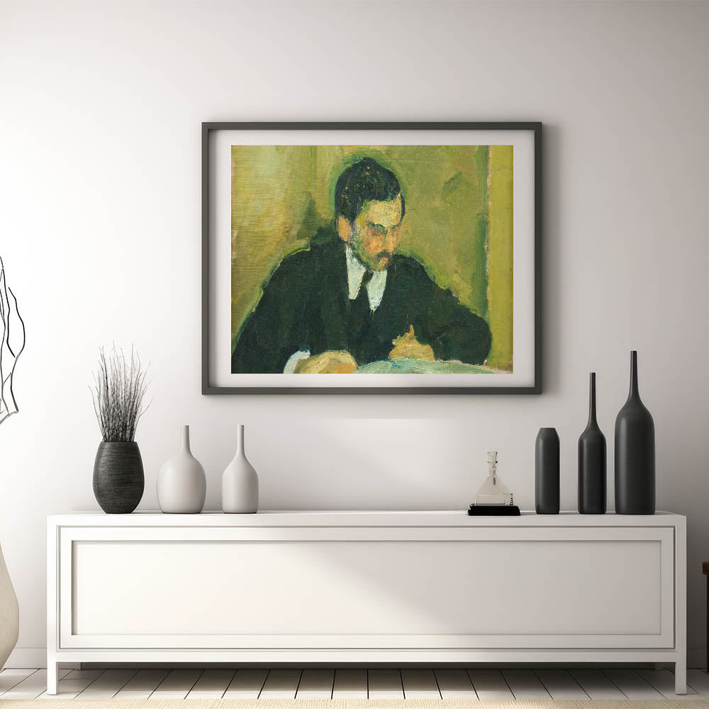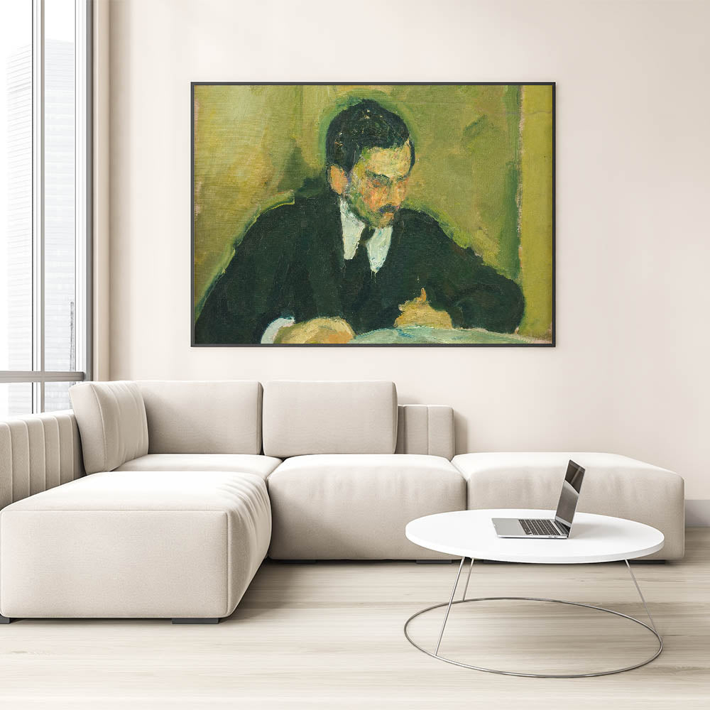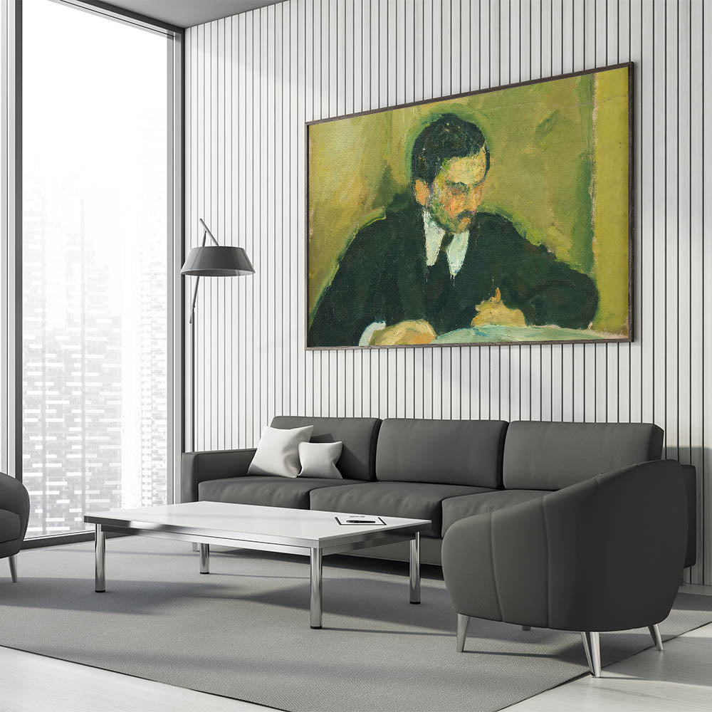 Introduce a thoughtful ambiance to your decor with "Portrait of a Man Reading," an abstract interpretation that captures a serene moment of study. This modern wall art features earthy green and yellow tones, emphasizing a tranquil and introspective atmosphere. Ideal for minimalist modern decor, this piece adds depth and a sense of quiet sophistication to any room, making it an excellent choice for contemporary art enthusiasts.