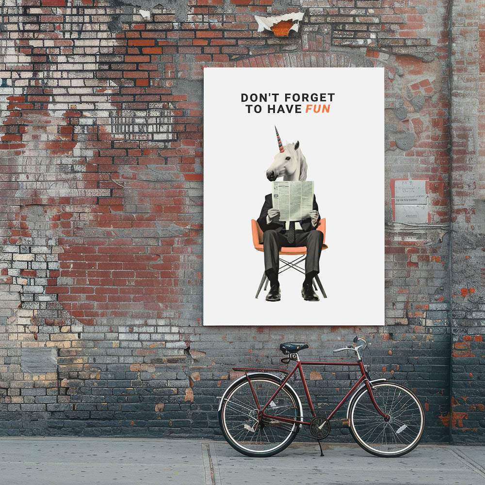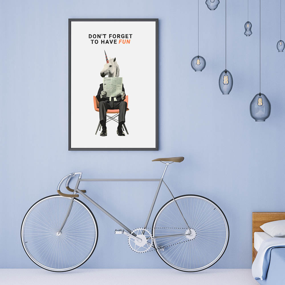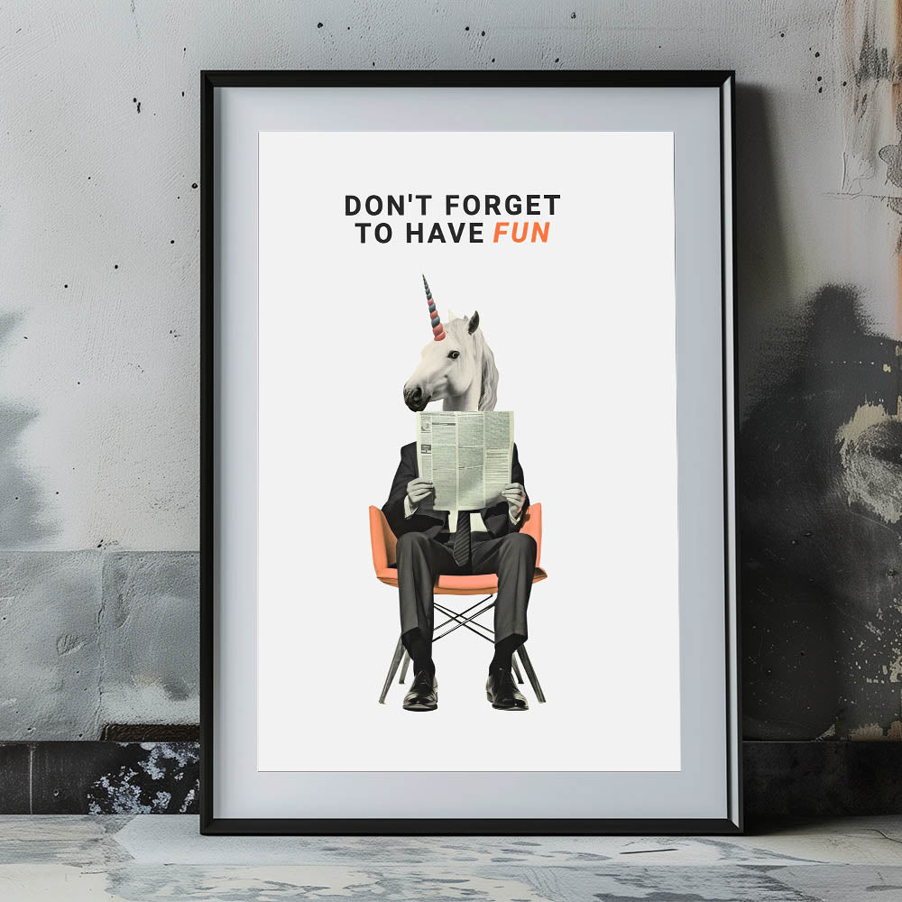 Add a splash of whimsy to your space with this Quirky Unicorn Wall Art, featuring a suit-clad unicorn reading a newspaper beneath the bold typography "DON'T FORGET TO HAVE FUN." This retro-inspired print combines surreal humor with a minimalist design, making it a standout piece for modern and vintage decor alike. The use of black, white, and a pop of orange adds contrast and charm, perfect for those who appreciate playful and thought-provoking art.