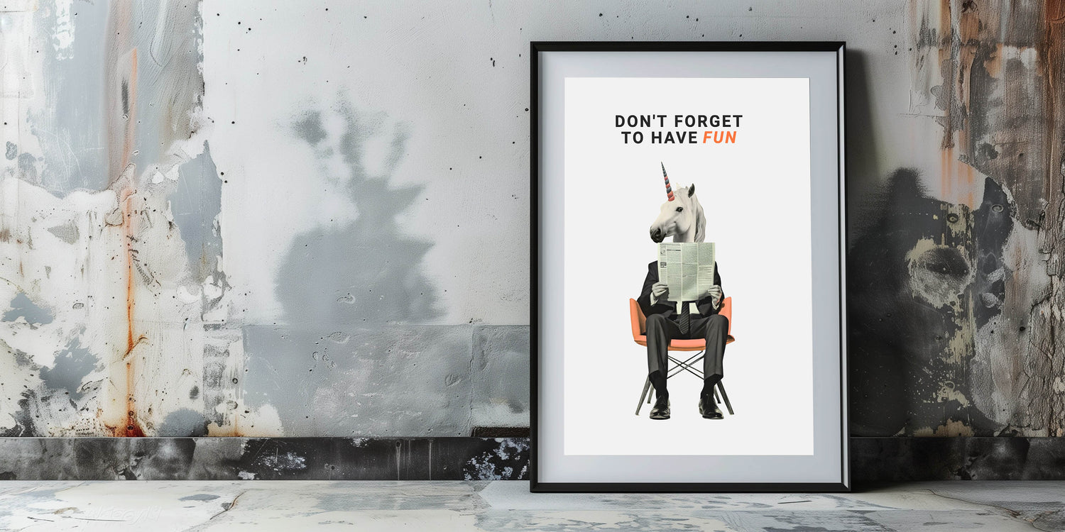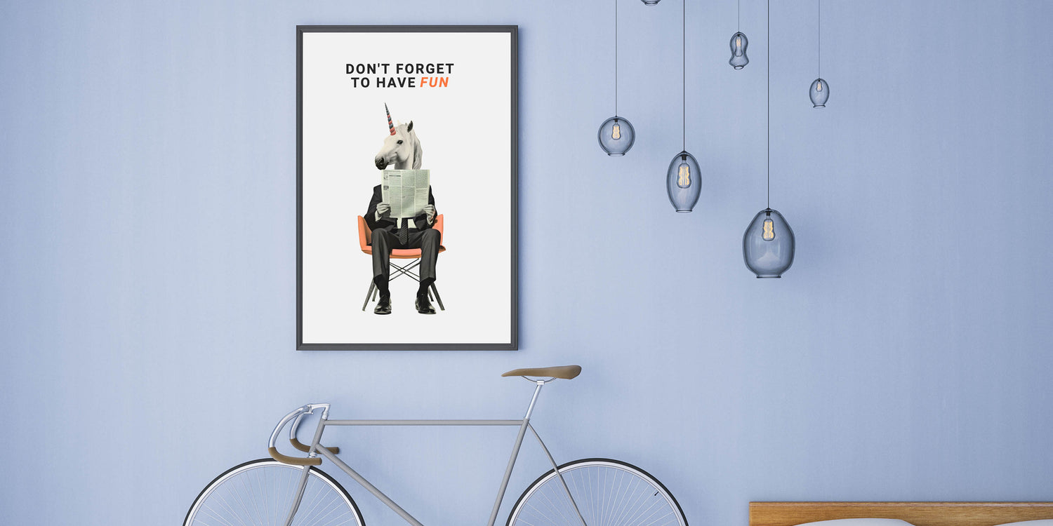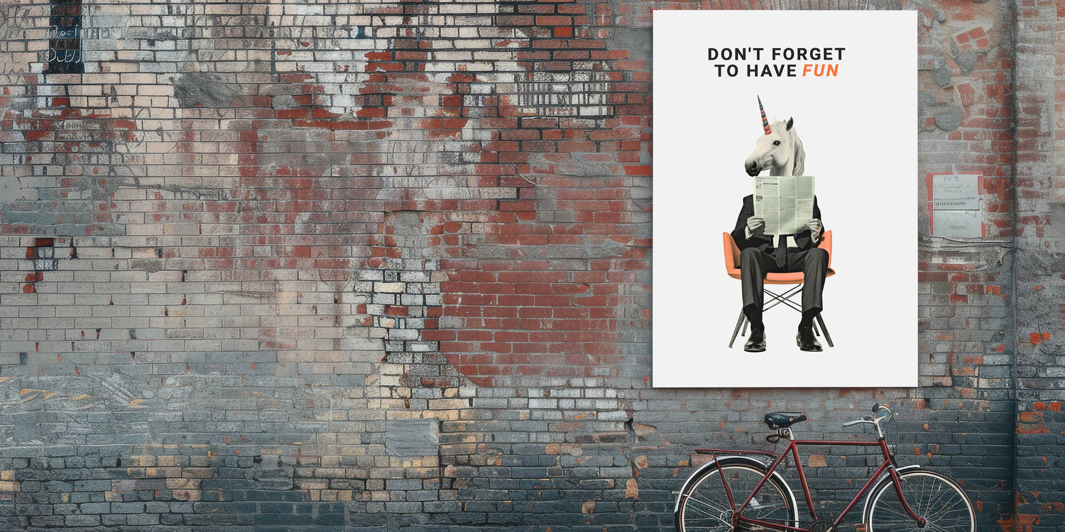 Add a splash of whimsy to your space with this Quirky Unicorn Wall Art, featuring a suit-clad unicorn reading a newspaper beneath the bold typography "DON'T FORGET TO HAVE FUN." This retro-inspired print combines surreal humor with a minimalist design, making it a standout piece for modern and vintage decor alike. The use of black, white, and a pop of orange adds contrast and charm, perfect for those who appreciate playful and thought-provoking art.