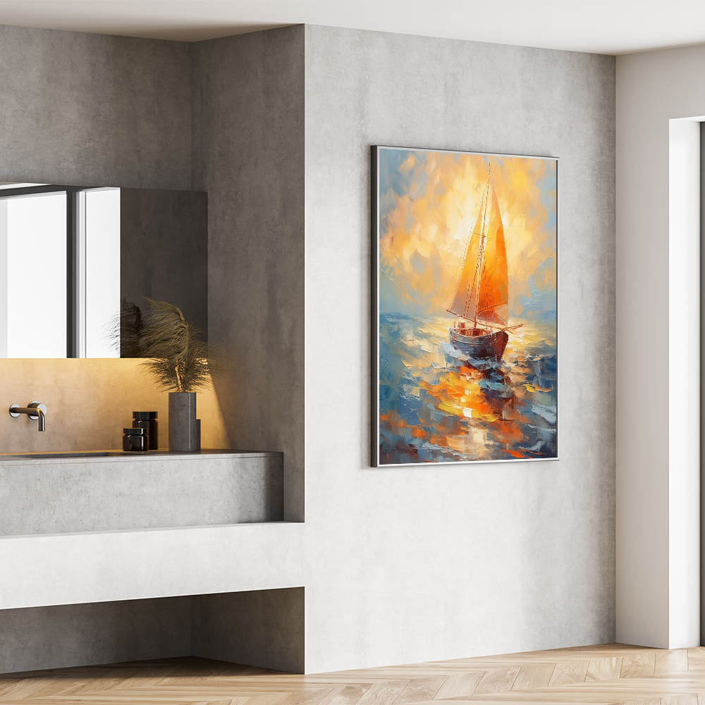 This artwork is ideal for nautical-themed spaces or for those who love serene, ocean-inspired décor. Whether hung in a living room, office, or bedroom, the rich tones of sunset orange, gold, and blue will infuse your space with warmth and a peaceful, coastal ambiance.