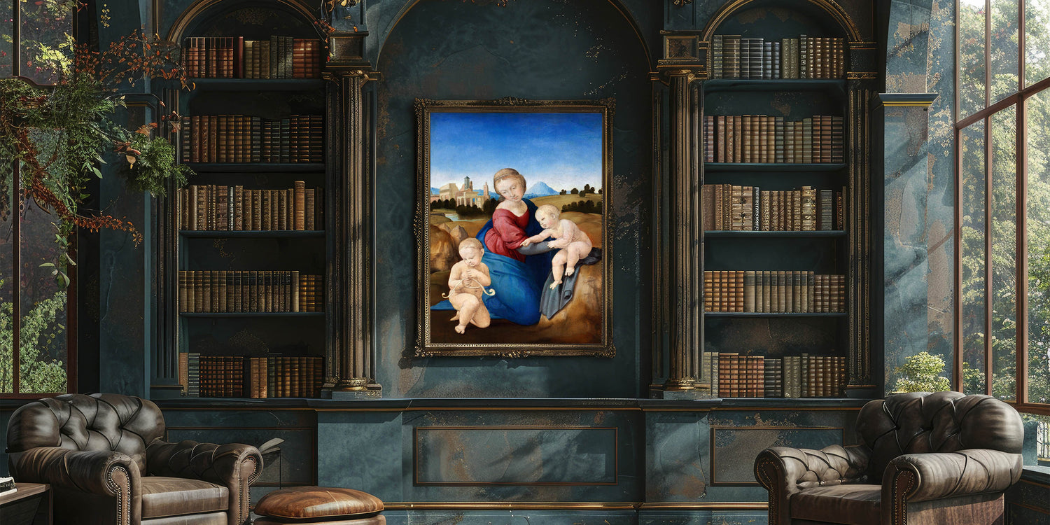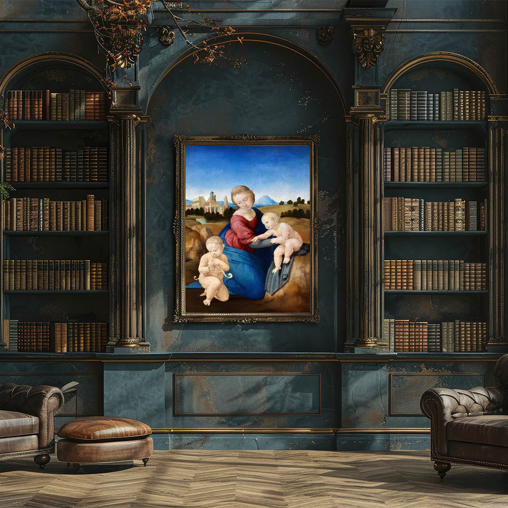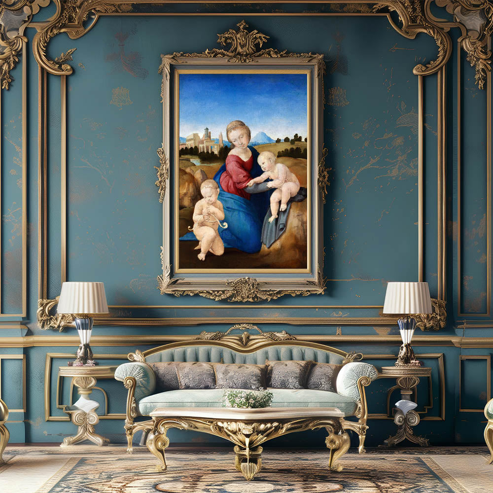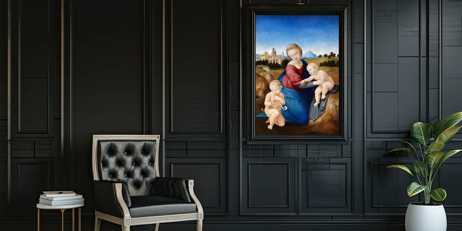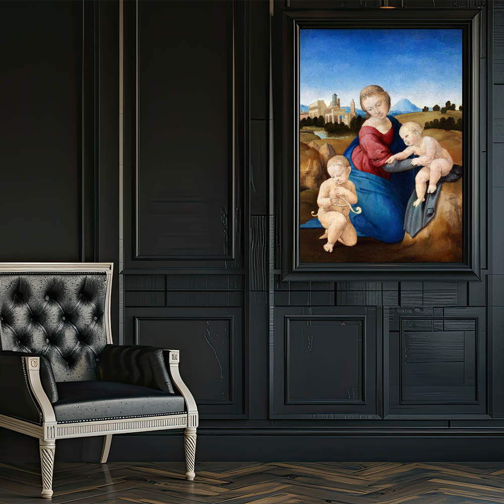 Immerse yourself in the tender beauty of Raphael’s Madonna and Child with the Infant Saint John (1508). This celebrated Renaissance masterpiece captures a serene moment between the Virgin Mary, Christ Child, and Saint John the Baptist, symbolizing innocence, faith, and divine love. The tranquil landscape in the background further enhances the composition's harmony and depth.