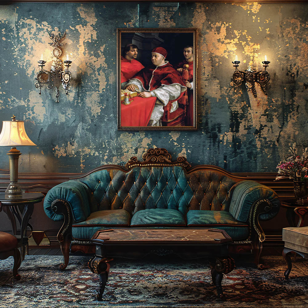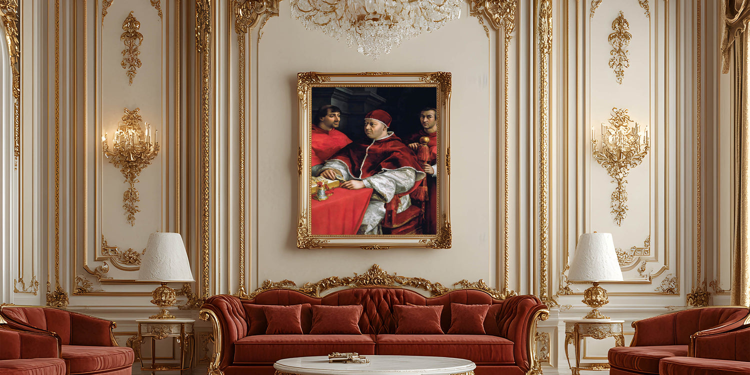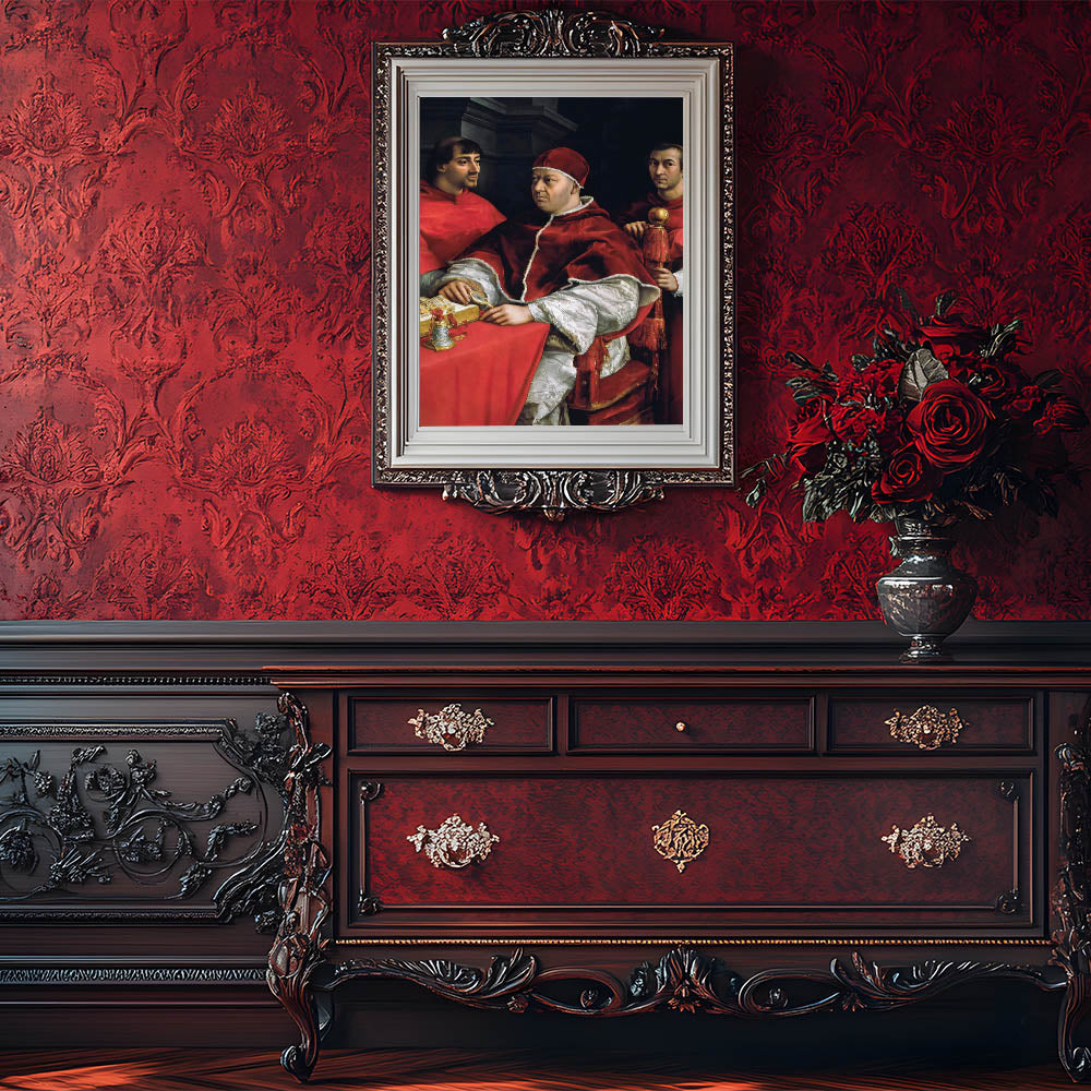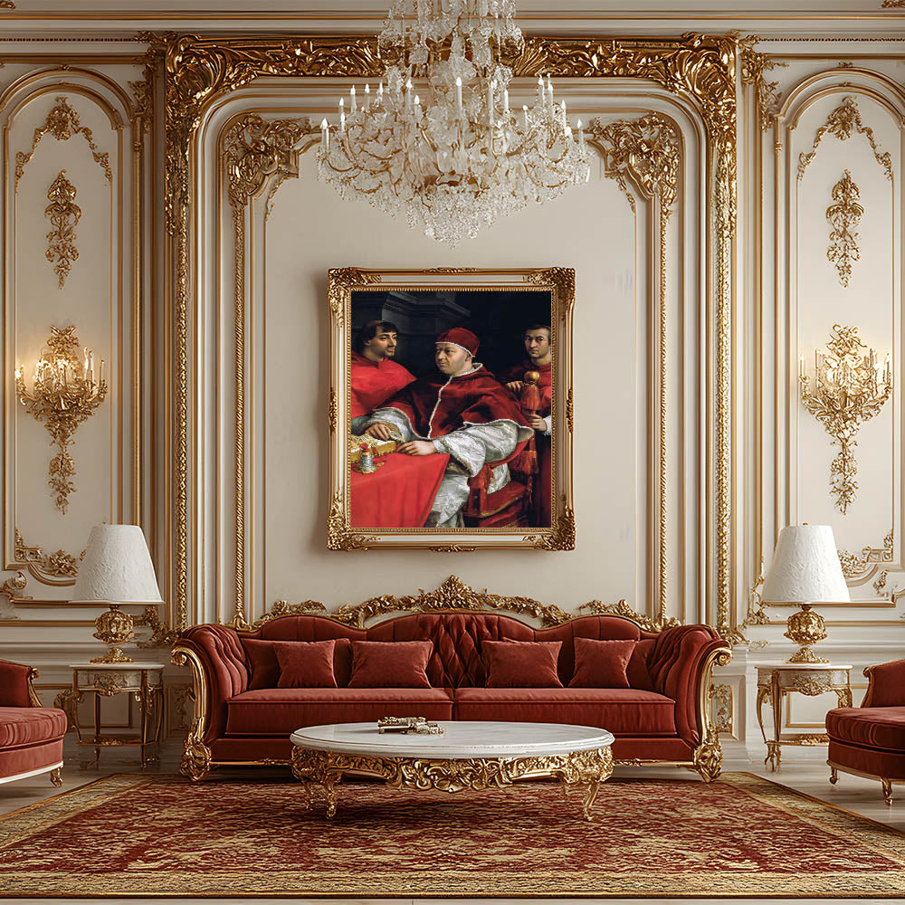 This painting embodies the richness of Renaissance portraiture, making it a centerpiece of refinement for your art collection. Its vivid depiction of Pope Leo X and his cardinals is a tribute to the golden age of cultural and artistic achievement.