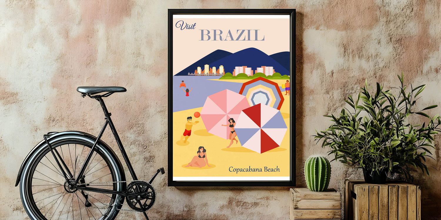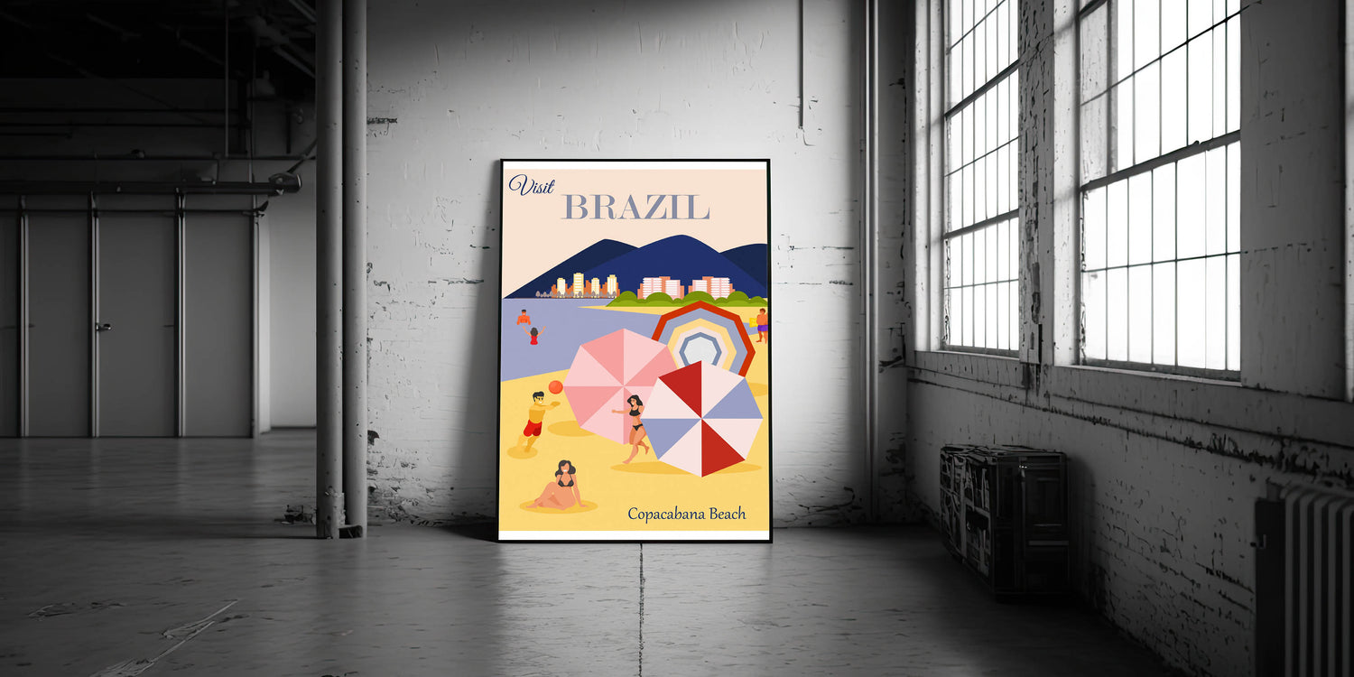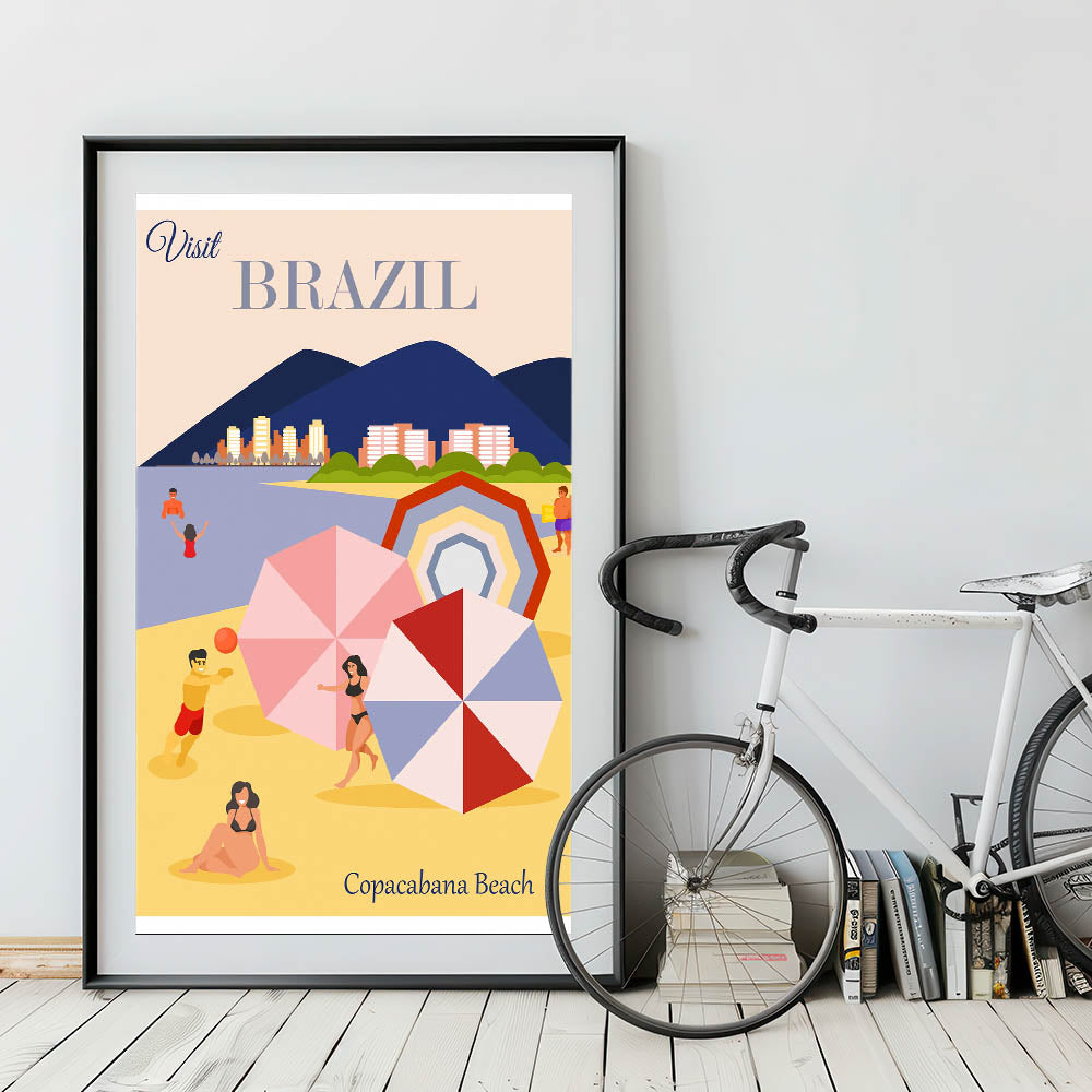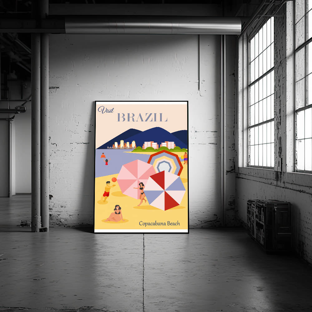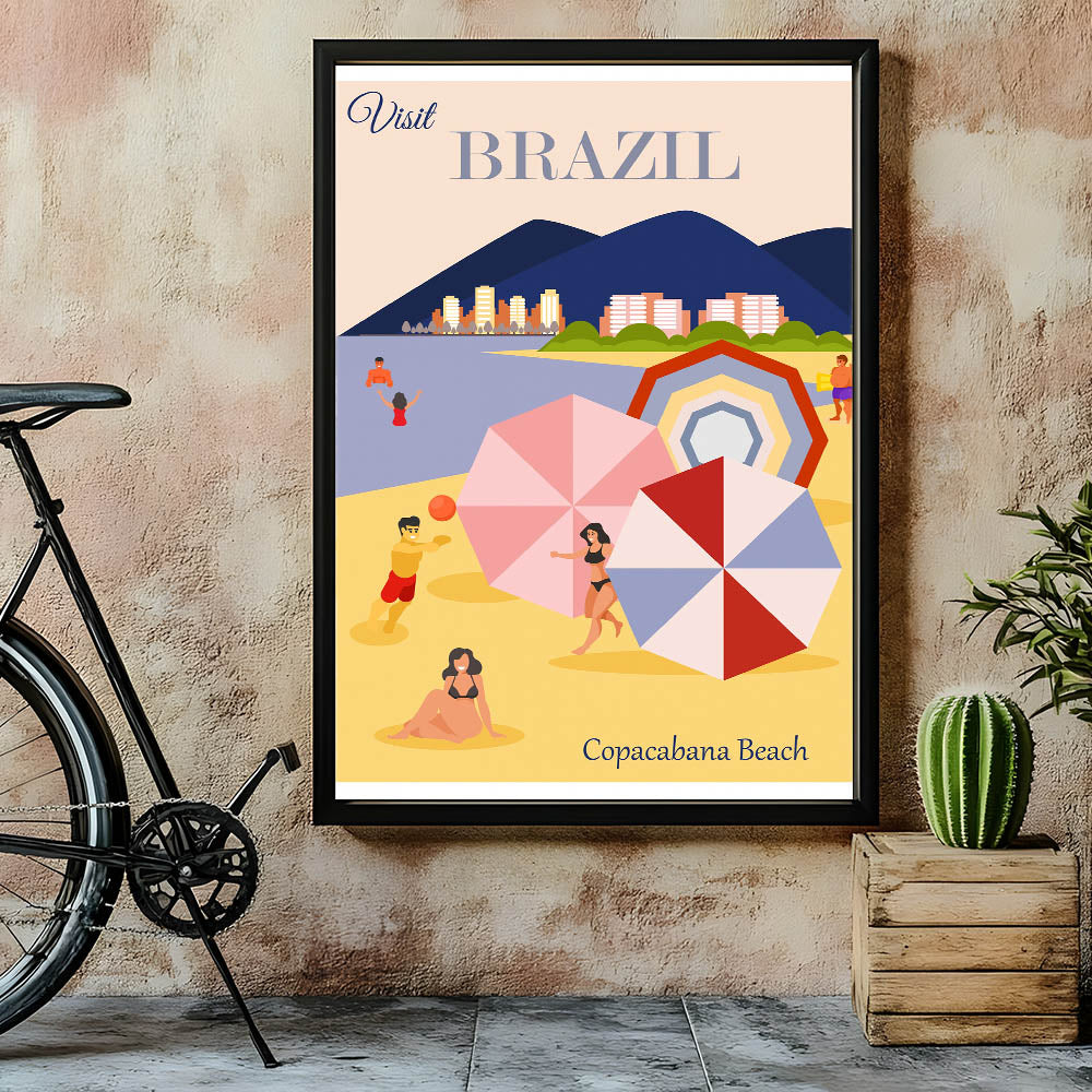Capture the vibrant energy of Brazil with this Retro Brazil Travel Poster featuring Copacabana Beach. This vintage print showcases a lively beach scene with colorful umbrellas, sunbathers, and the iconic backdrop of Rio’s skyline and mountains. The bold hues and nostalgic design make it a perfect addition for those who appreciate vintage decor and mid-century modern art.