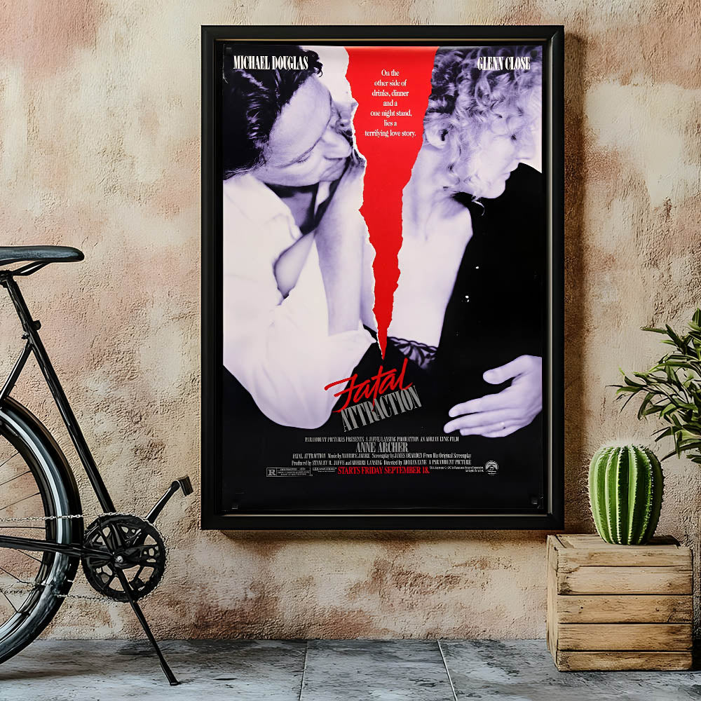 Bring the suspense and drama of 1980s cinema into your home with this Fatal Attraction retro movie poster. Featuring a striking black-and-white design with a bold red tear through the center, this vintage-style wall art perfectly captures the psychological tension of the film. Whether you're a fan of classic thrillers or looking for an eye-catching statement piece, this nostalgic design adds an intriguing touch to your home theater, office, or movie-themed decor.