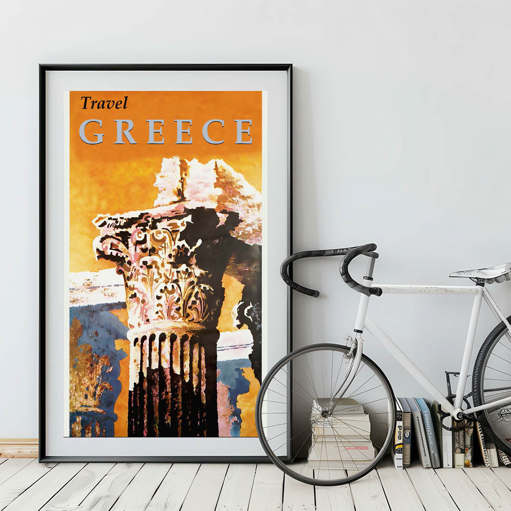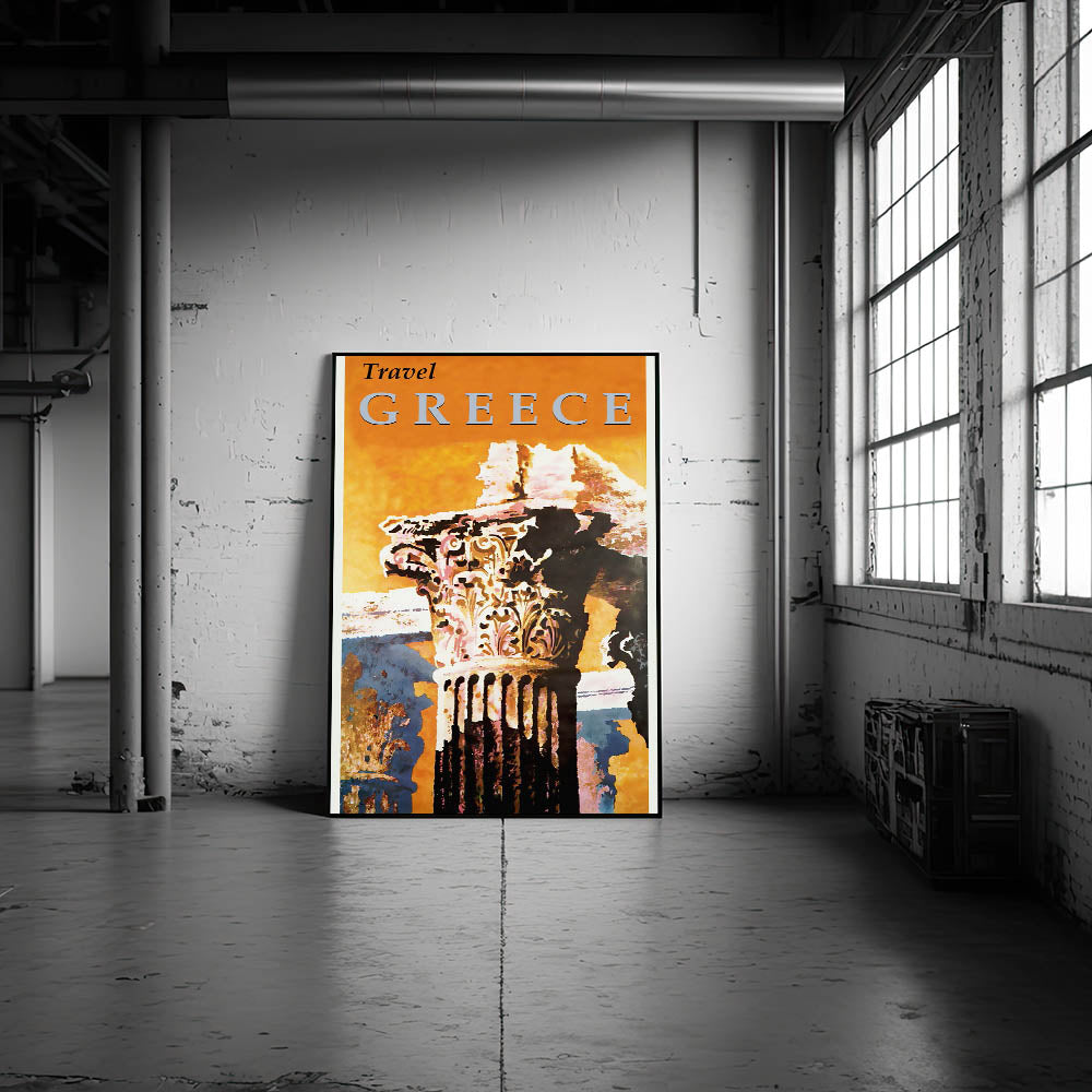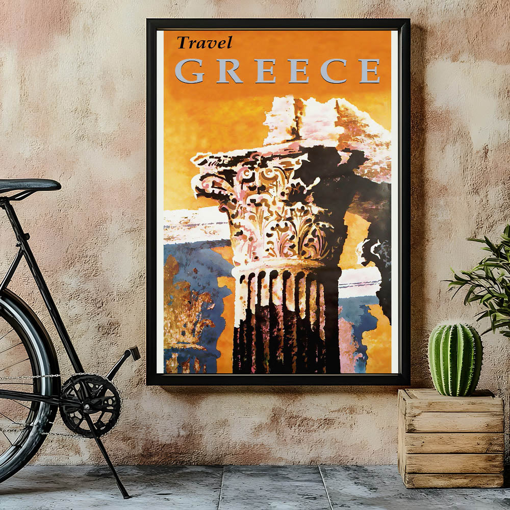 Immerse yourself in the history and beauty of Greece with this Retro Travel Poster, showcasing a stunning close-up of an ancient Greek column. The warm, earthy tones of the background highlight the intricate details of the architecture, offering a unique perspective on Greece’s timeless cultural heritage. This vintage-inspired design captures the essence of Greece’s rich history, making it perfect for those who appreciate art, history, and travel.