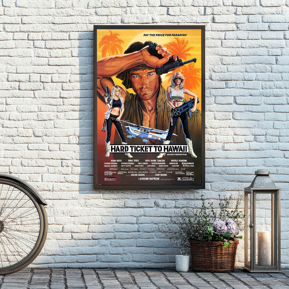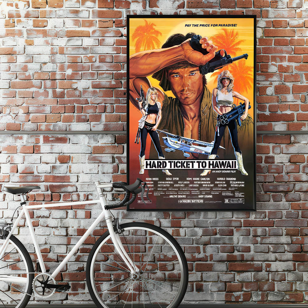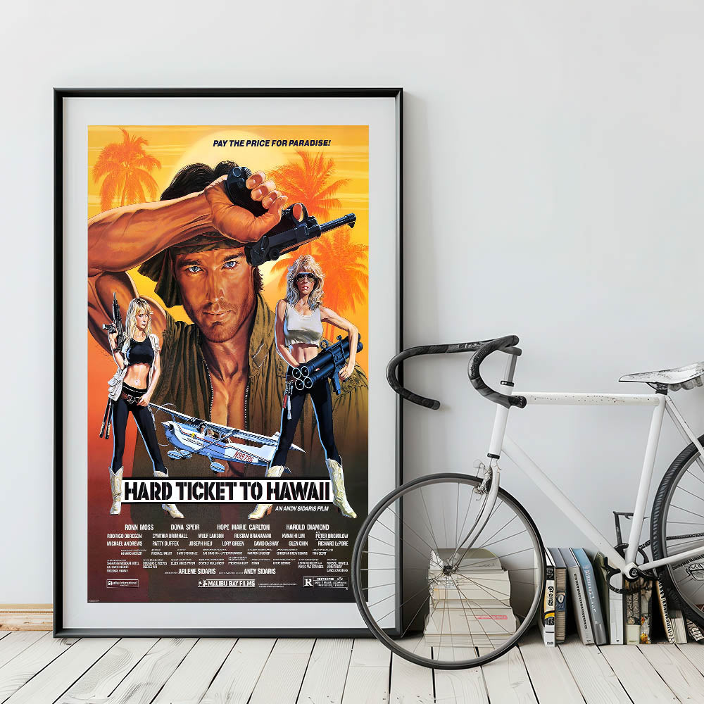 Whether you’re decorating a home theater, living room, or man cave, this Hard Ticket to Hawaii poster is sure to make a statement. Bring the spirit of adventure and action into your space today with this timeless retro print.
