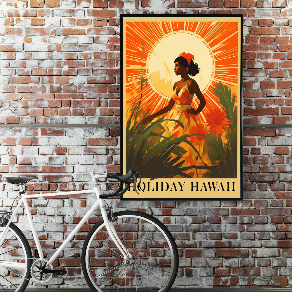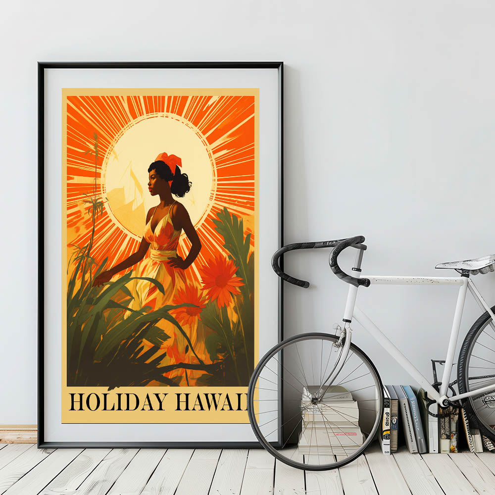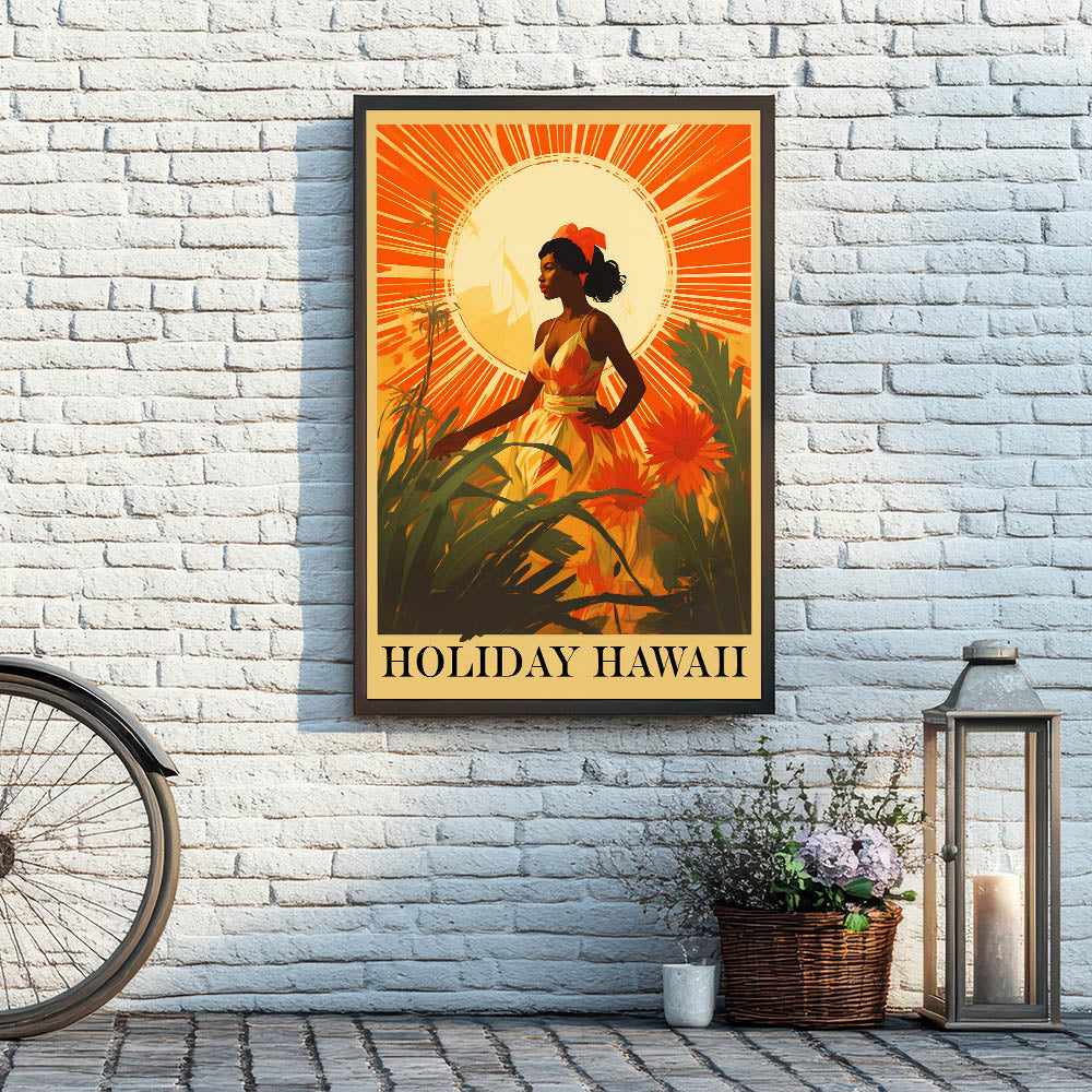 Step into the vibrant beauty of Hawaii with this Retro Travel Poster. Featuring a stunning woman amidst tropical plants, with the sun radiating behind her in brilliant orange hues, this vintage-inspired print captures the essence of a Hawaiian holiday. The dynamic colors and bold design, along with the “Holiday Hawaii” text, evoke the spirit of adventure and relaxation found on the islands. Perfect for those who cherish island life, tropical vibes, or vintage travel posters.
