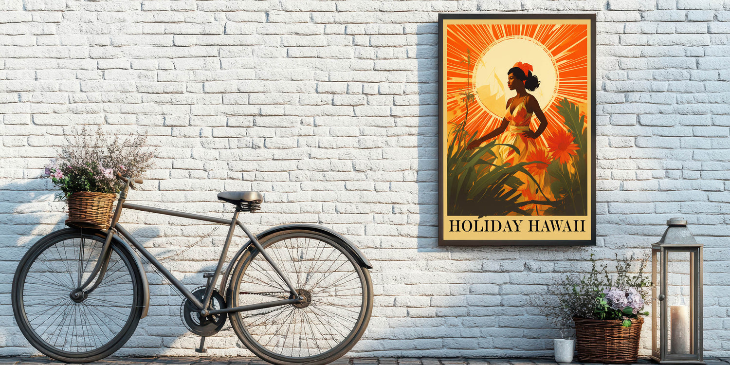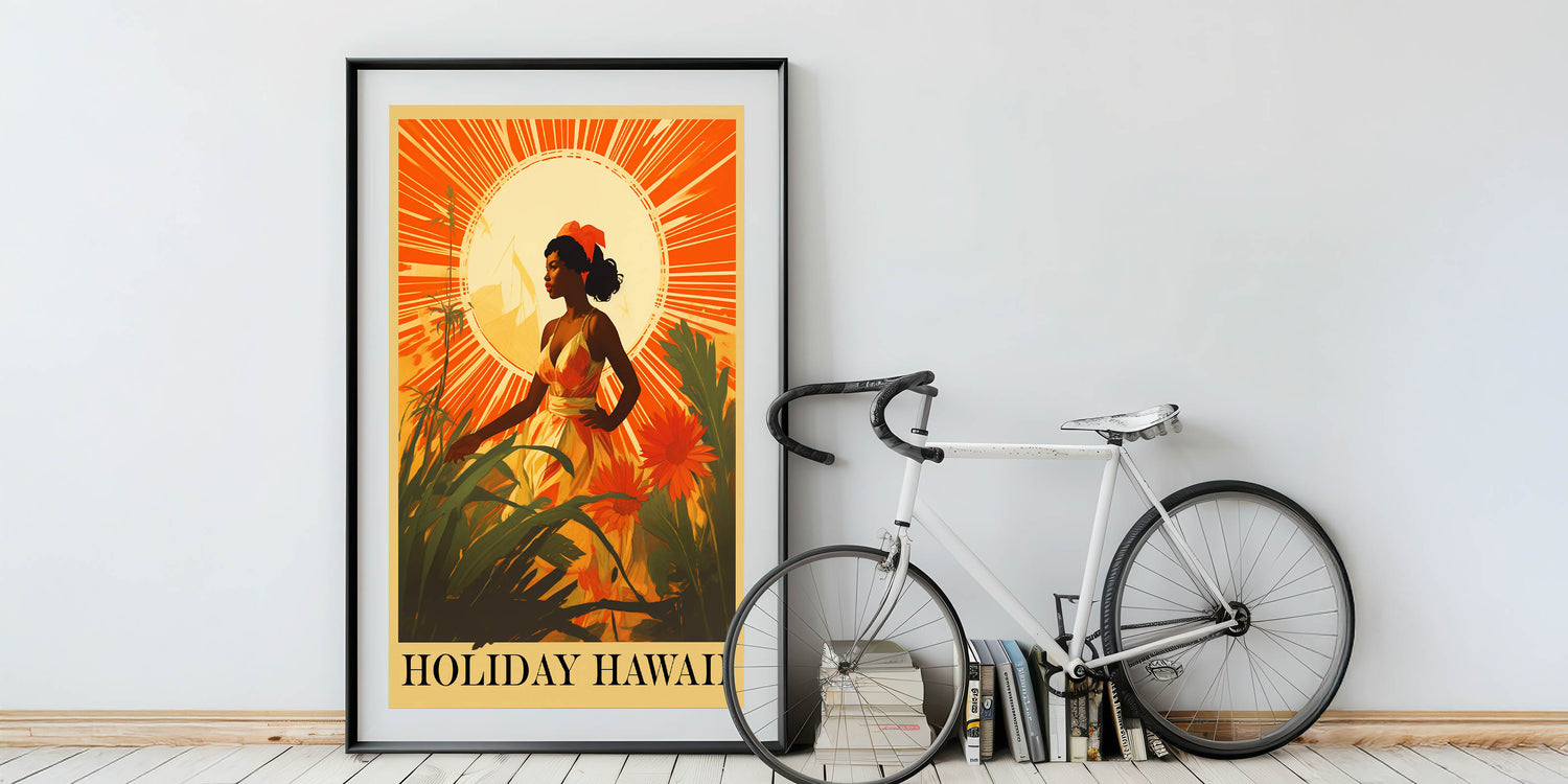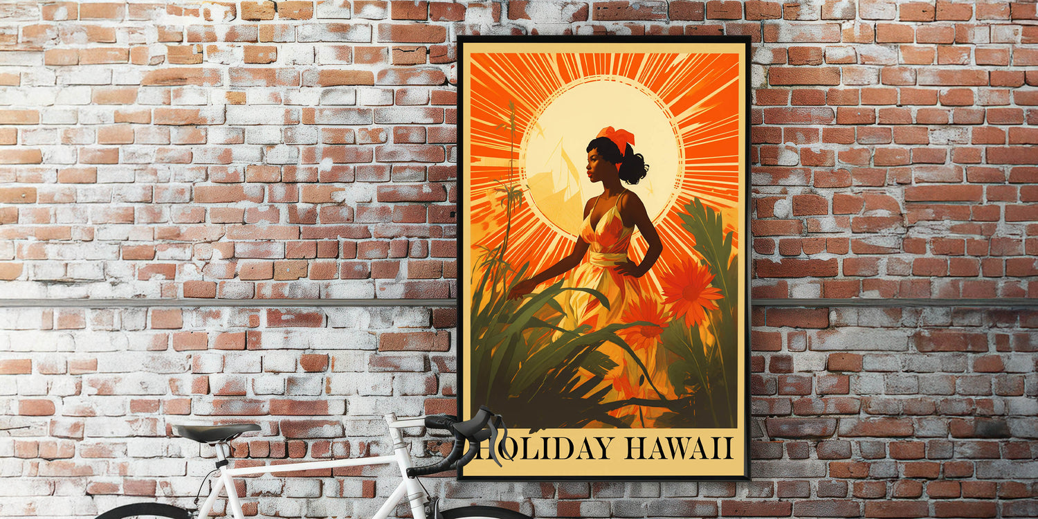 Step into the vibrant beauty of Hawaii with this Retro Travel Poster. Featuring a stunning woman amidst tropical plants, with the sun radiating behind her in brilliant orange hues, this vintage-inspired print captures the essence of a Hawaiian holiday. The dynamic colors and bold design, along with the “Holiday Hawaii” text, evoke the spirit of adventure and relaxation found on the islands. Perfect for those who cherish island life, tropical vibes, or vintage travel posters.